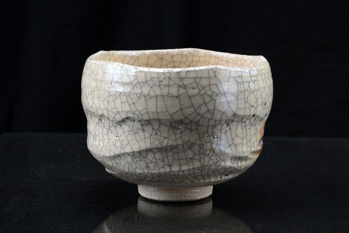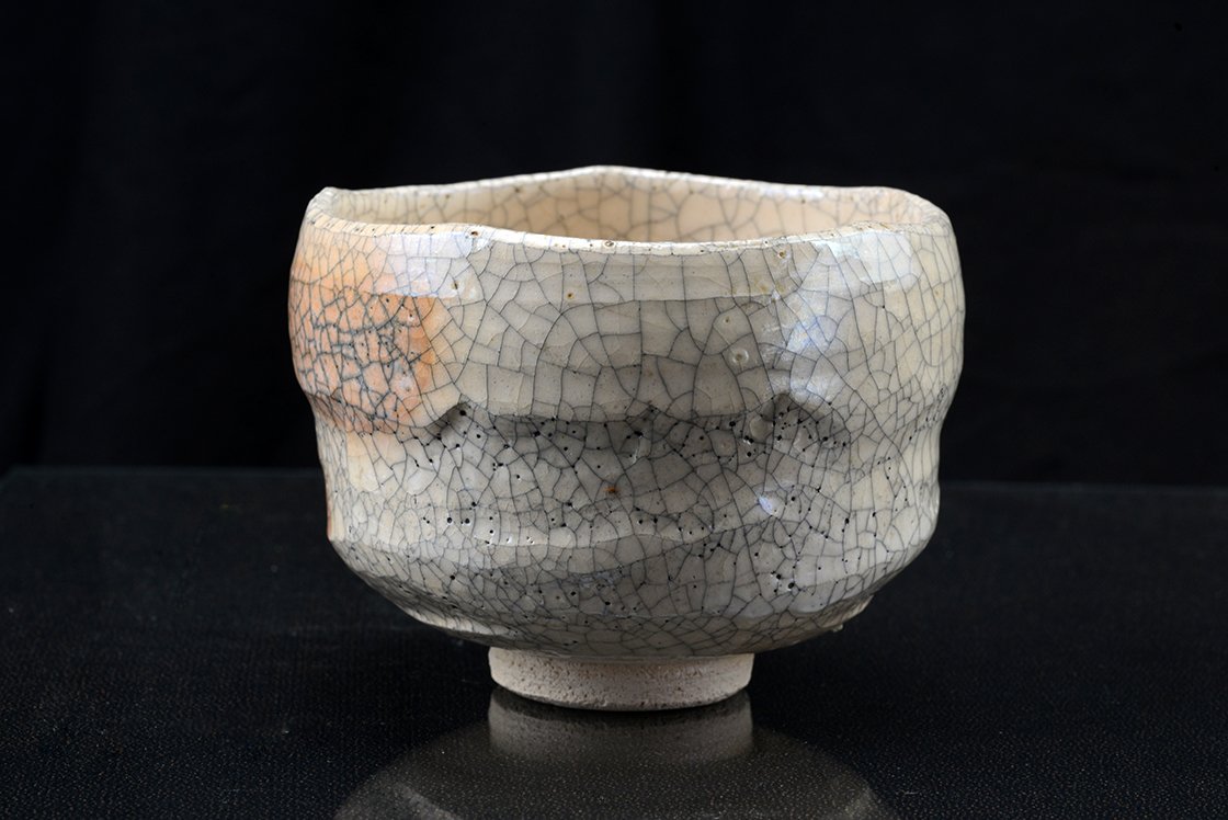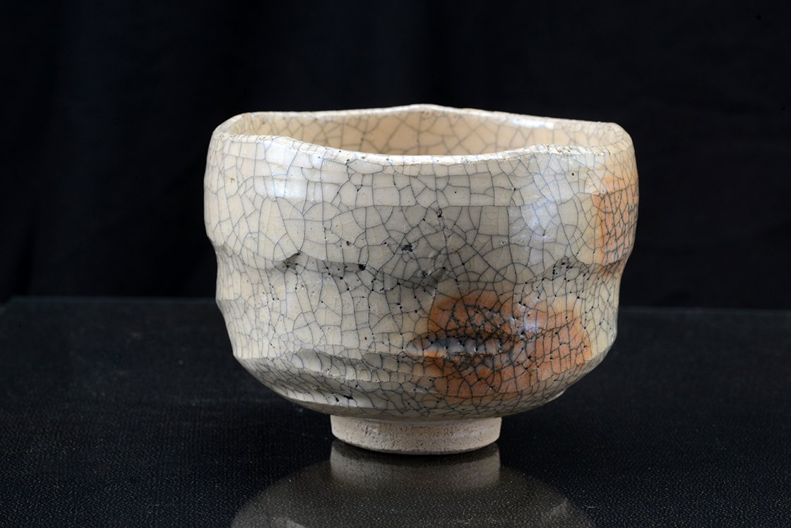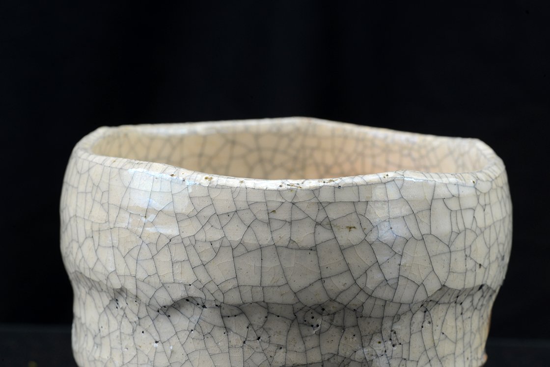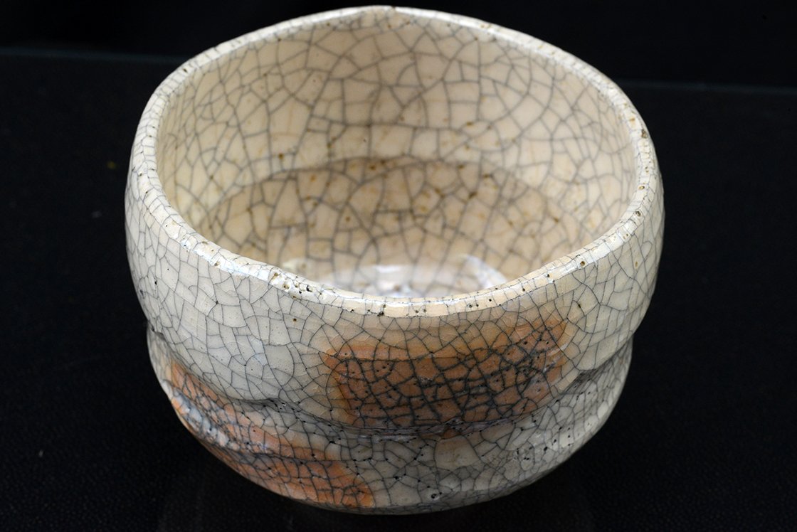 Ritka fehér raku chawan töredezett mázzal.