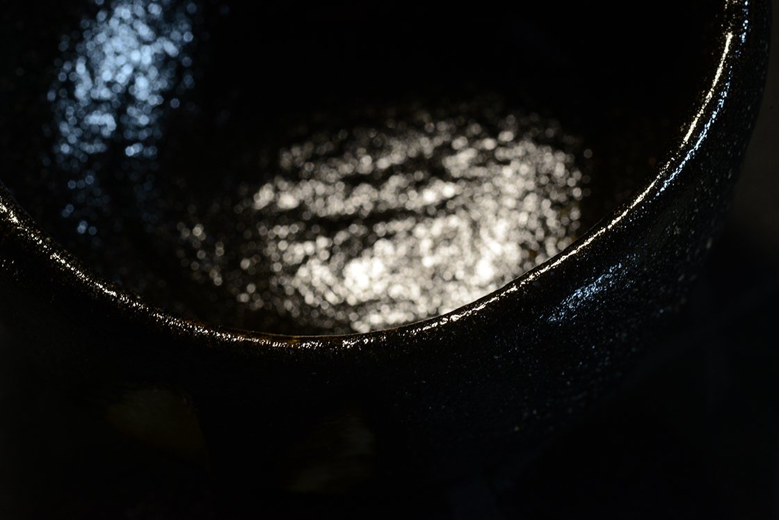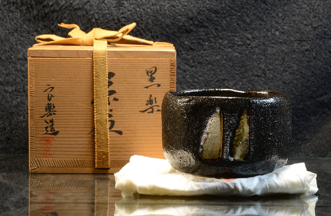 Levél díszítésű kuro raku chawan matcha teáscsésze Ryoraku Heian műhelyéből.