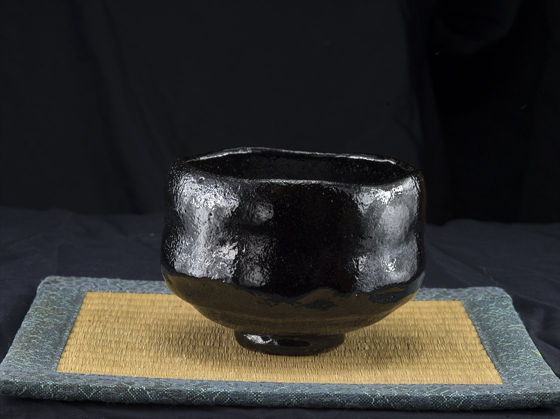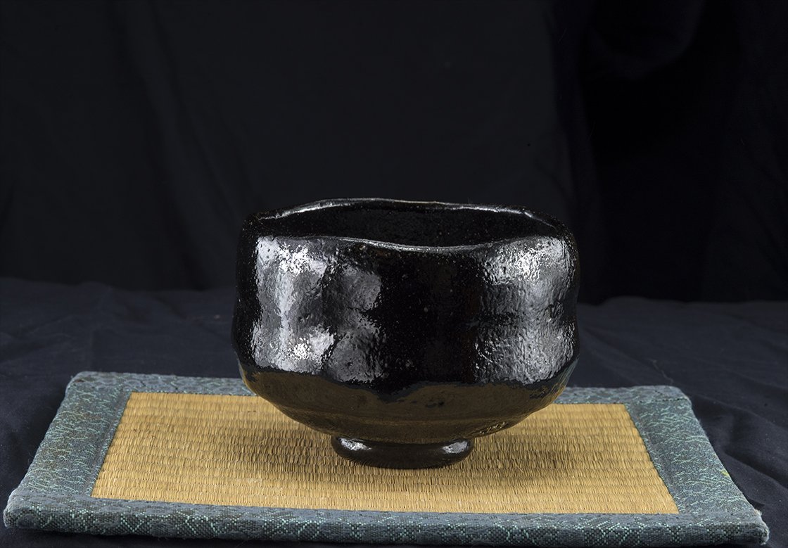 12 cm átmérőjű, 8 cm magas fekete raku csésze Kugyo Ono műhelyéből.