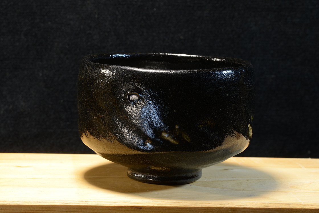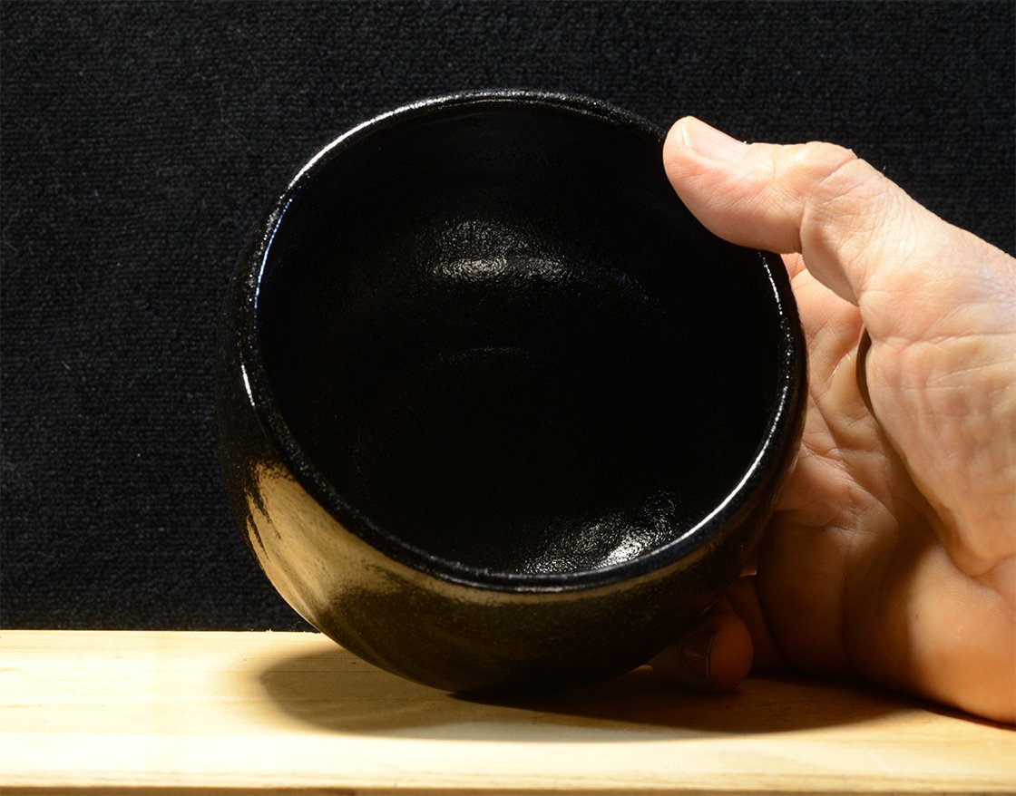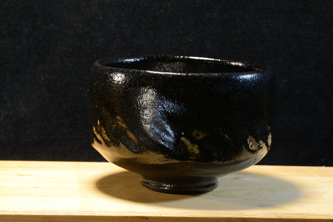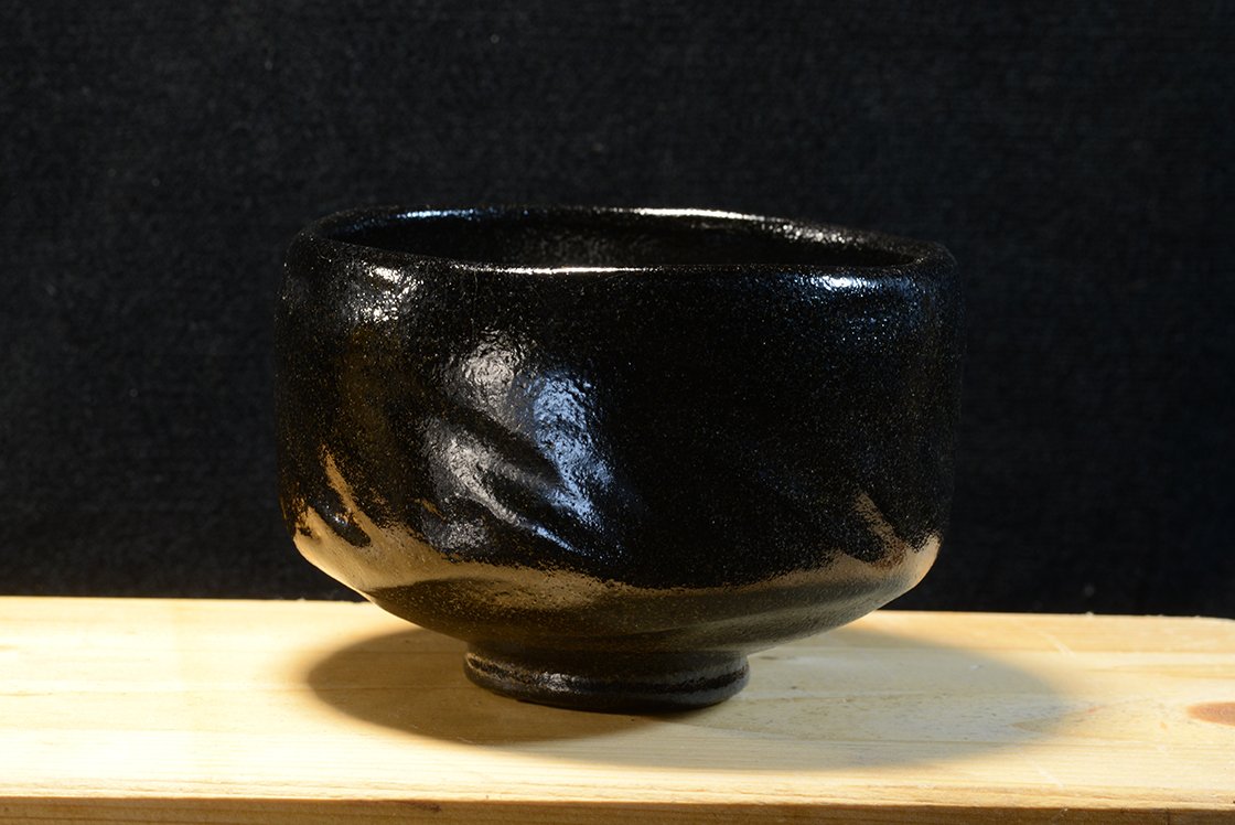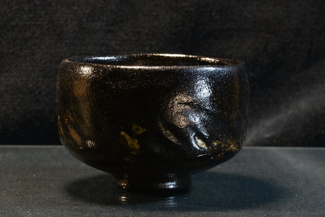 12 cm átmérőjű, 8,3 cm magas kuro raku chawan Eiraku Heian műhelyéből. A csésze barázdáiban világos foltok növeli a csésze mélyfekete kontrasztját.