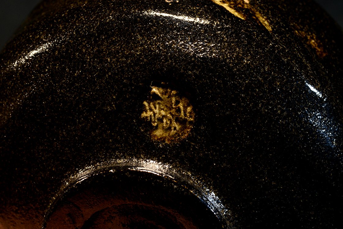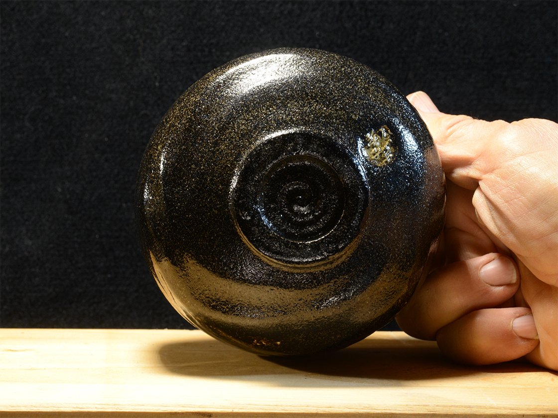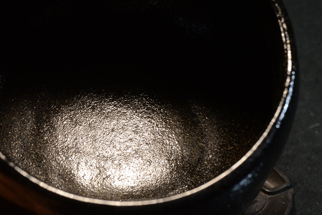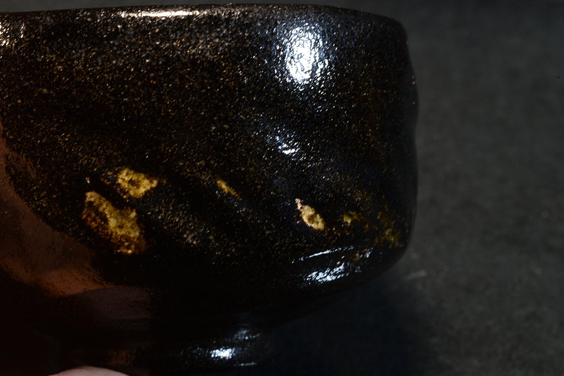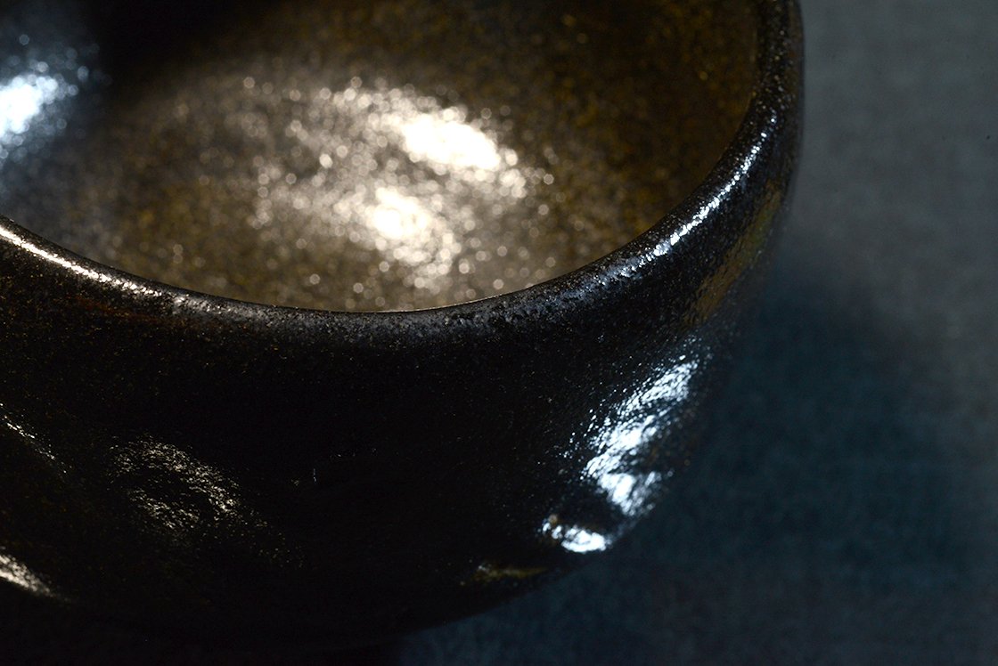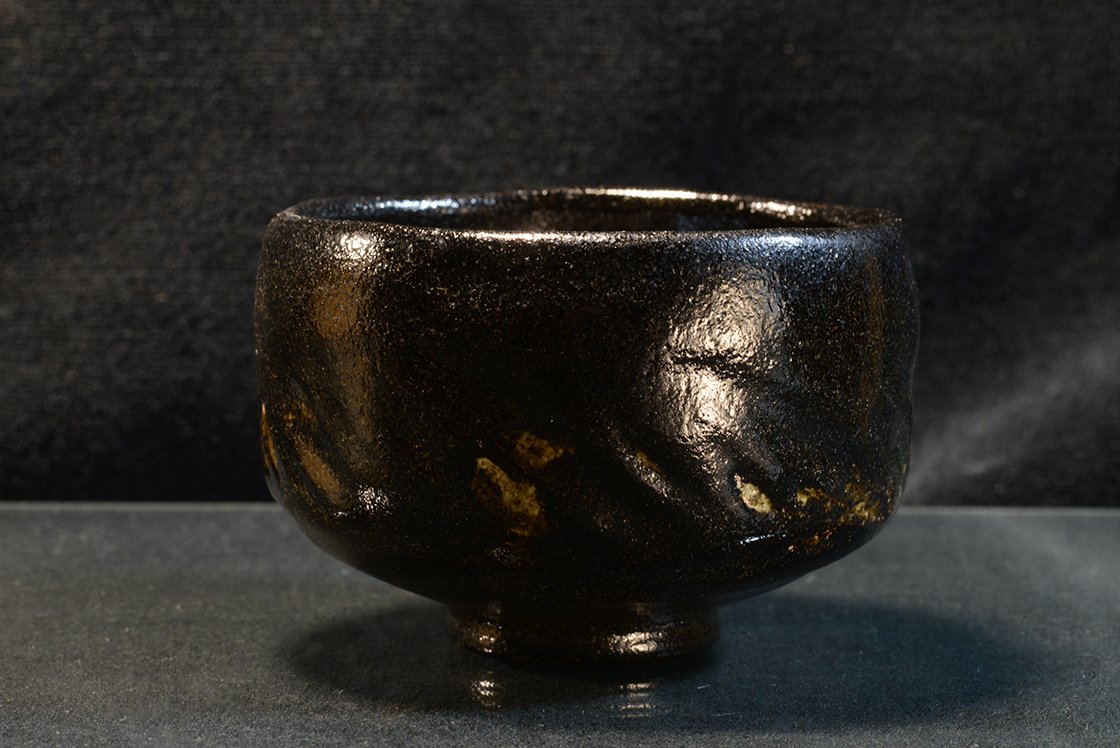 12 cm átmérőjű, 8,3 cm magas kuro raku chawan Eiraku Heian műhelyéből. A csésze barázdáiban világos foltok növeli a csésze mélyfekete kontrasztját.