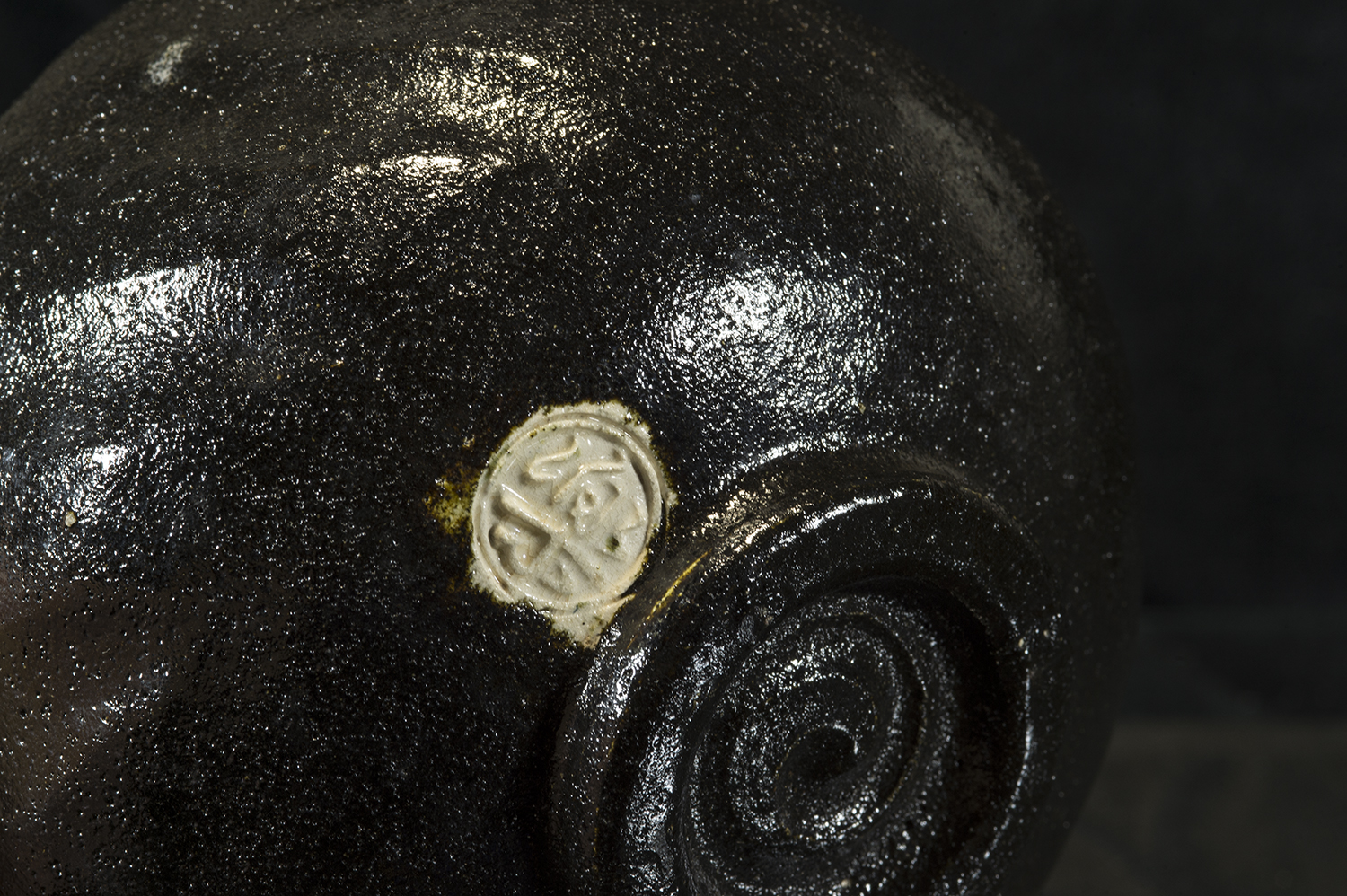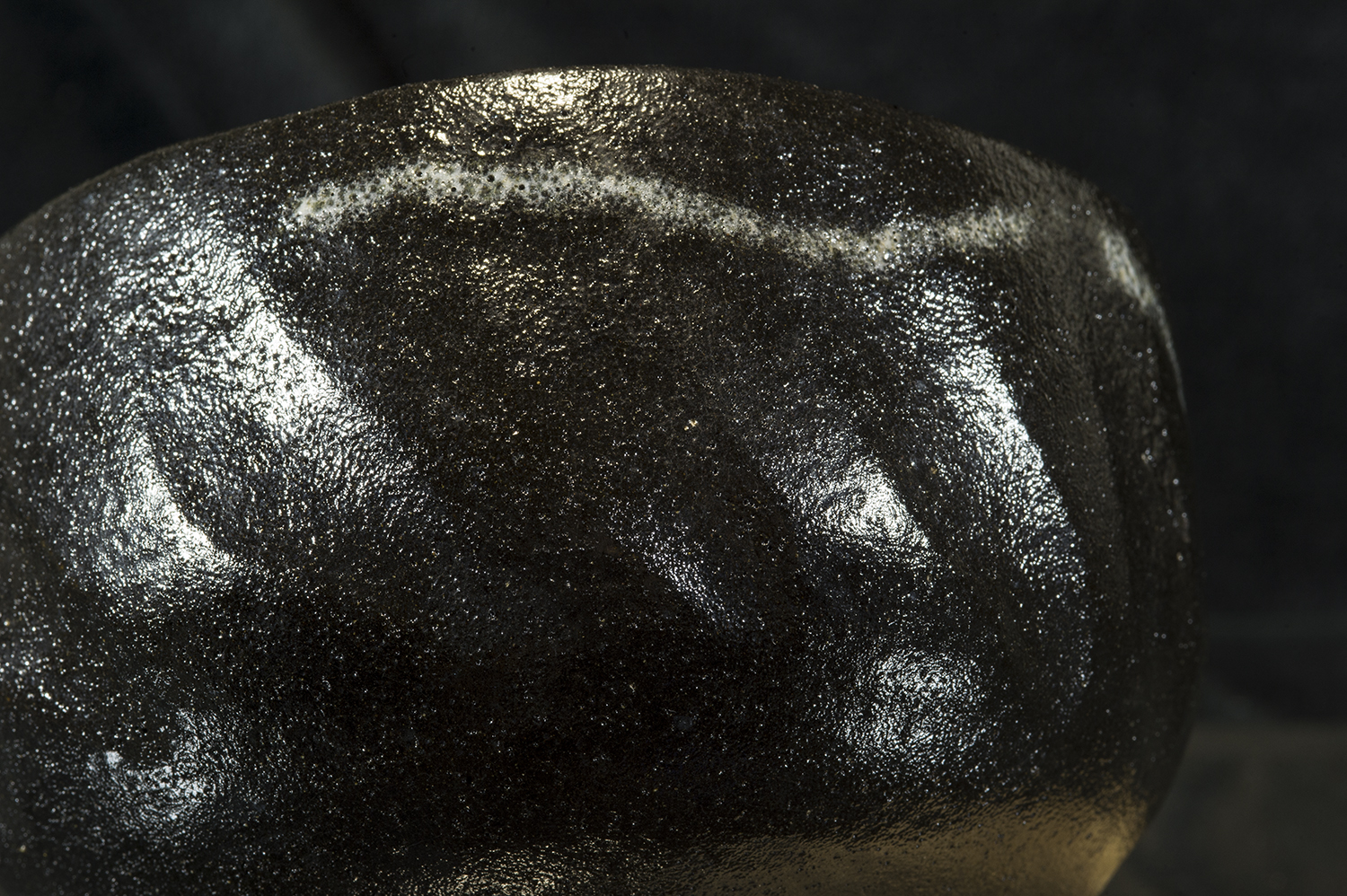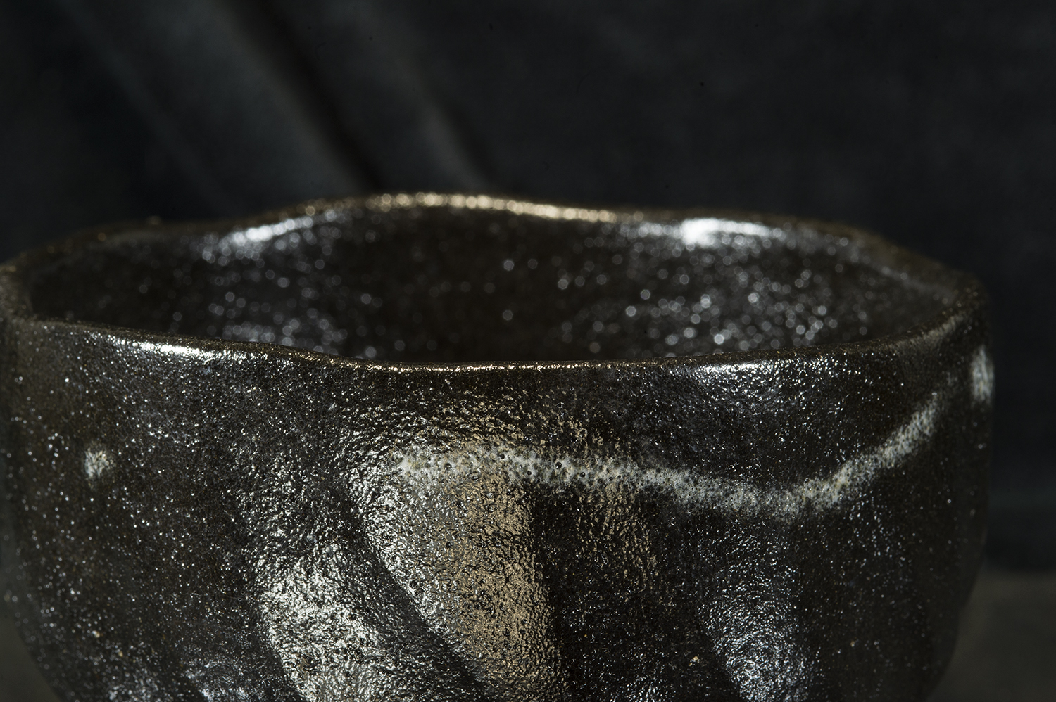 A szokásosnál enyhén nagyobb (micsoda szerencse!) kuro raku chawan Shoraku Heian műhelyéből. A csésze 12,8 cm átmérőjű 7,6 cm magas.