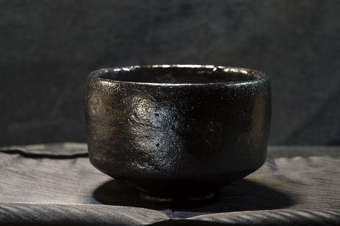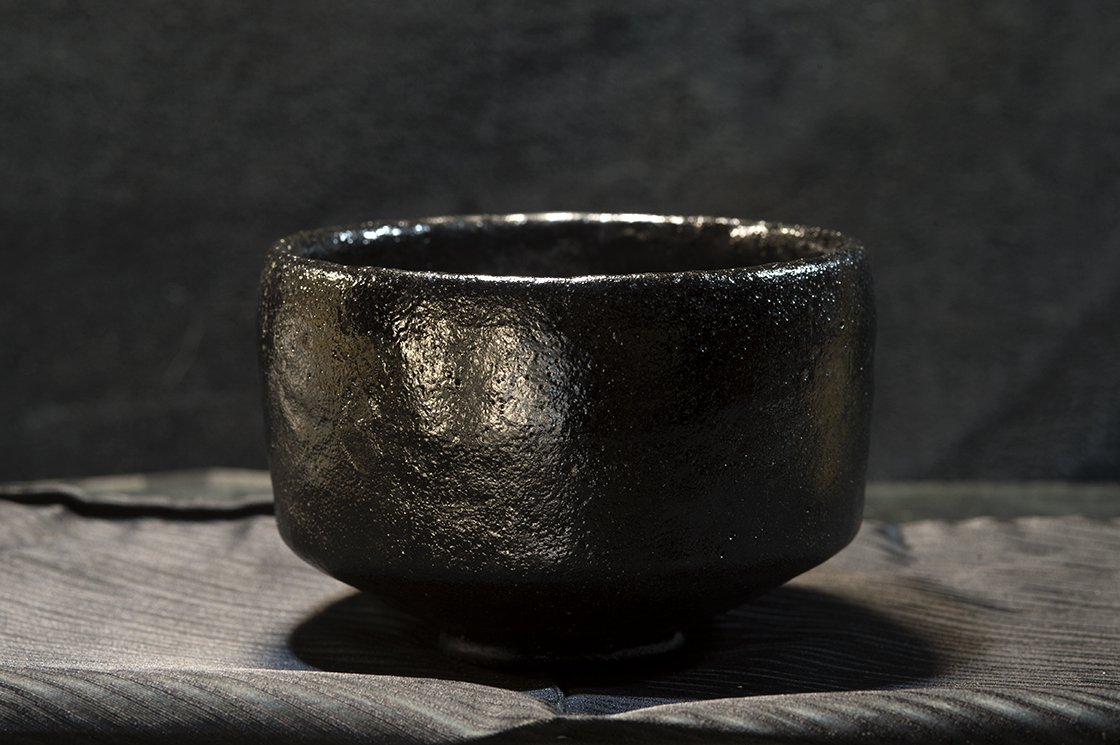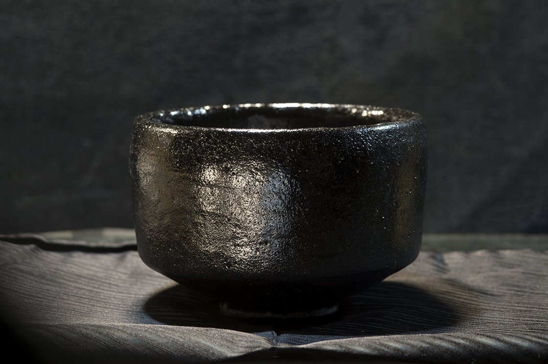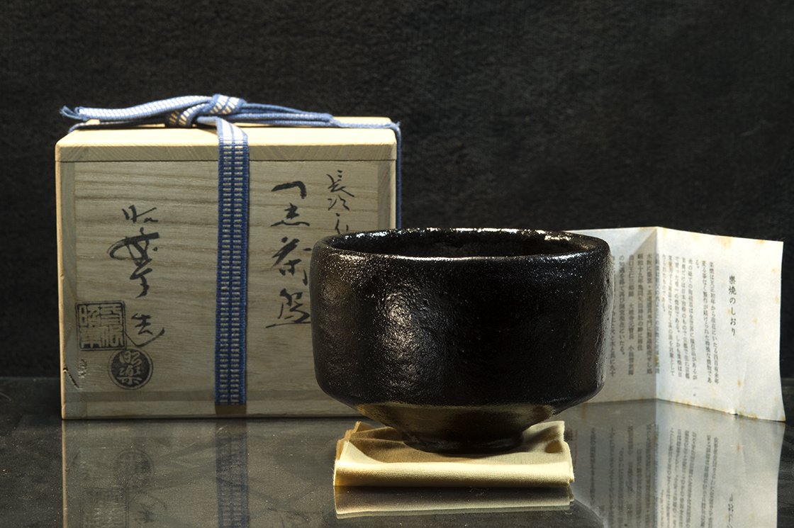 12 cm átmérőjű, 8,5 cm magas kuro raku teáscsésze Shoraku Sasaki műhelyéből.