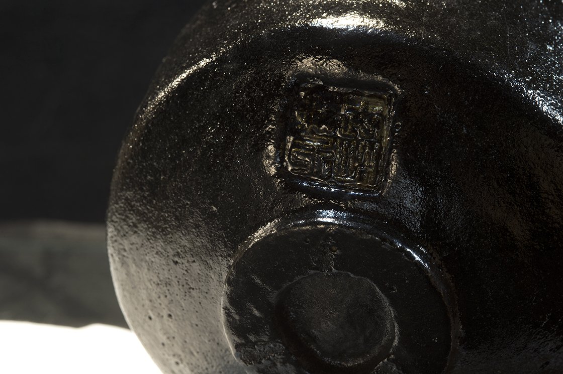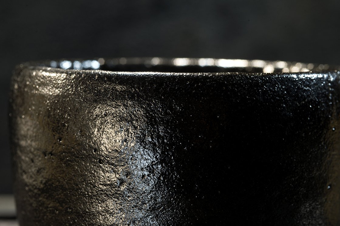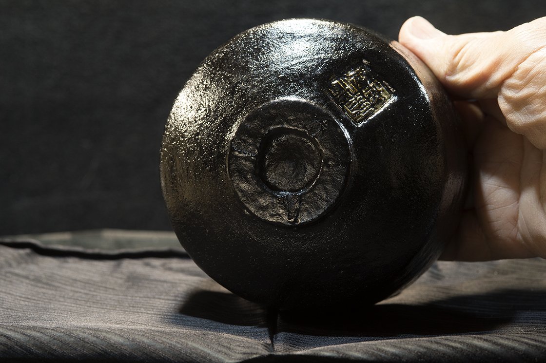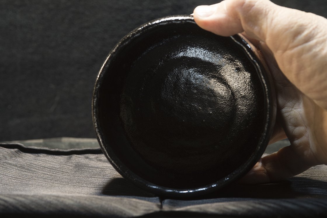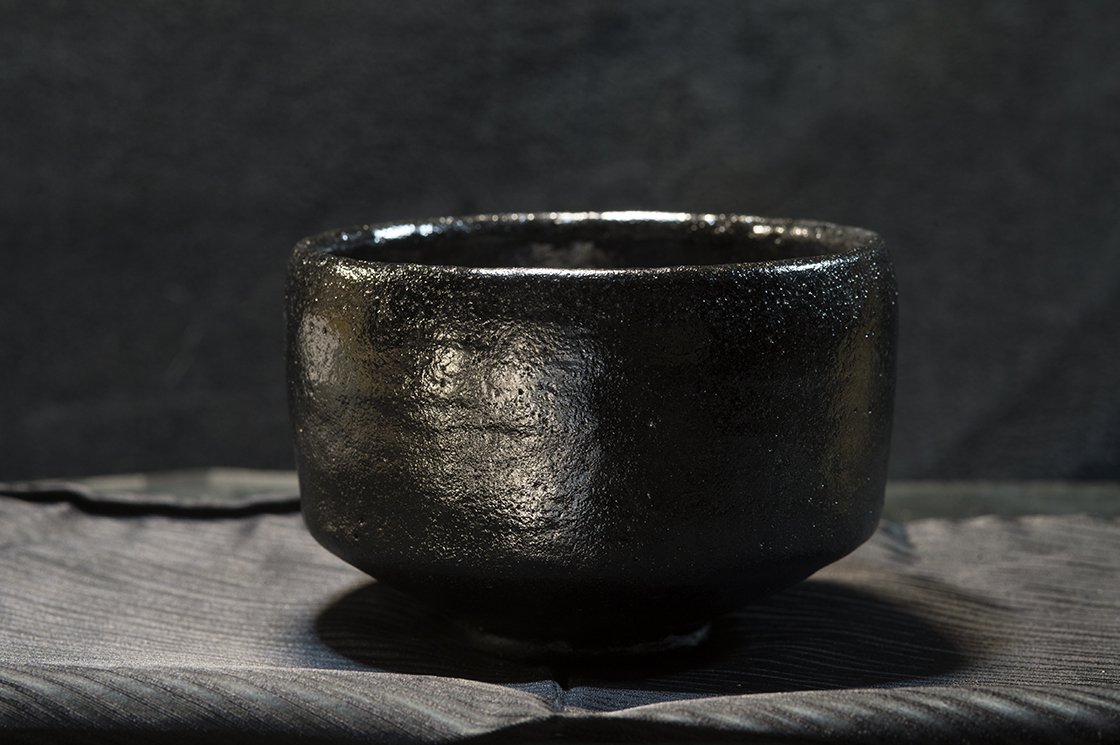 12 cm átmérőjű, 8,5 cm magas kuro raku teáscsésze Shoraku Sasaki műhelyéből.