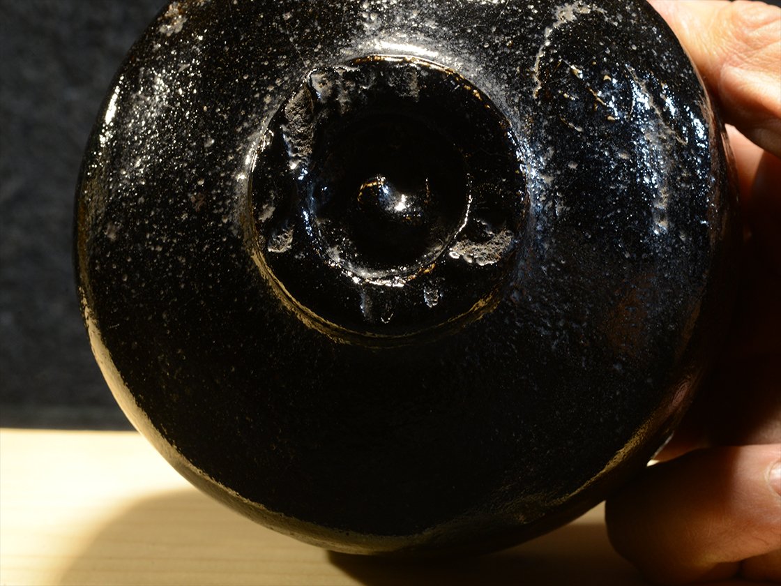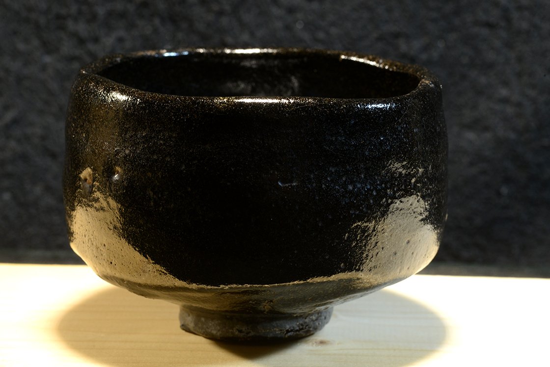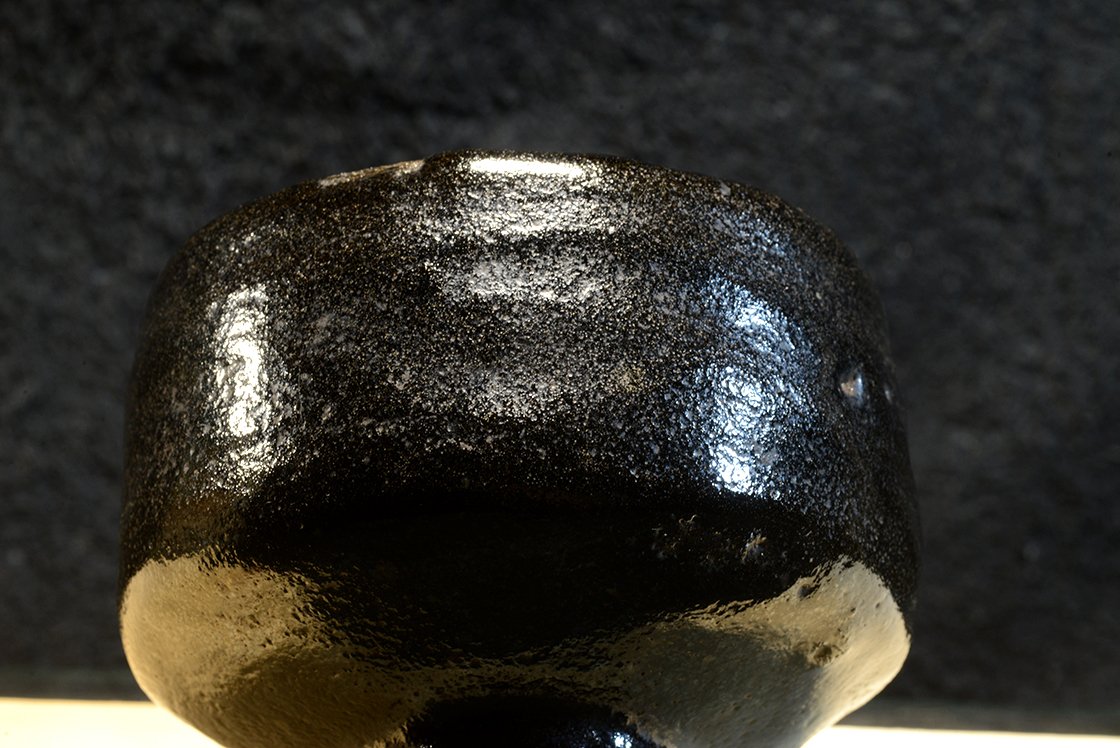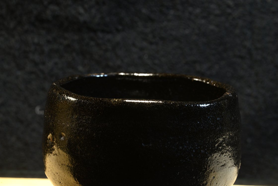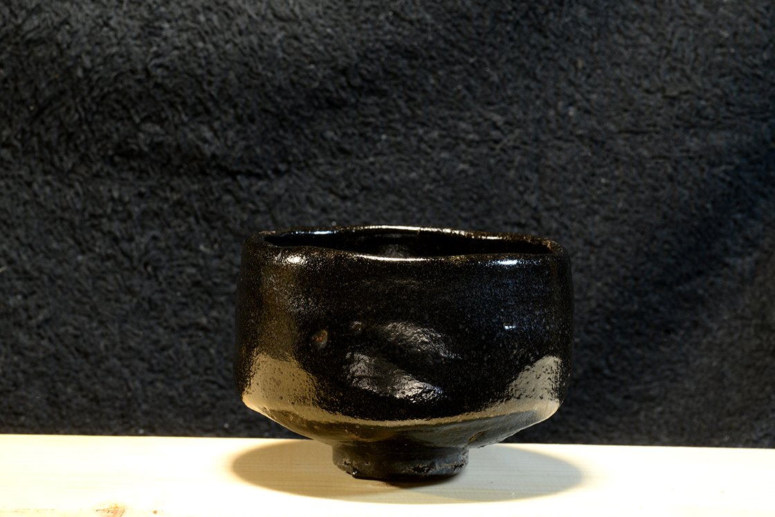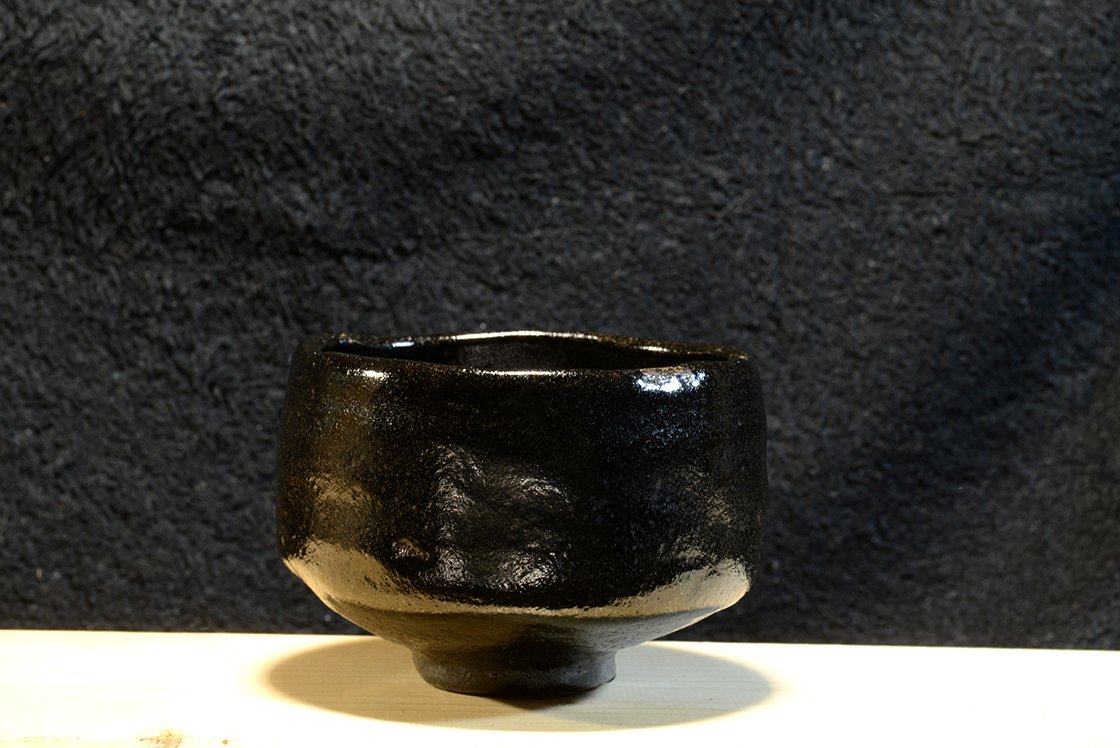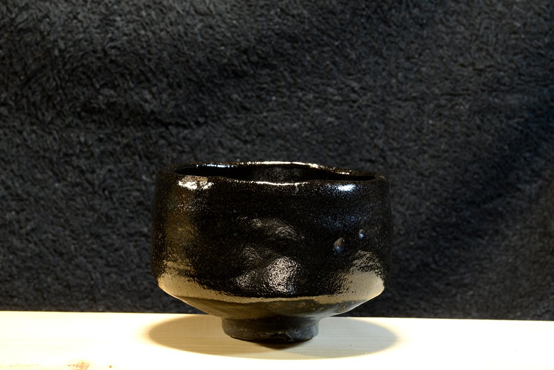 Kuro raku chawan matcha teáscsésze rózsaszín szalaggal záródó fadobozban Takuzan Nakajima műhelyéből. Kézbesimuló csésze tele feszültséggel. A csésze 12 cm átmérőjű, 8 cm magas, mélyfekete raku mázzal. Ha egymás mellé állítunk több fekete raku csészét, az elsőre ugyanolyan csészék hirtelen megmutatják mennyire mások. Egy-egy mester saját stílusa a csésze formájában, súlyában, a mázban egymástól nagyon különböző csészéket eredményez.
