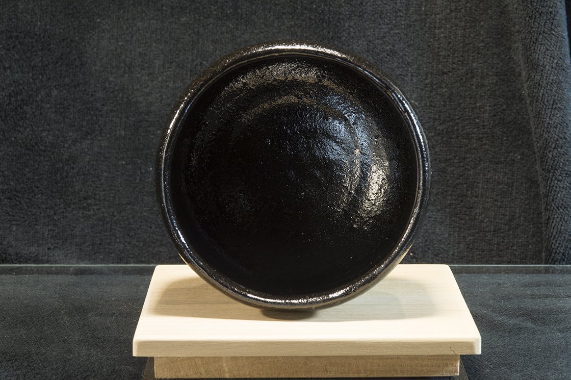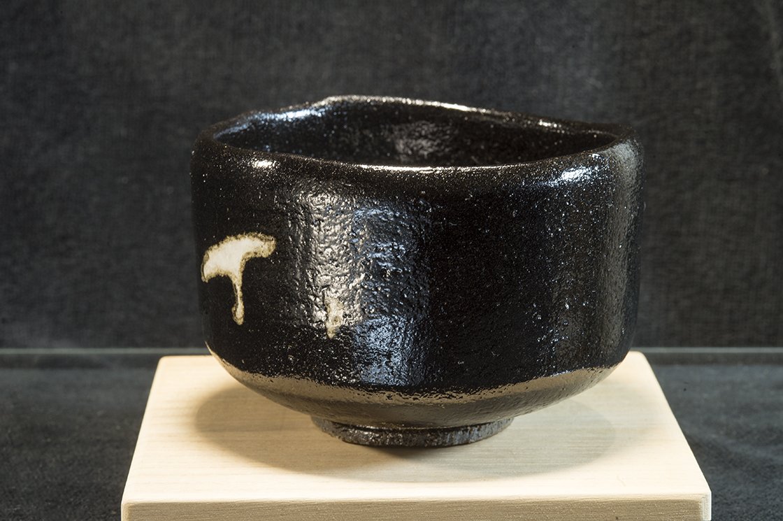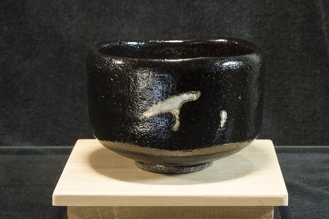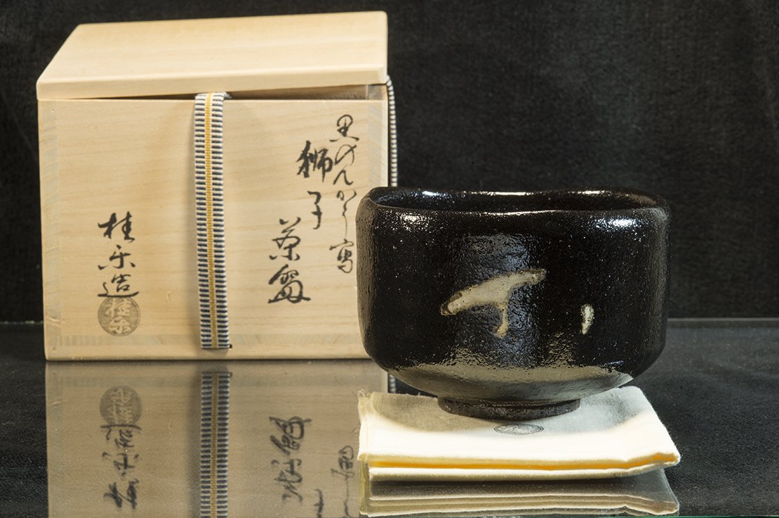Kuro Raku chawan matcha csésze Keiraku Ito kyotói műhelyéből, aki az Urasenke „házi” keramikusa. A gingko levél minta az Urasenke jelképére utal, habár azt ma egyre inkább logónak mondják.