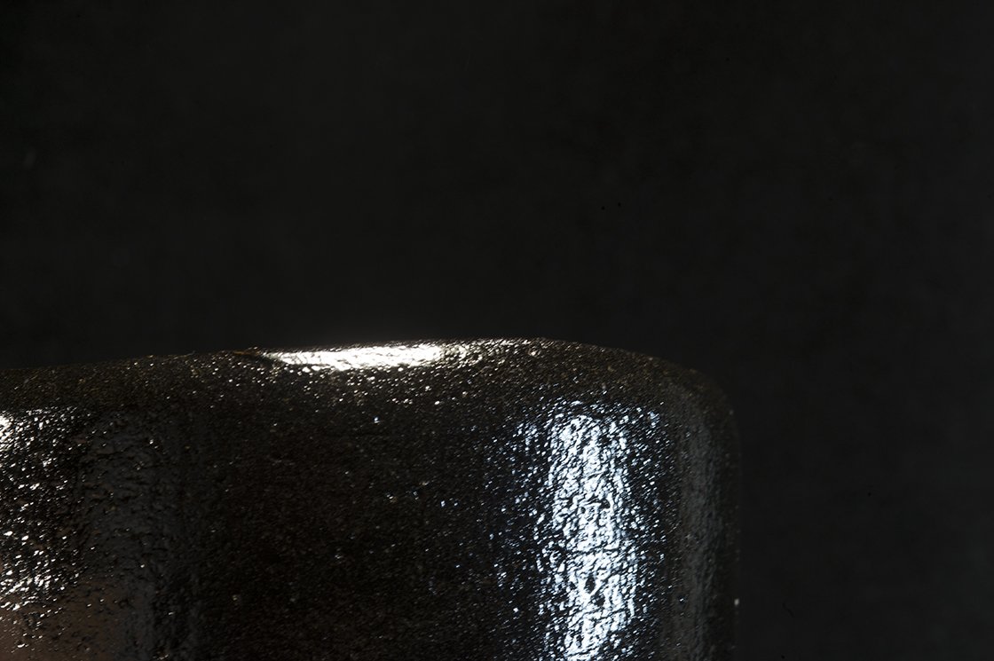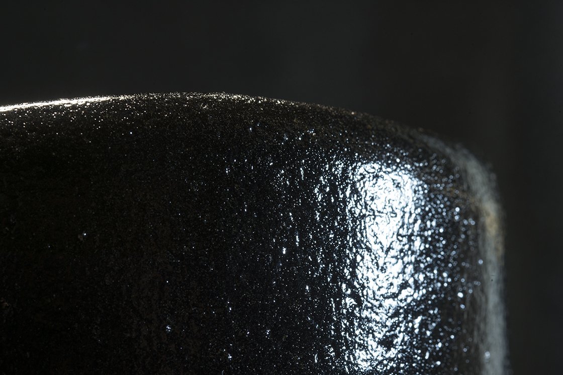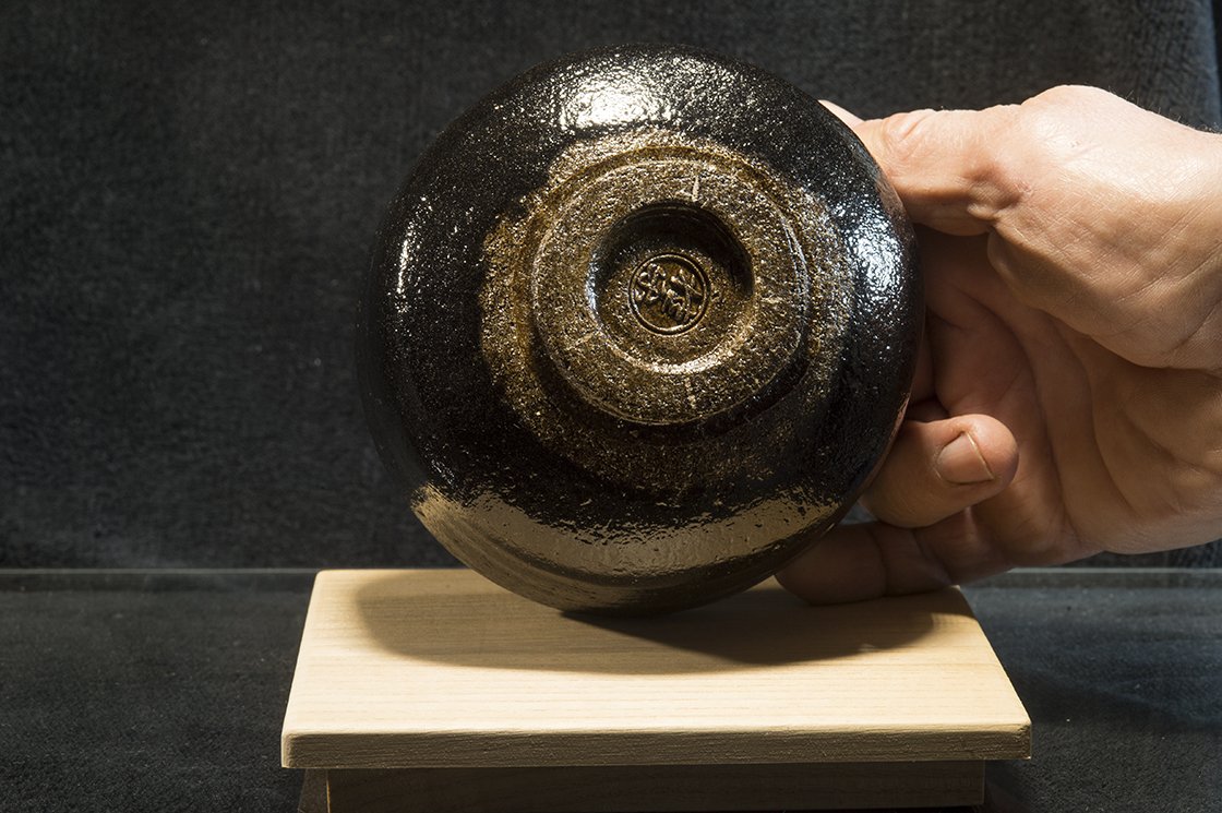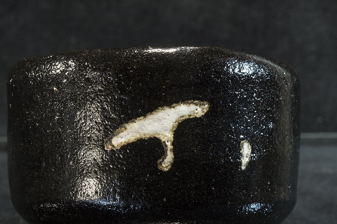 Kuro Raku chawan matcha csésze Keiraku Ito kyotói műhelyéből, aki az Urasenke „házi” keramikusa. A gingko levél minta az Urasenke jelképére utal, habár azt ma egyre inkább logónak mondják.
