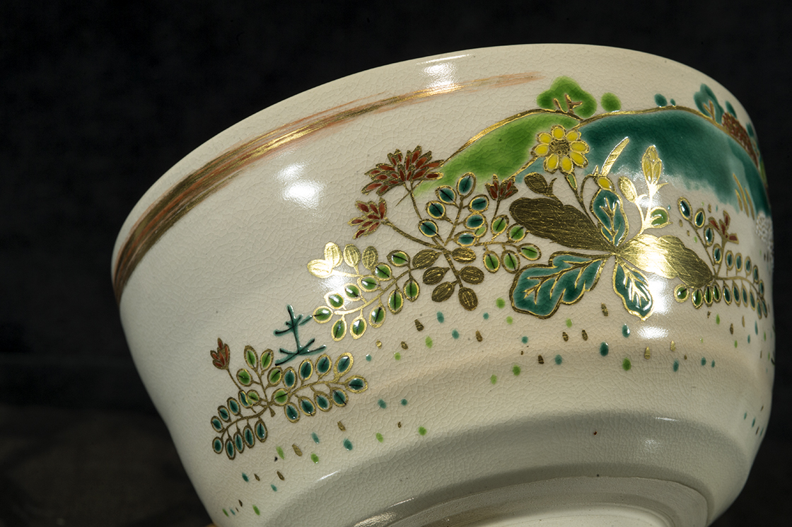 A Kézzel festett Kyomizu matcha teáscsésze 12,5 cm átmérőjű, 8,7 cm magas kyomizu kerámia chawan.