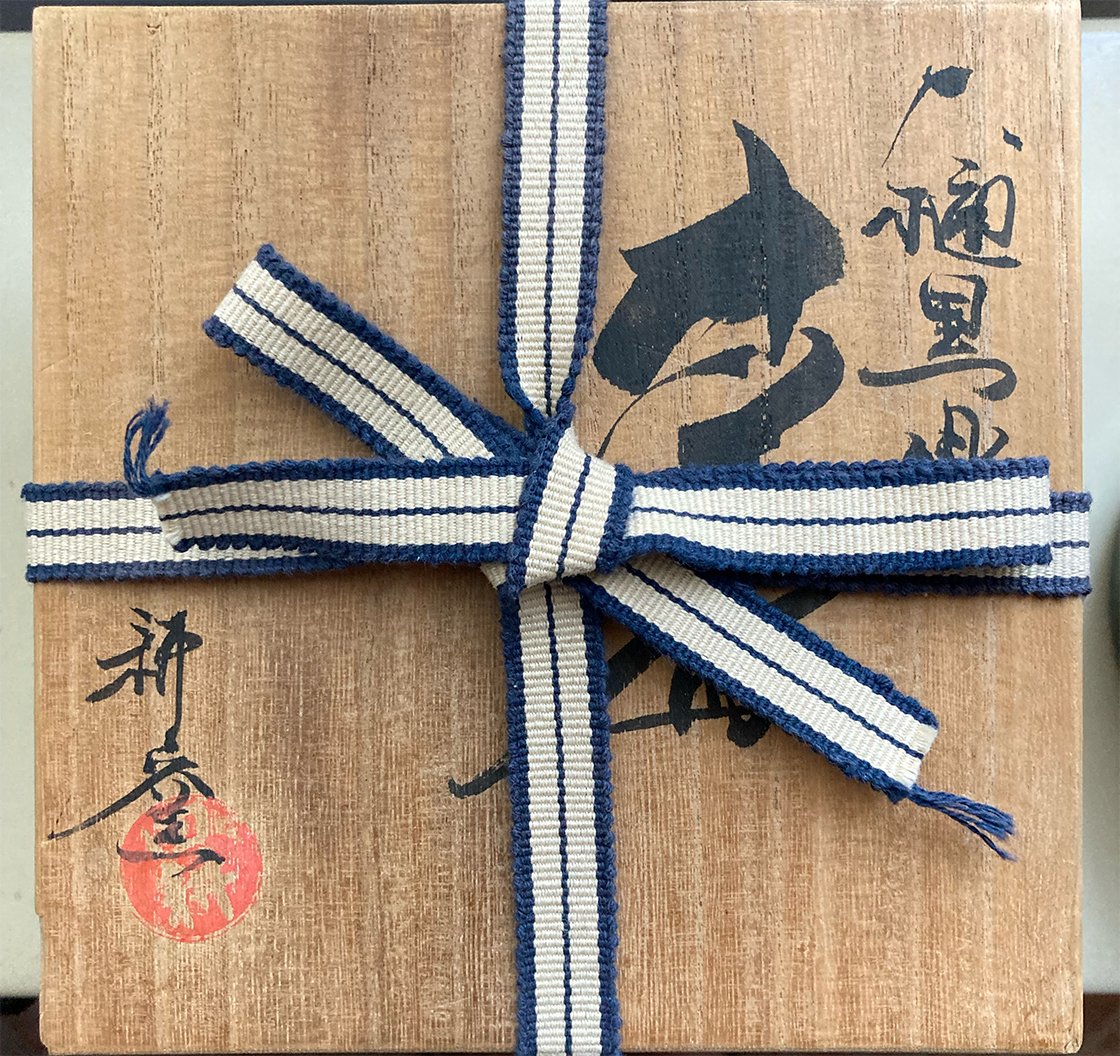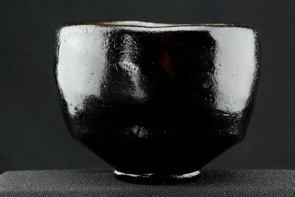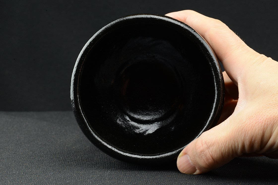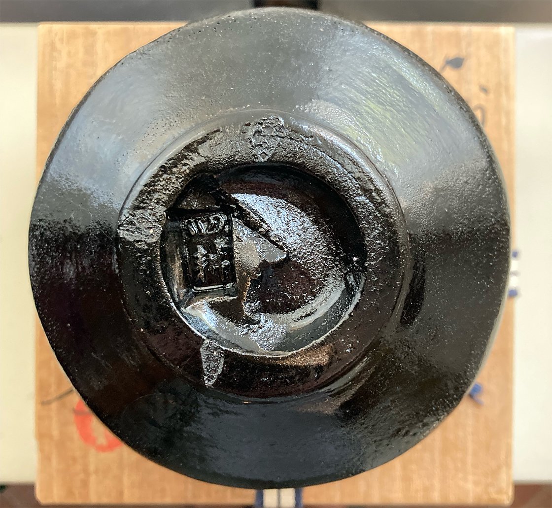12 cm átmérőjű, 8,2 cm magas raku chawan. A keramikus pecsétje szokatlan módon a talpban helyezkedik el.