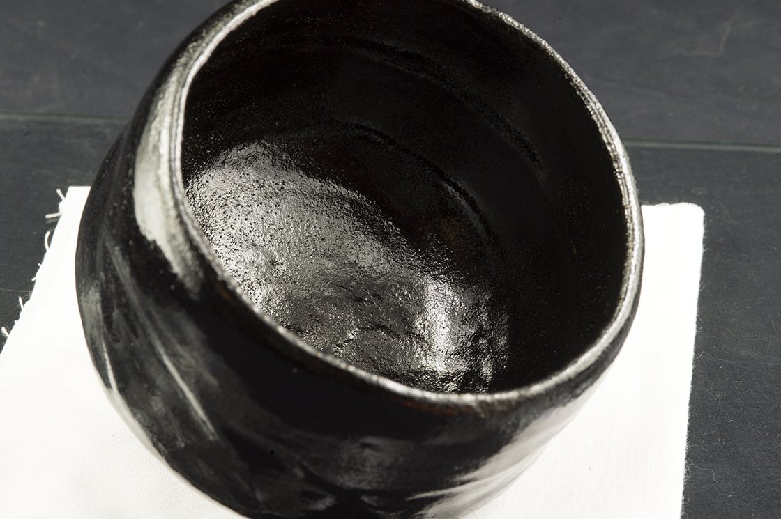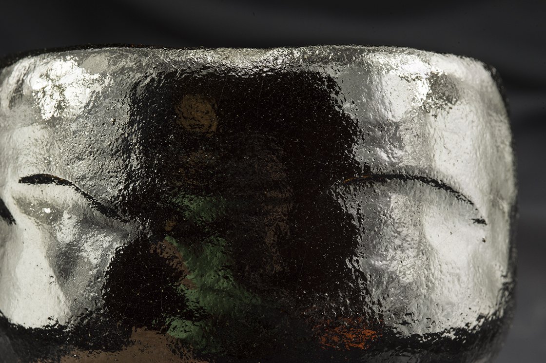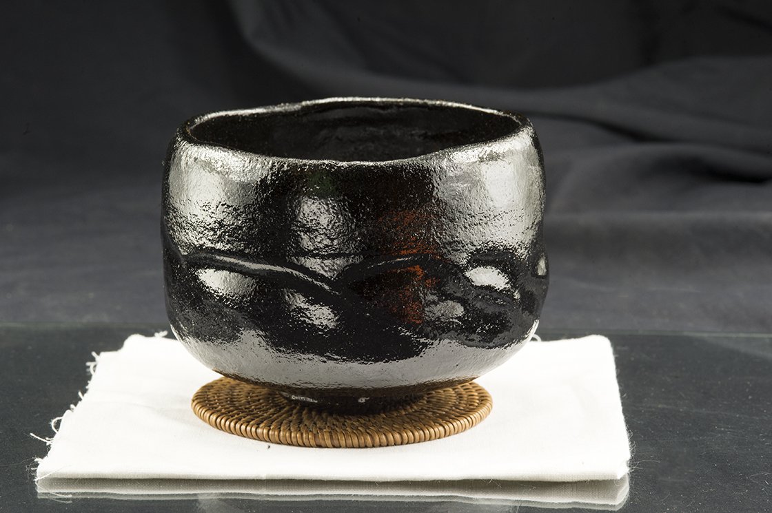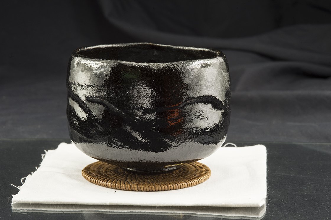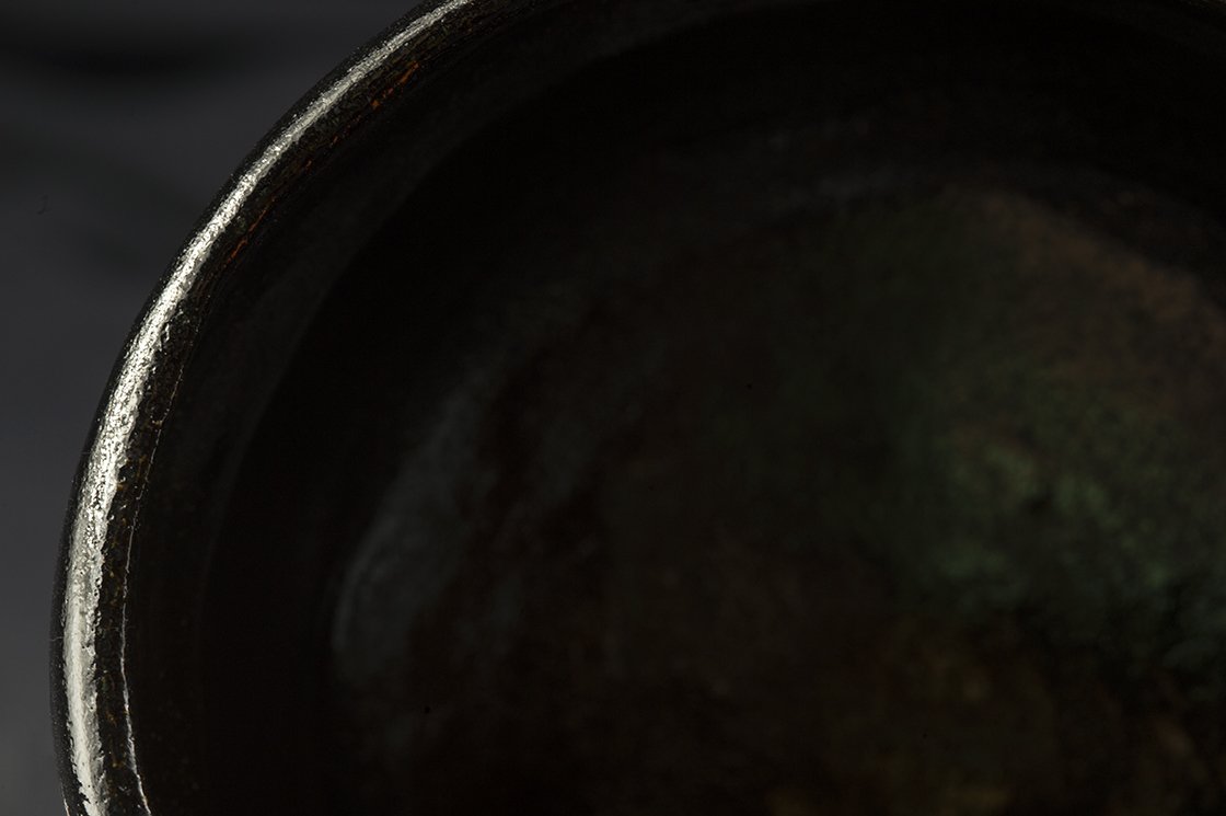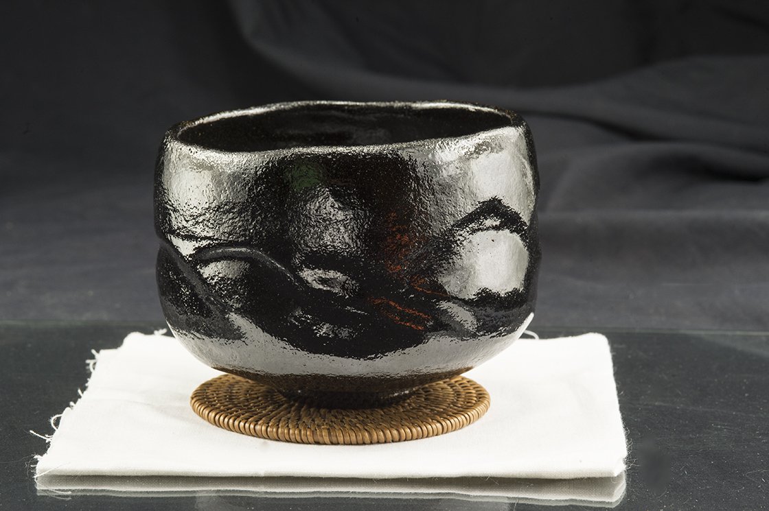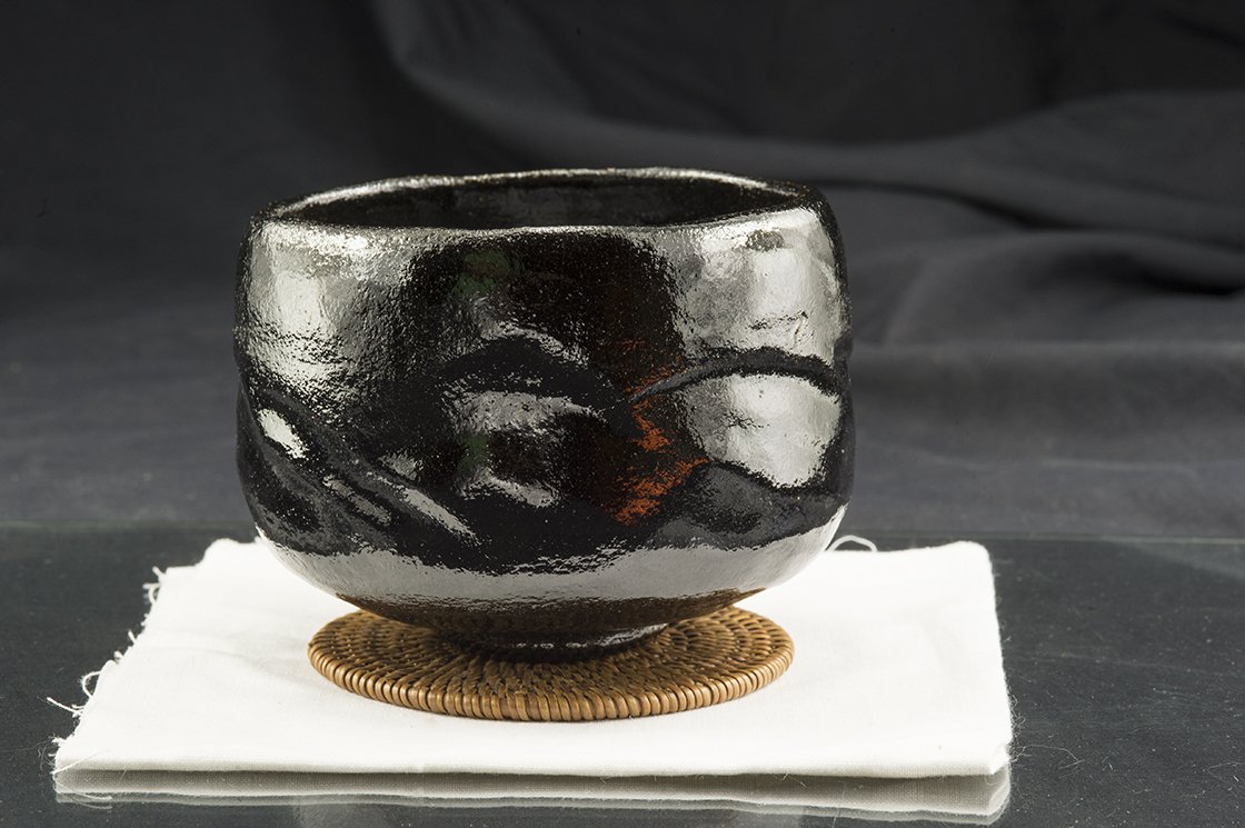 A csészén a raku klasszikus, eredeti Rikyu féle jegyei, durván felrakott szögek, ófekete raku mázon átütő titokzatos vörös foltokkal.