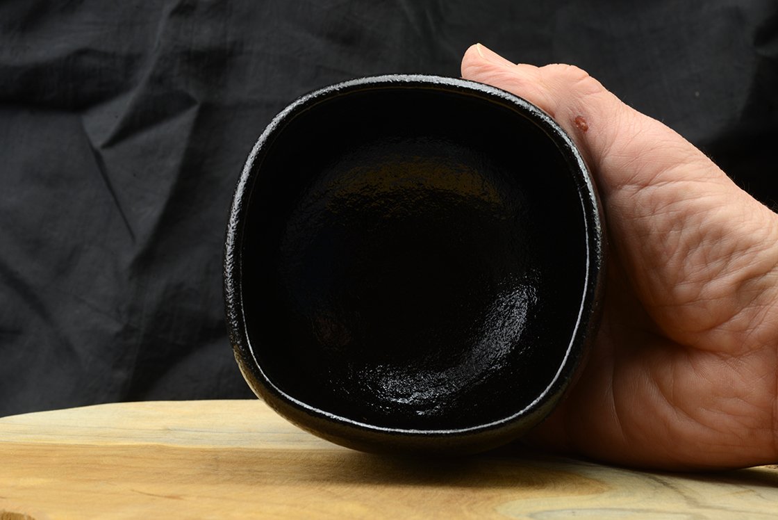 A négyszögletű kerek csésze szabályossága az egymásbaolvadó geometrikus formák oldják a tárgy merevségét – a teaiskoláknak nem is árt egy kis lazulás. Mint minden különleges minőségű raku tárgyban, ebben is nagy a kiégetéskor keletkezett feszültség, koccintásra cseng, mint egy csengő.
