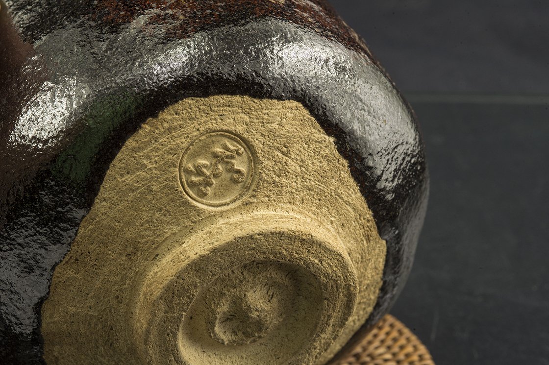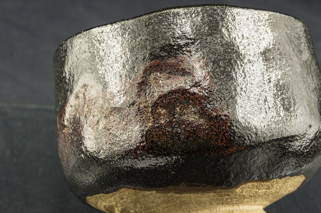 A csészén a raku klasszikus, eredeti Rikyu féle jegyei, durván felrakott szögek, ófekete raku mázon átütő titokzatos vörös foltokkal.