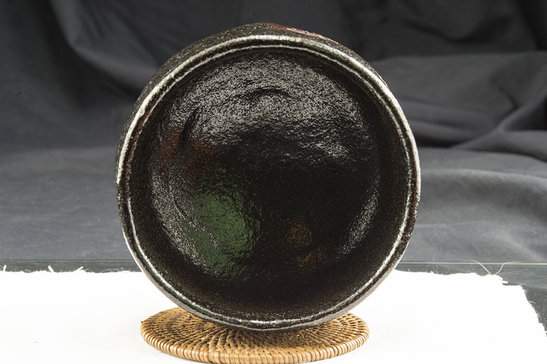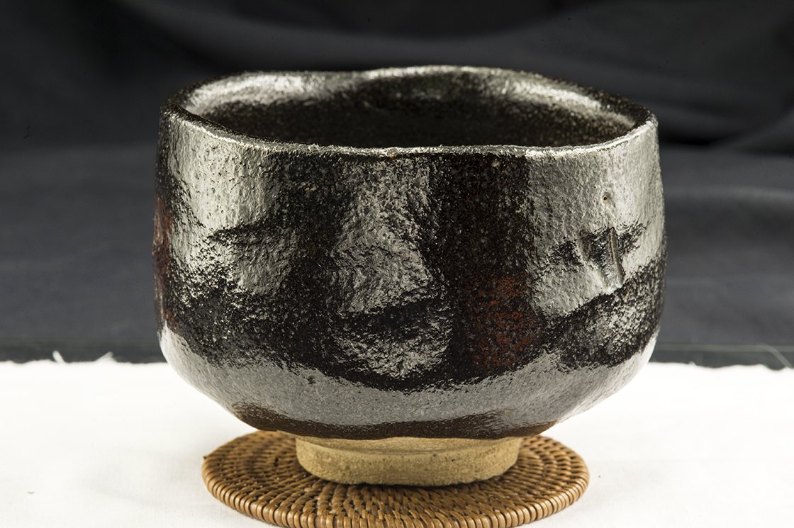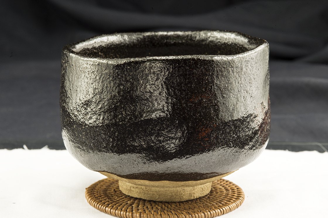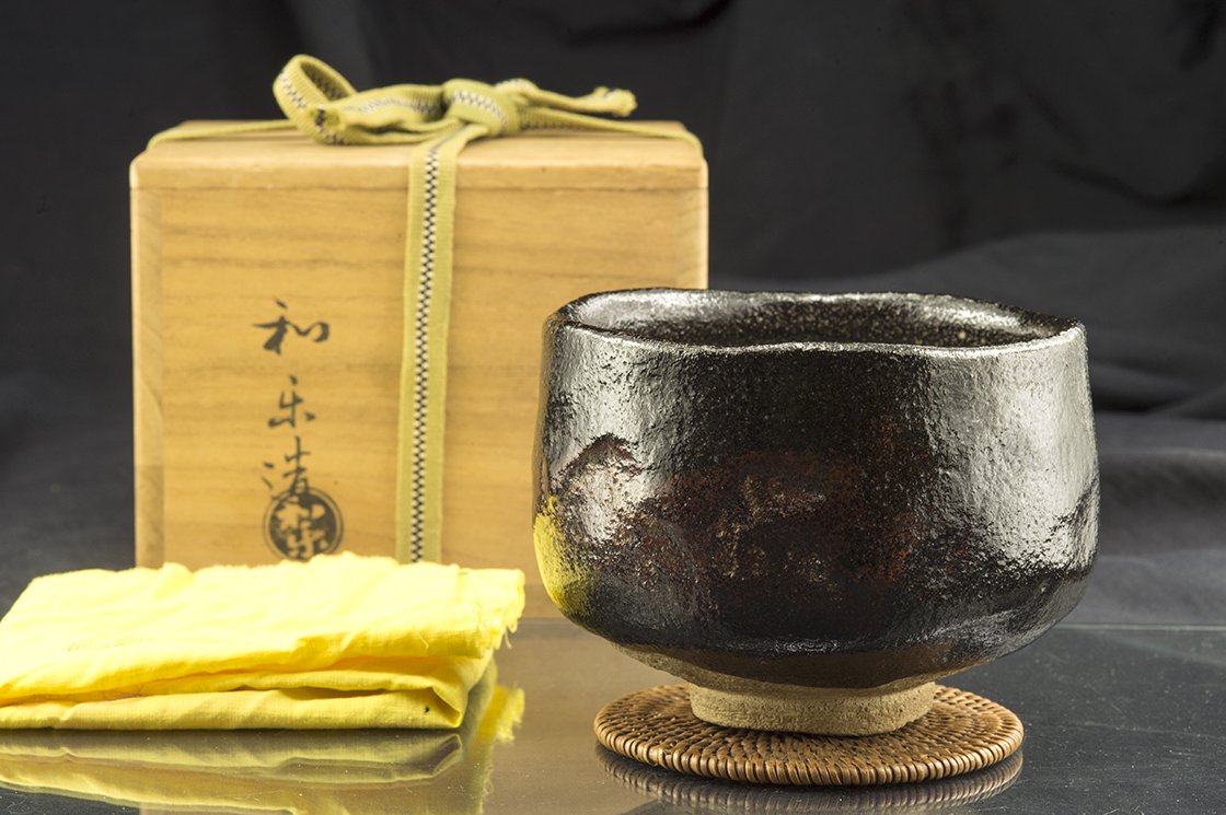Kuro raku chawan japán matcha teáscsésze a Waraku Kawasaki műhelyből.