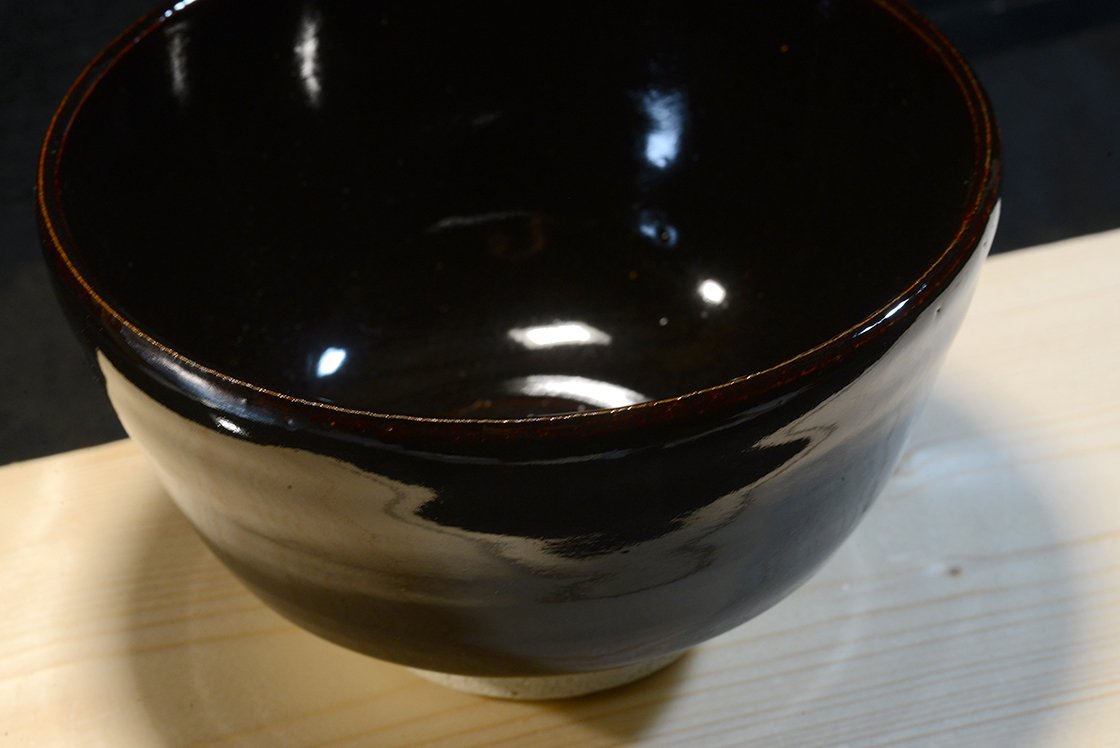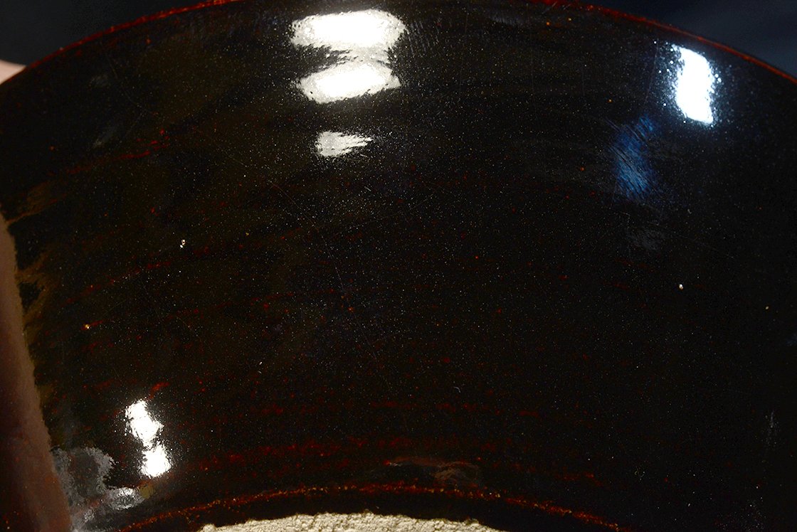 A csésze nagy és nagyon elegáns, alig kiismerhető sötétbordó seto mázzal.