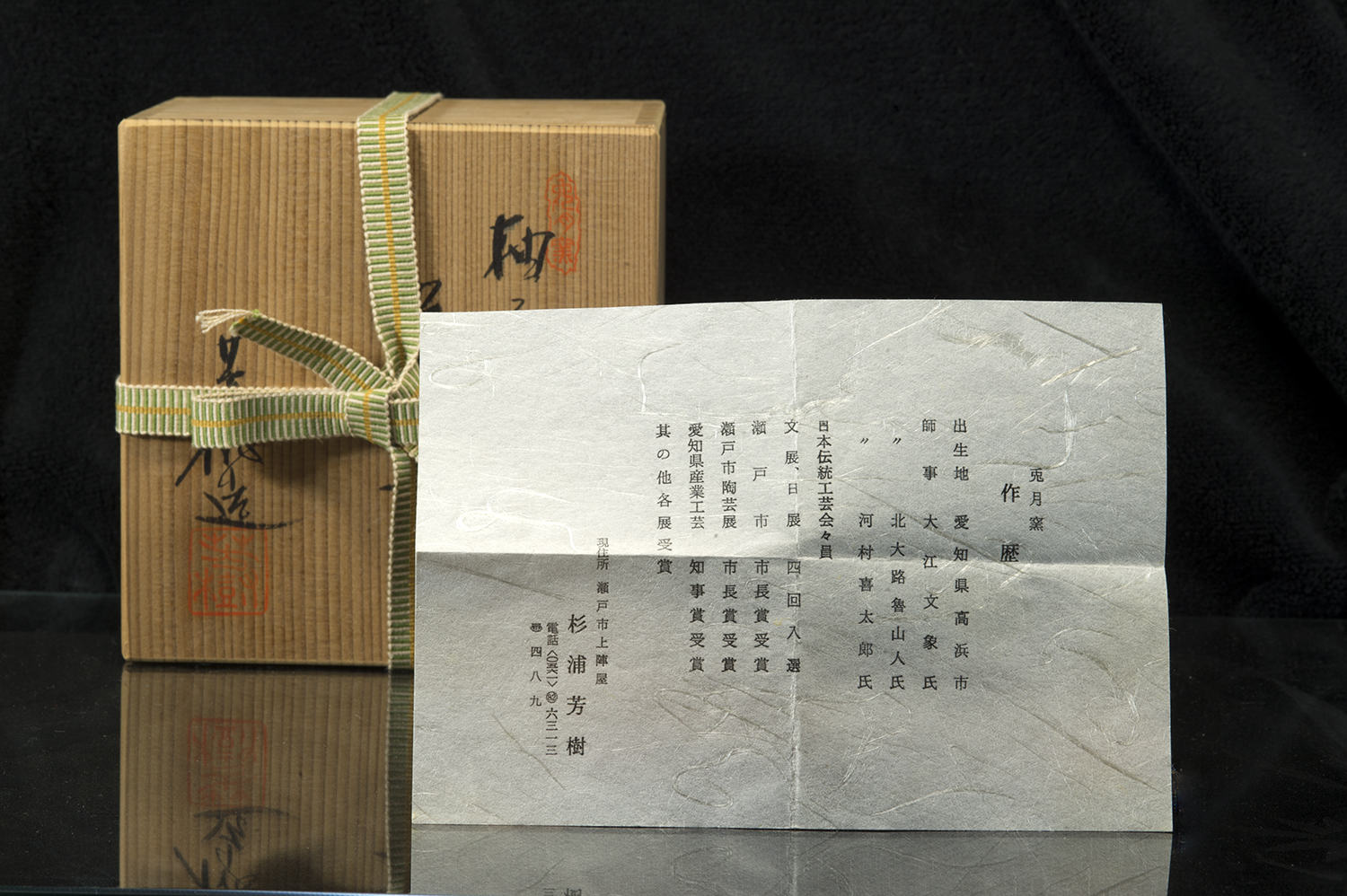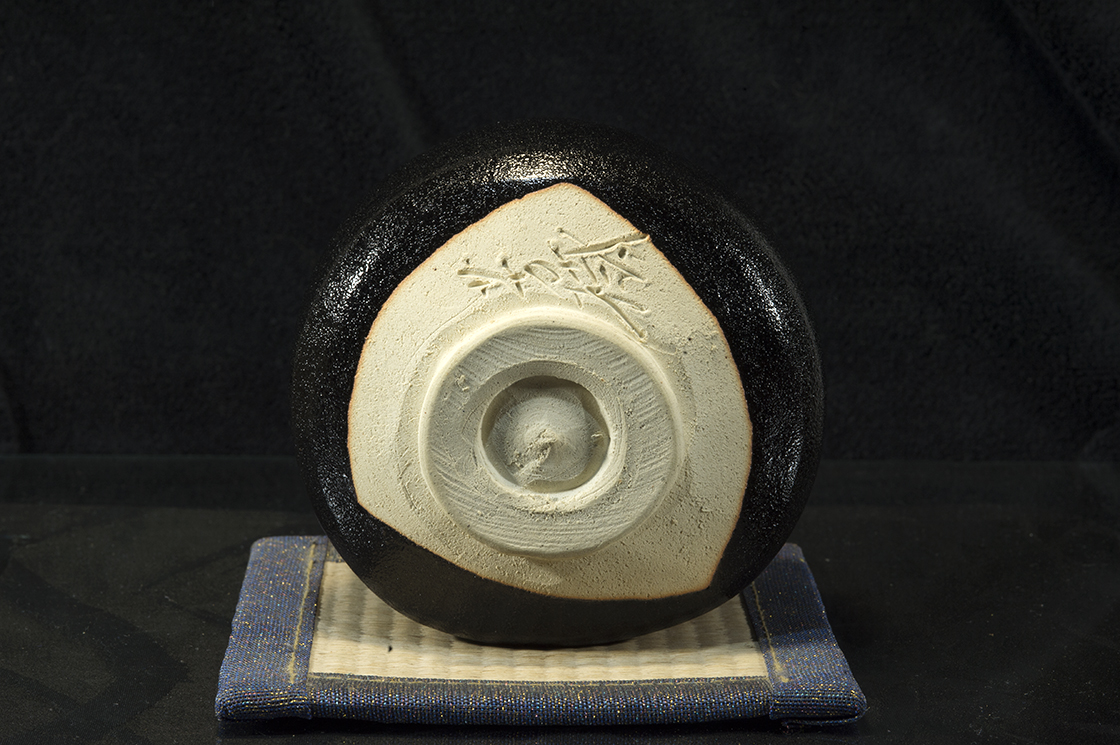 A Seto kerámia veteránja. Sugiura az excentrikus zseni, az élő Nemzeti Kincs címet visszautasító Rosanjin tanítványa volt. Számtalan díjat nyert, négyszer hívták meg a Nitten (日展 Nitten (Nihon bijutsu tenrankai) Összművészeti kiállításra. Minden nagyobb japán kiállítás meghívottja és résztvevője és díjazottja. Főleg hamumázzal és vasas mázzal dolgozott. Ez a csésze egy nagy rutinnal készített, különleges személyiségű tárgy a seto guro fekete ruhájában.