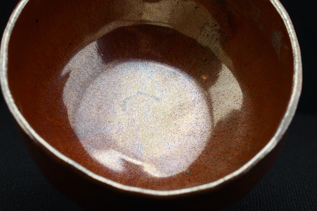 Tenmoku gyöngyházas matcha teáscsésze, ami 11.8 cm átmérőjű, 7.2 cm magas.