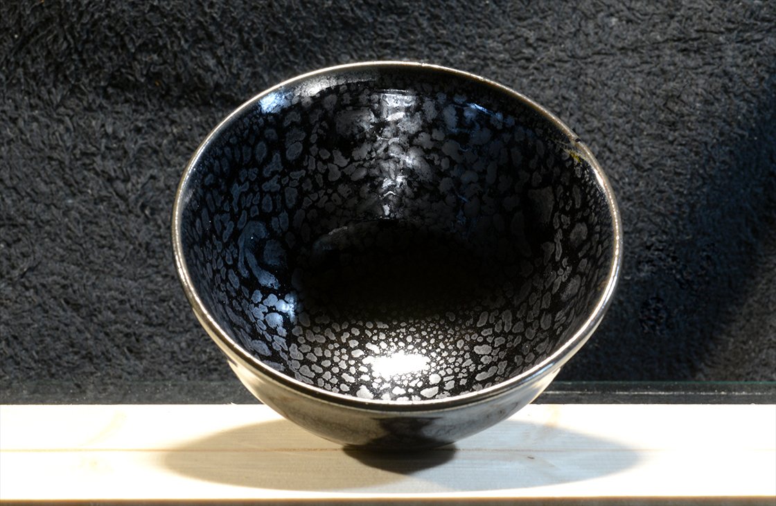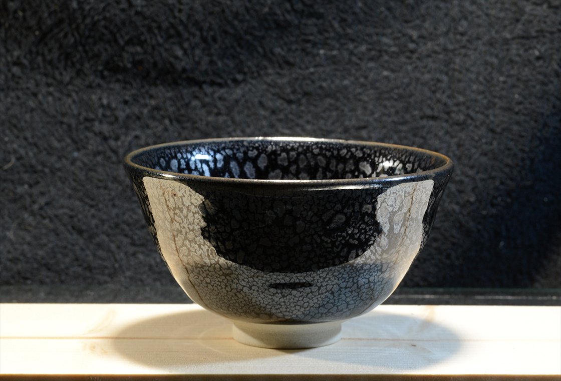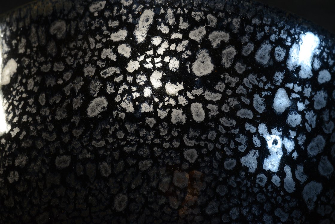13,5 cm átmérőjű, 7,6 cm magas yuteki tenmoku (olajfoltos) chawan matcha teáscsésze.