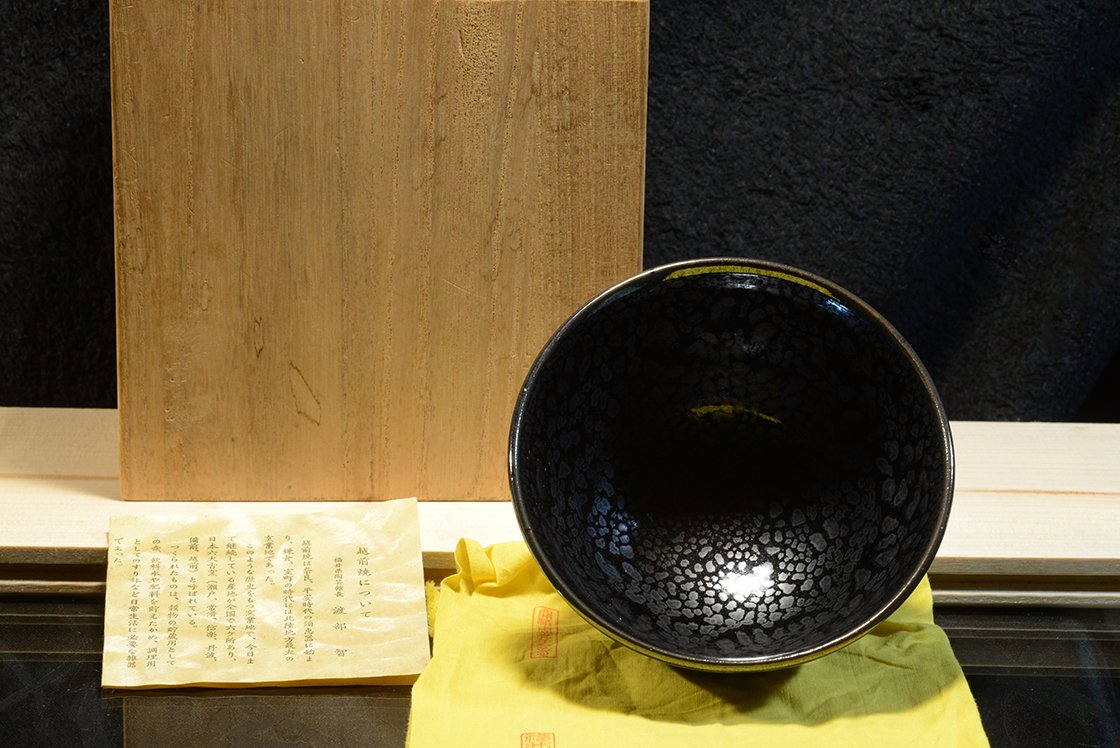 A tenmoku egy máz fajta, amit elsősorban a szintén tenmokunak nevezett formájú csészéken alkalmaztak a Song dinasztia Kínájában. Erről korábban itt írtunk. A tenmokuval dolgozó keramikusok leginkább Kyotóban és a Seto kerámia területén dolgoznak, ez a csésze kivétel, mert a mázatlan fatüzes kerámia egyik fővárosából Echizenből érkezett.