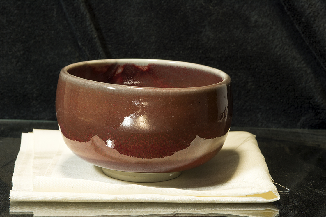 Az itt látható 12 cm átmérőjű, 8 cm magas shinsha ökörvér mázas csésze a Soutsubo gamában,