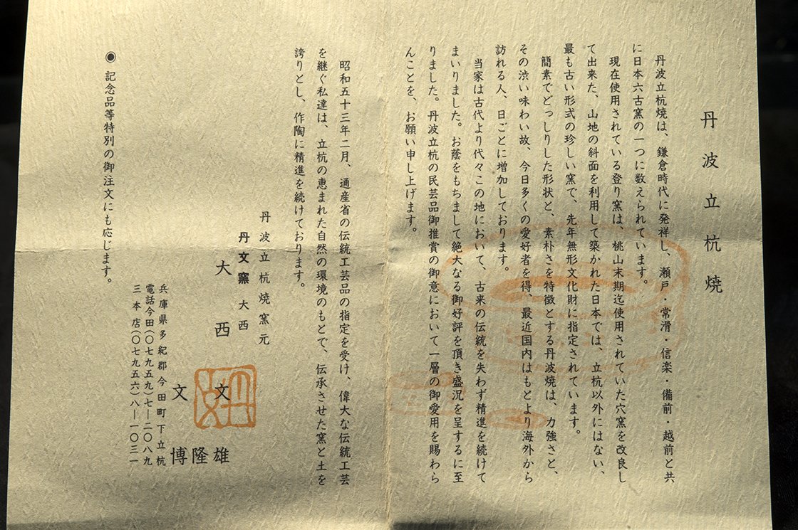 - 丹波立杭焼, Tamba-Tachikui-yaki – Sasayama és Tachikui, Hyōgo prefektúra