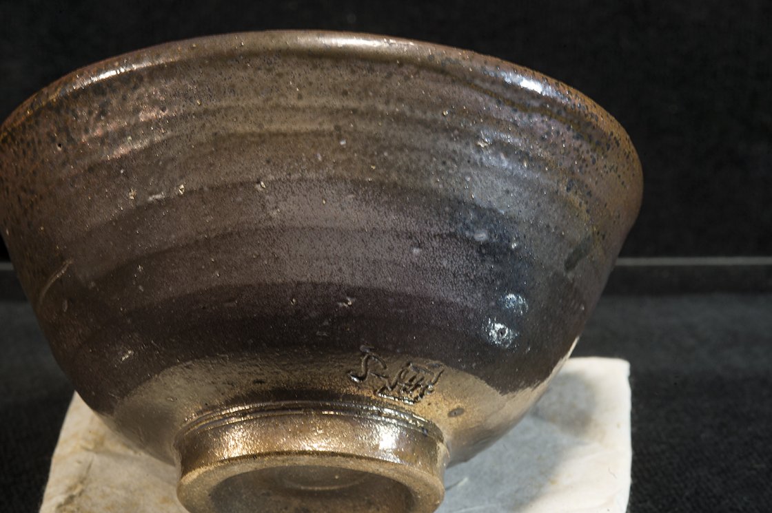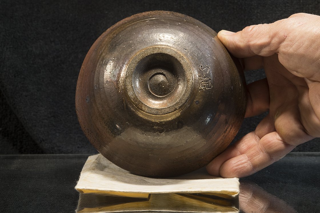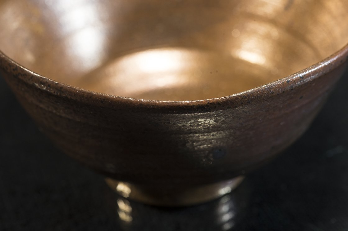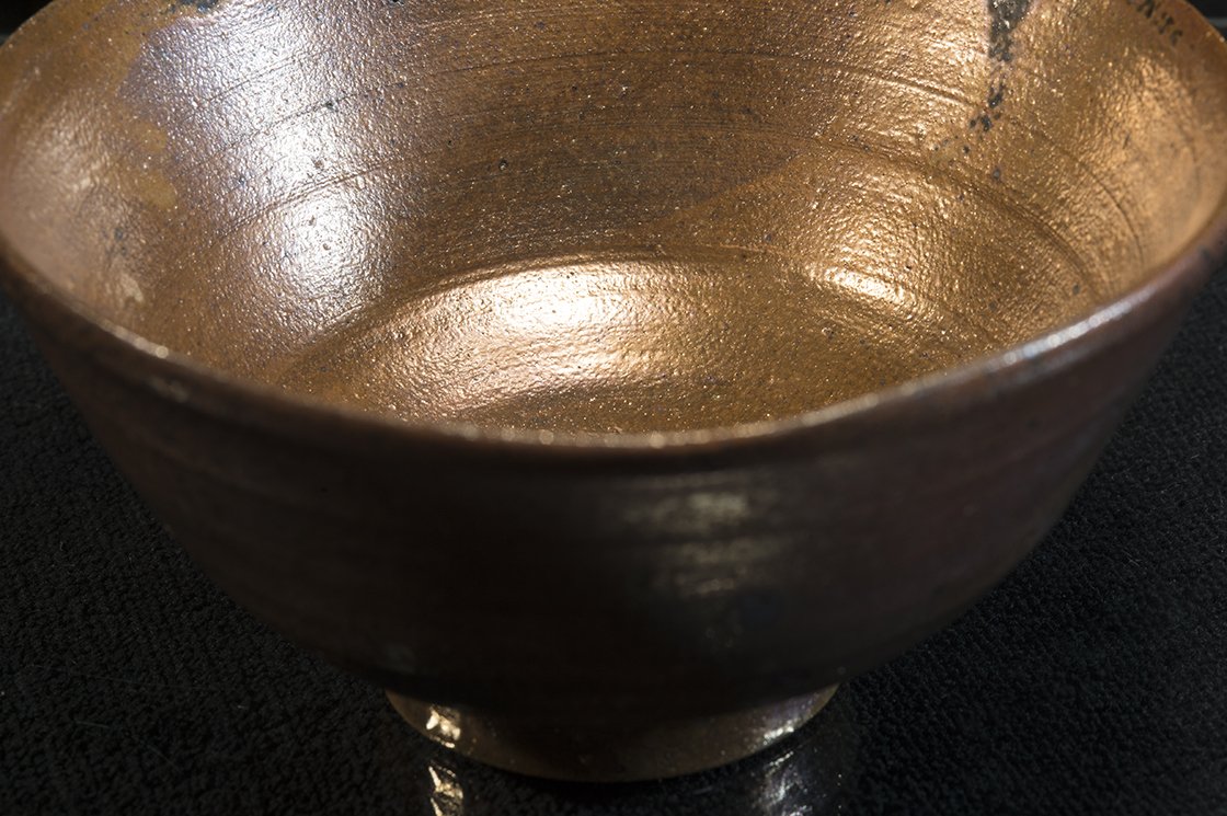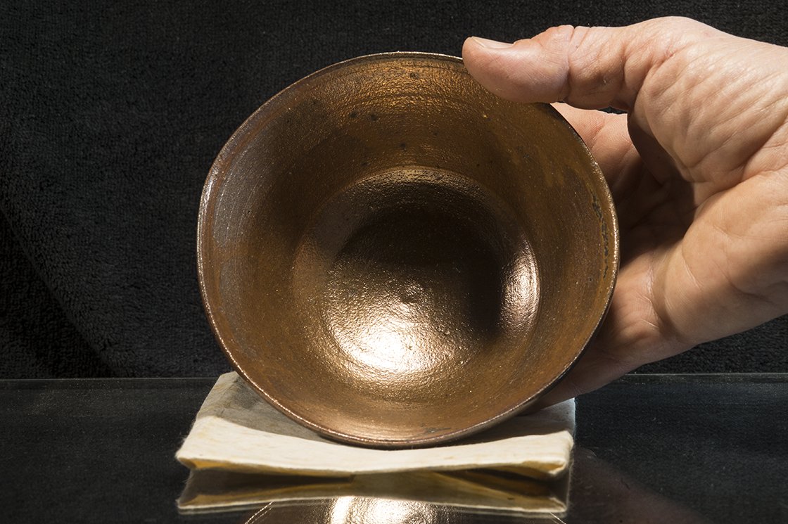A 14 cm széles, 7 cm magas jelzett fadobozban érkező csésze a Tanba minden különleges tulajdonságát felvonultatja pluszként bronzos, aranyos természetes, a kemencében kialakult hamumázzal