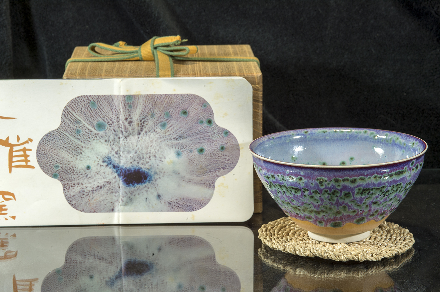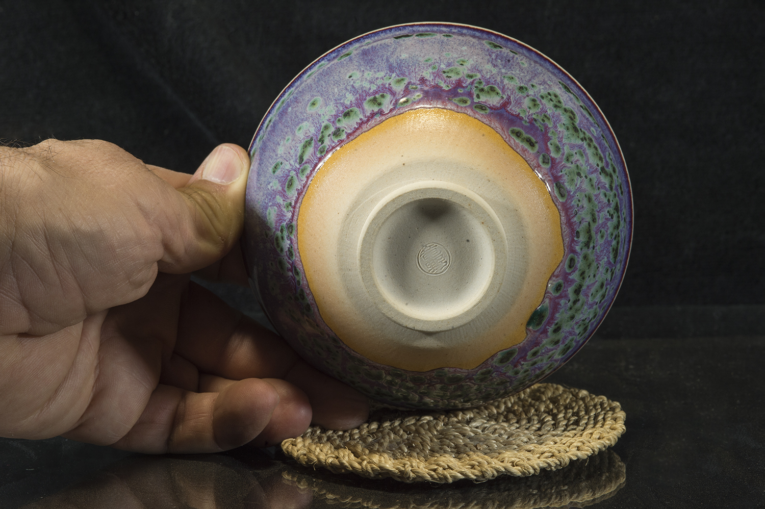 A csésze a gyűjtők körében jólismert és kedvelt 2. Gaei Matsuyama alkotása, a „kujaku” pávaszemes tenmoku szép példája.