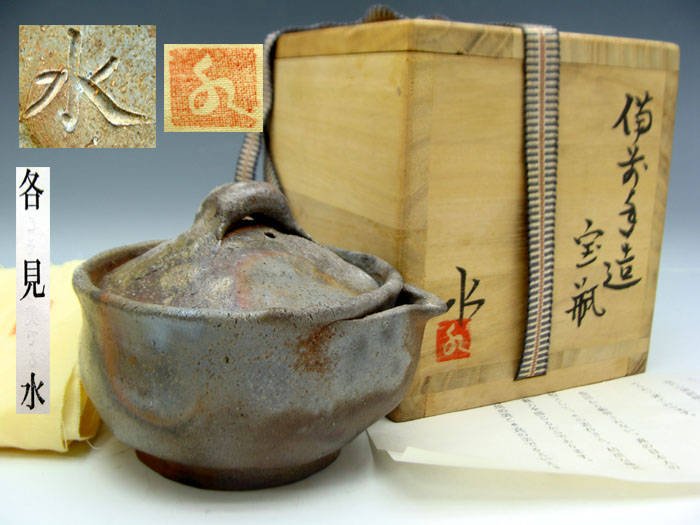 Gyönyörű, egyedi bizen hoihin eredeti fadobozában mindennel, így az itt fordítva lefényképezett eredetigazolással Kakumi Mizu(Sui) műhelyéből, aki ma az új bizen egyik meghatározó keramikusa.