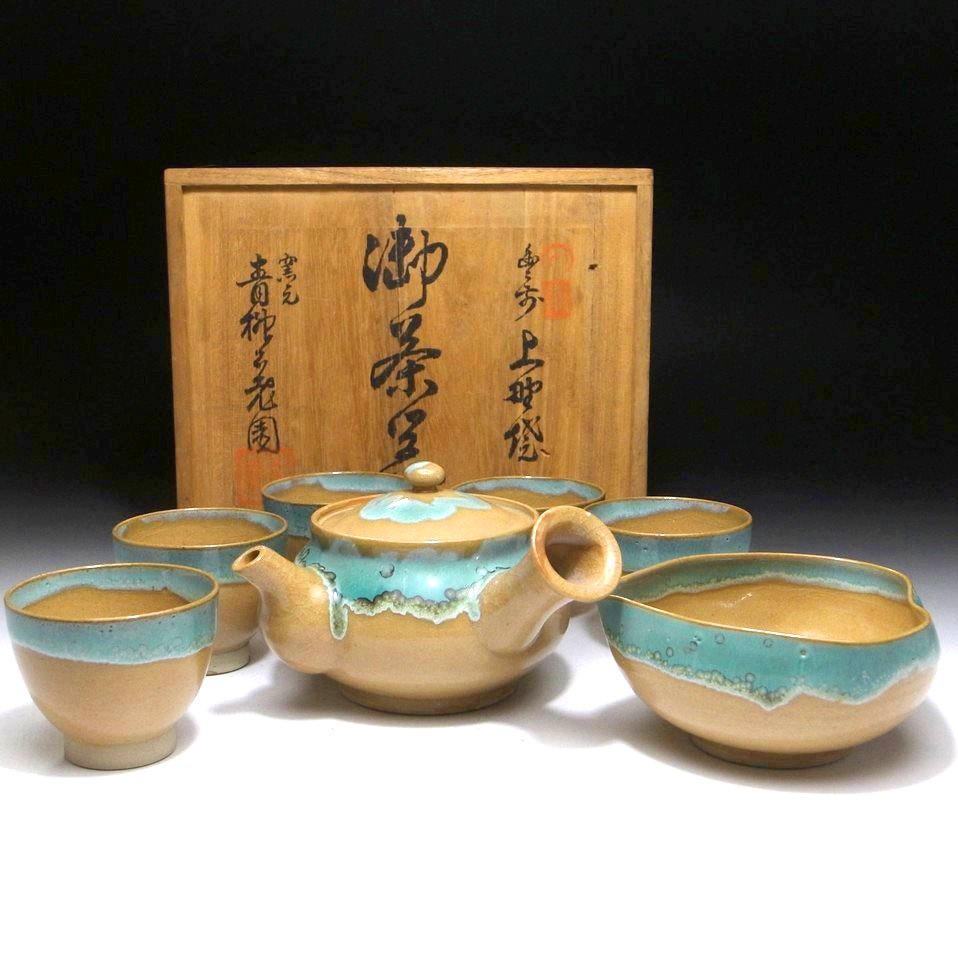 Egy kb 180 ml űrtartalmú teáskanna, szív alakú kiöntő és öt csésze az összetéveszthetetlen Agano stílusban saját jelzett fadobozában.