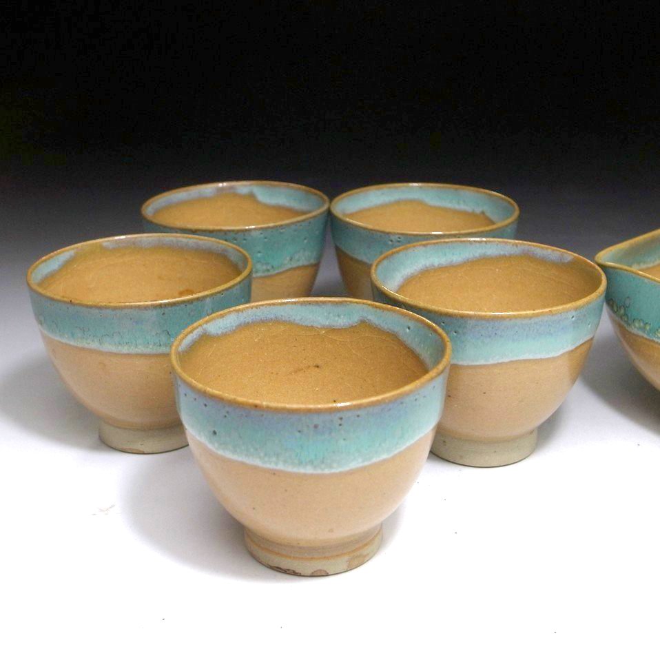 Egy kb 180 ml űrtartalmú teáskanna, szív alakú kiöntő és öt csésze az összetéveszthetetlen Agano stílusban saját jelzett fadobozában.