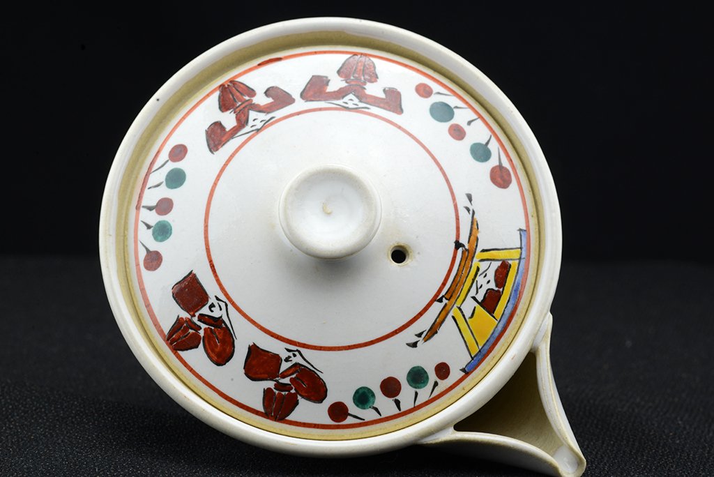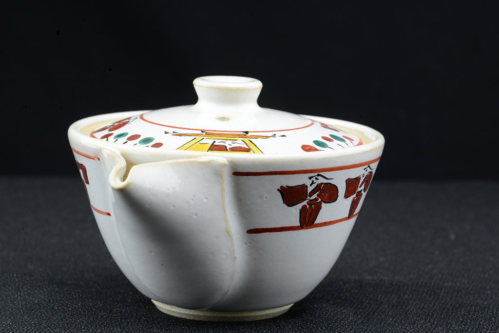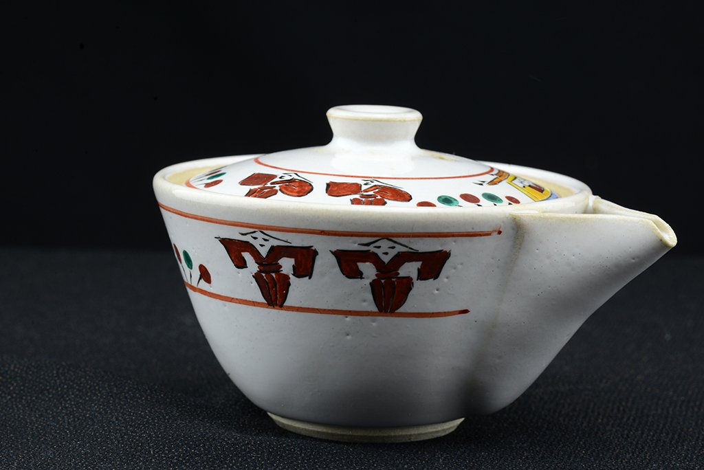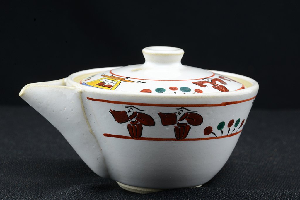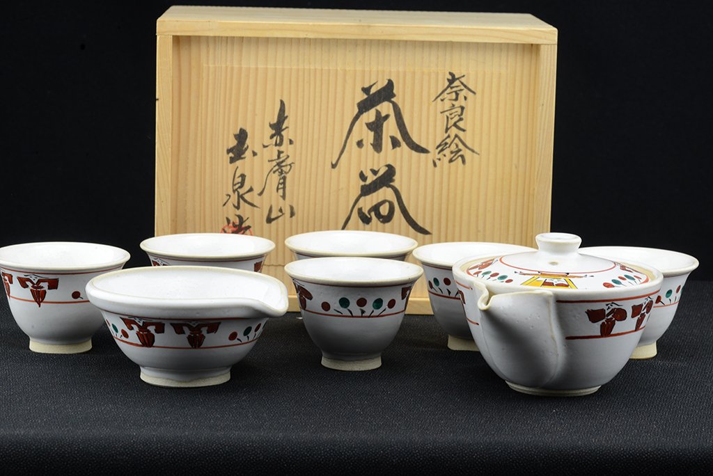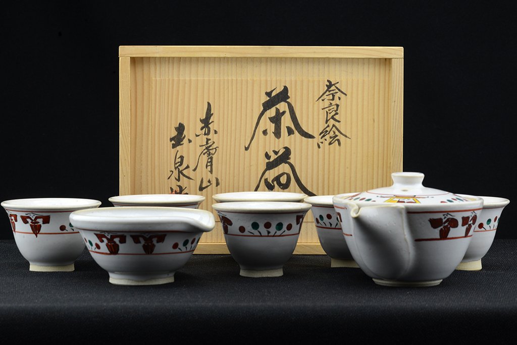 Kézzel festett akahada japán teáskészlet Gyokusen műhelyéből. egy hoihin, egy kiöntő és hat csésze, jelzett dobozban.