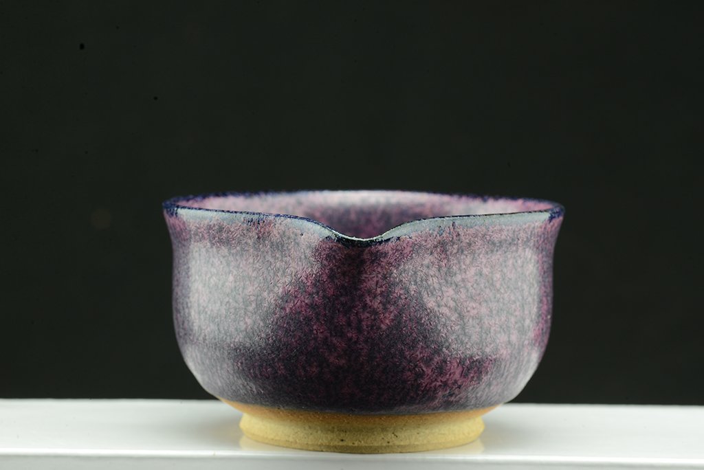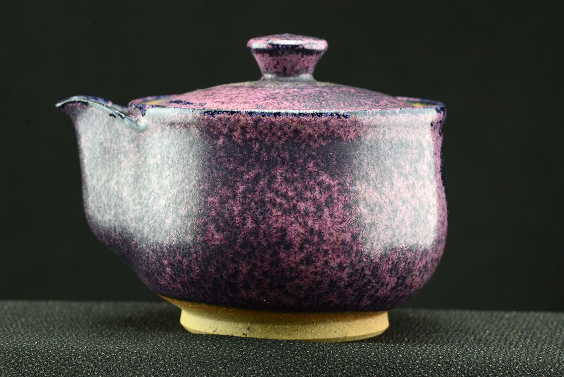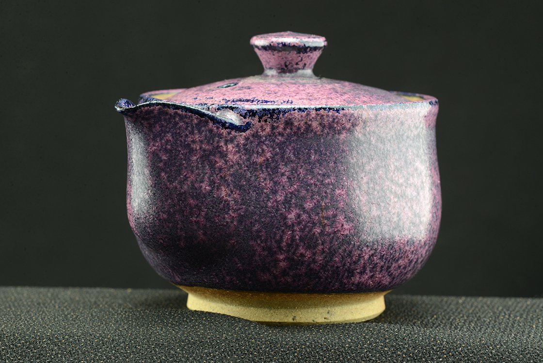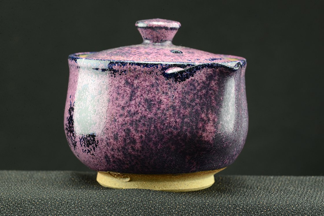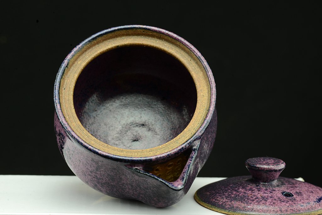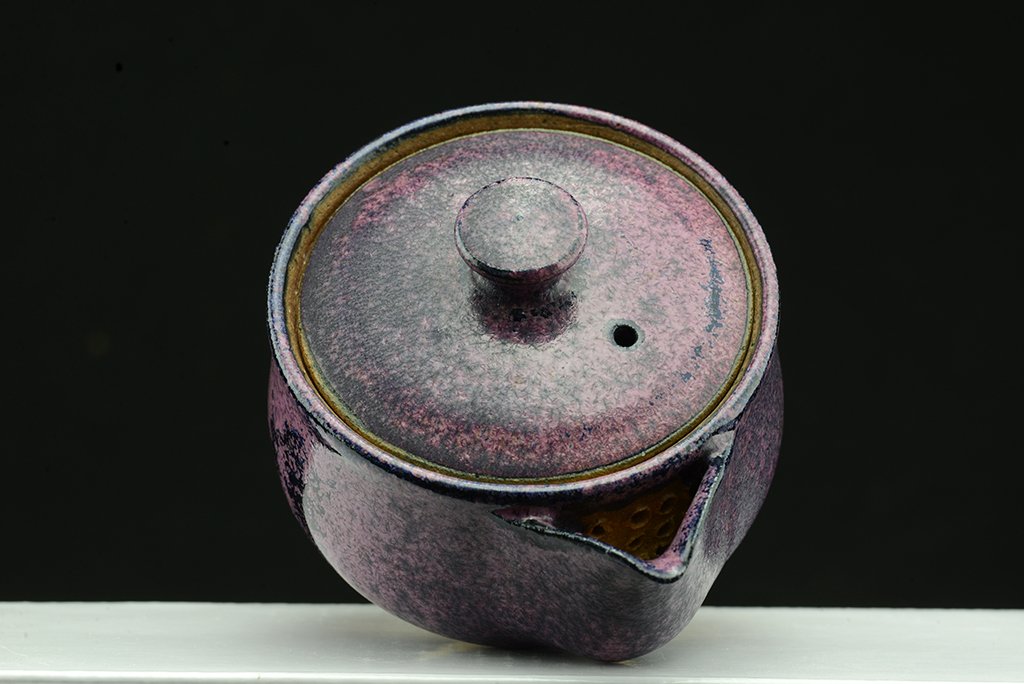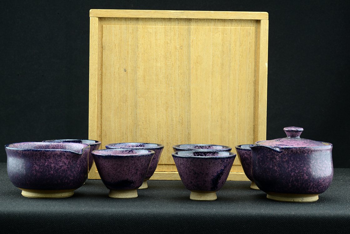 Shino teáskészlet bíbor tenmoku mázzal. A hoihin 130 ml űrtartalmú, egy kiöntő és hat csésze jár hozzá. A málnafagyi különösen jól mutat benne. Főleg sencha és gyokuro elkészítésére tervezték.
