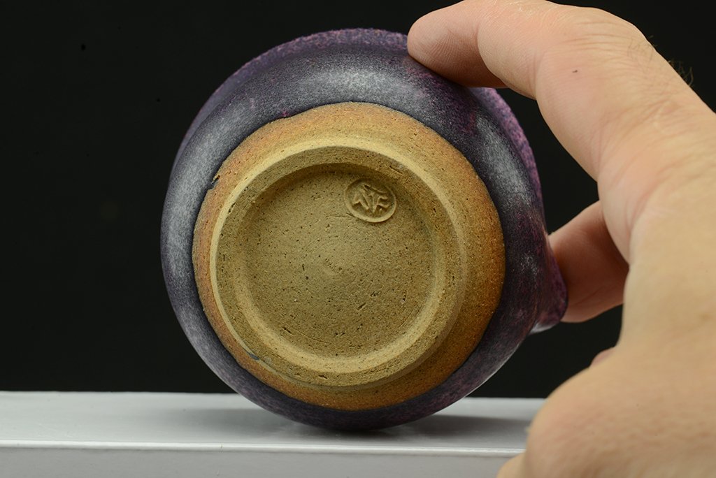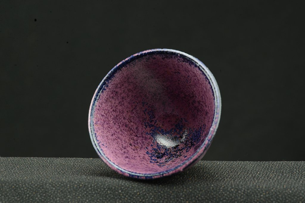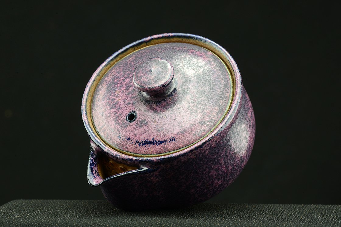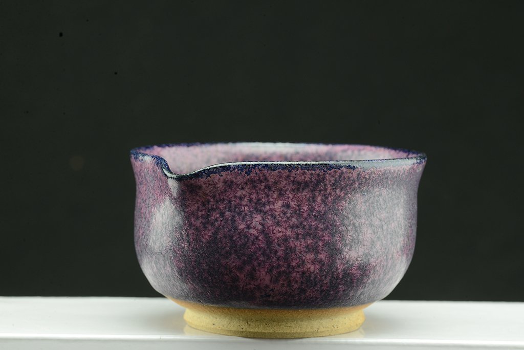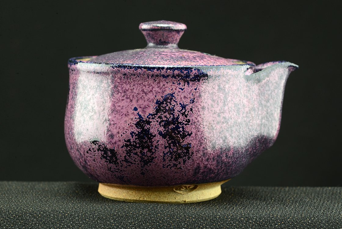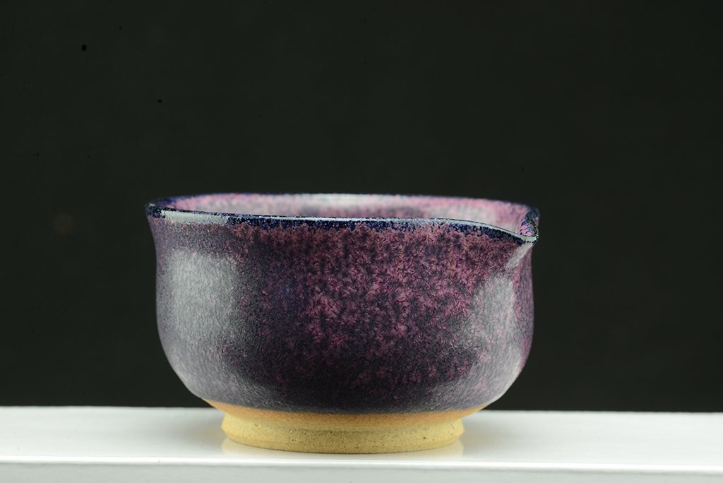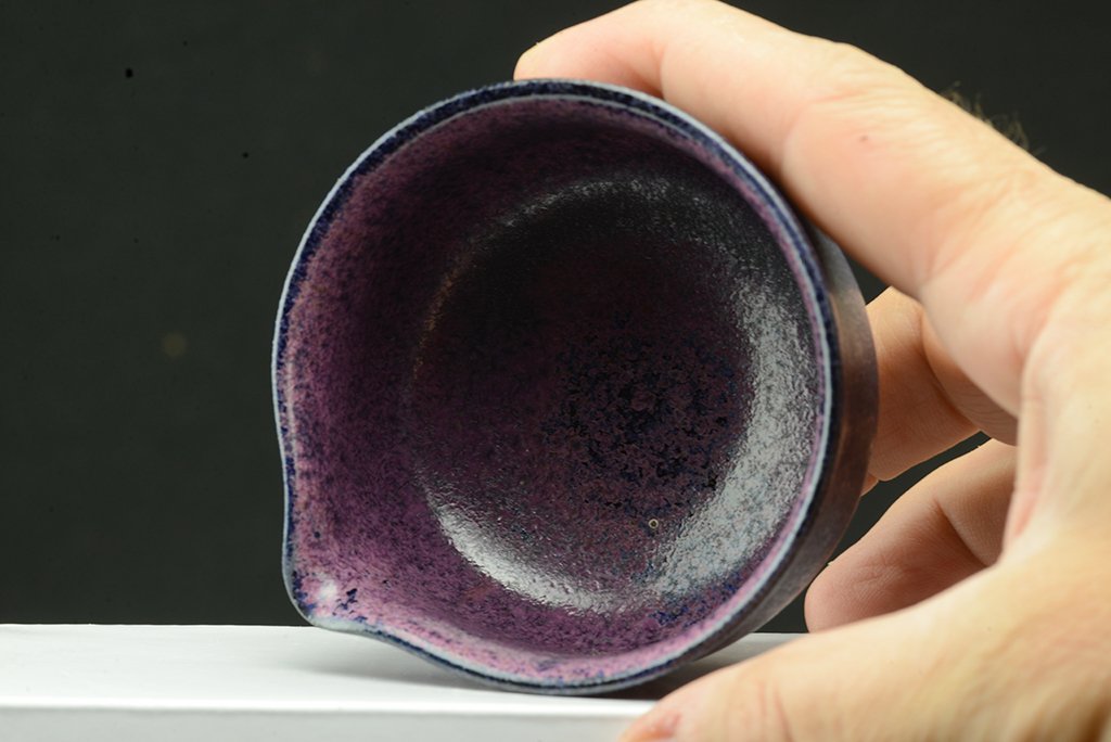 Shino teáskészlet bíbor tenmoku mázzal. A hoihin 130 ml űrtartalmú, egy kiöntő és hat csésze jár hozzá. A málnafagyi különösen jól mutat benne. Főleg sencha és gyokuro elkészítésére tervezték.