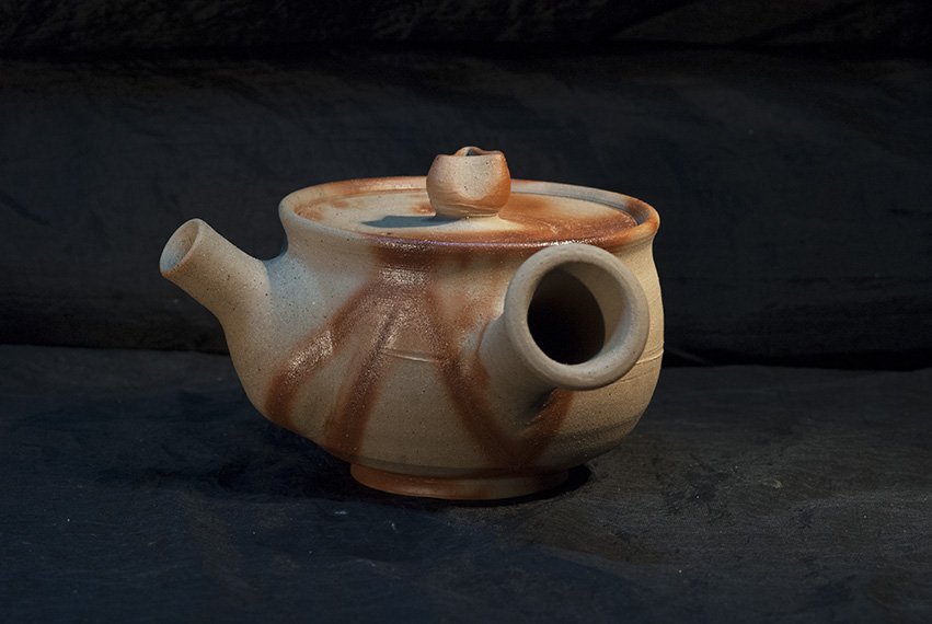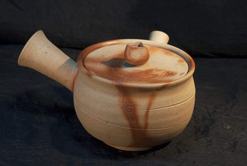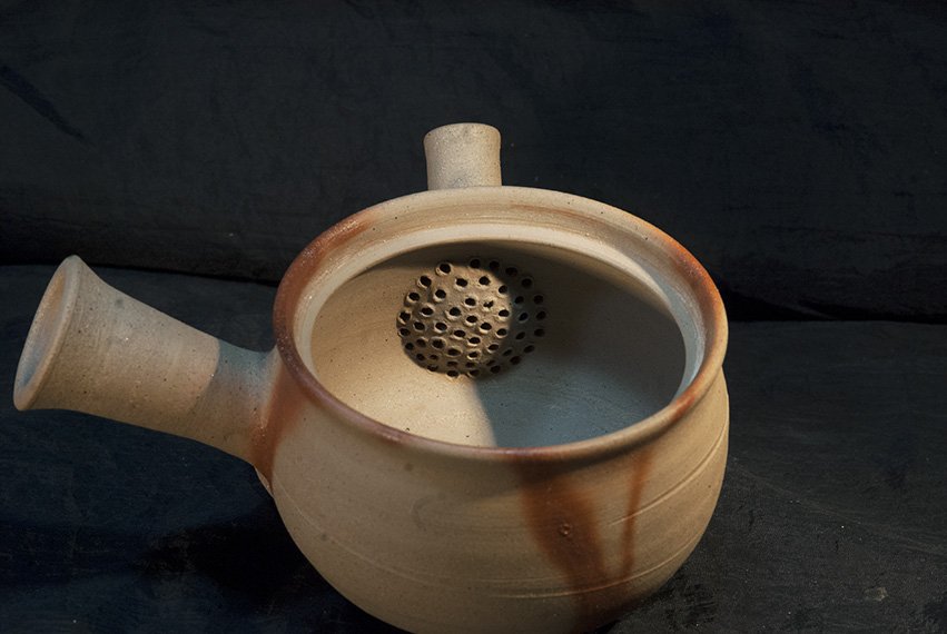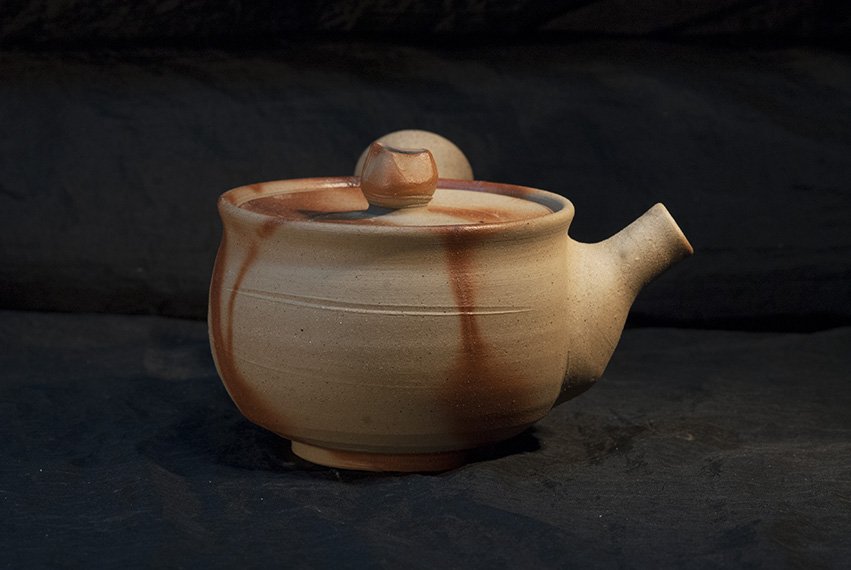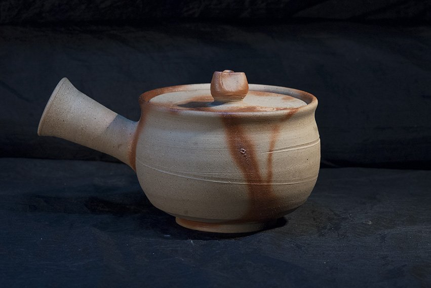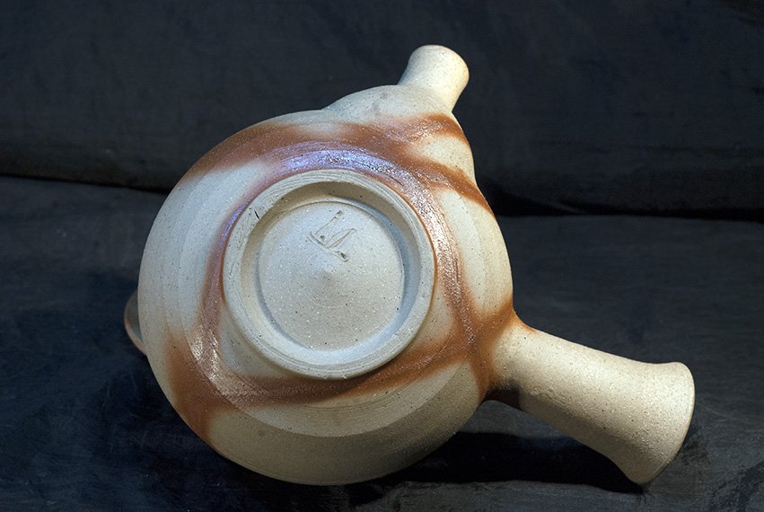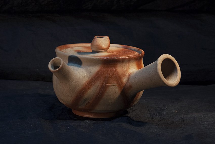 Világos bizen teáskészlet hidasuki mintázattal, amit az égetés előtt a tárgyra kötött, fektetett stb növényi rostok hoznak létre. Egy Kyushu, és öt csésze.