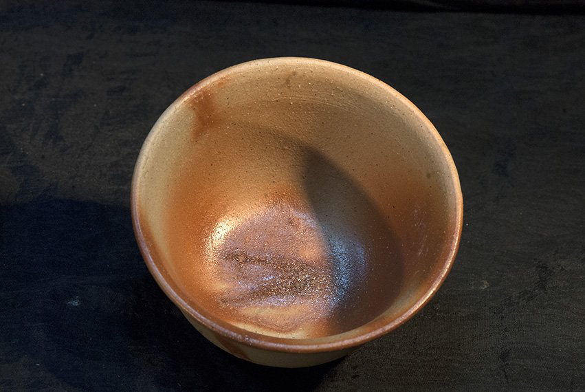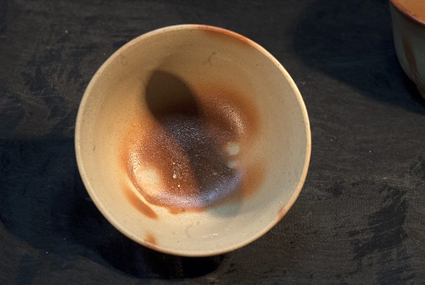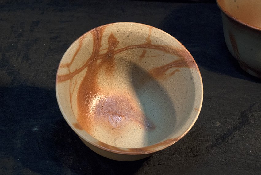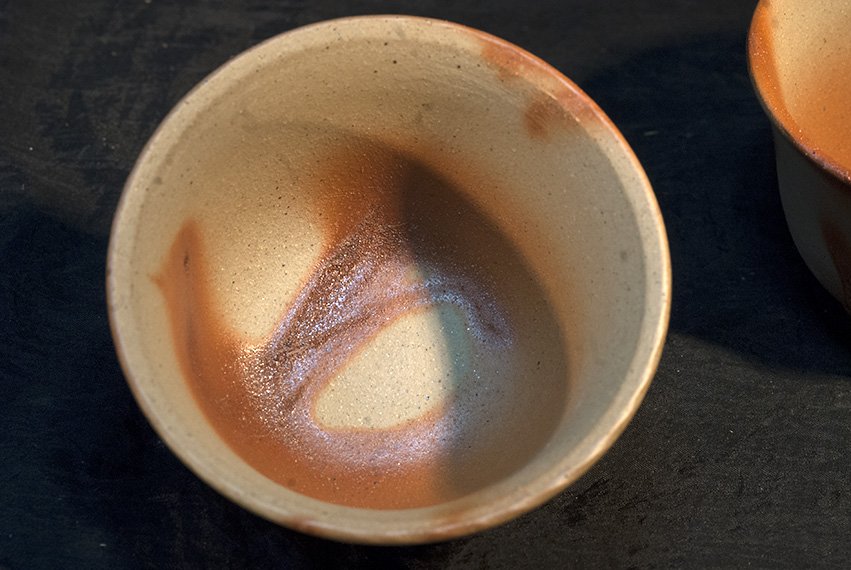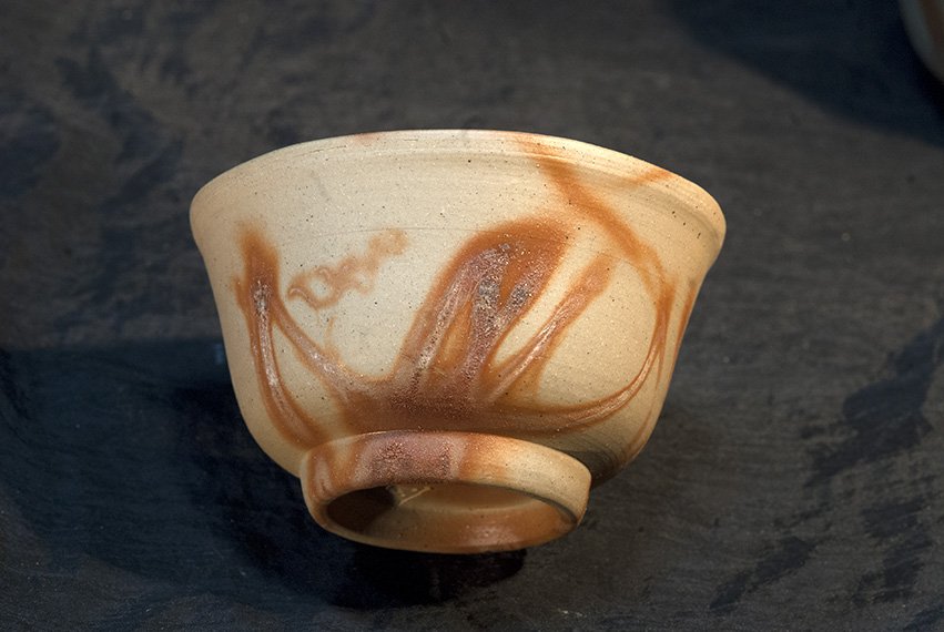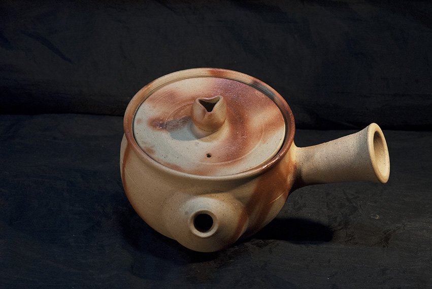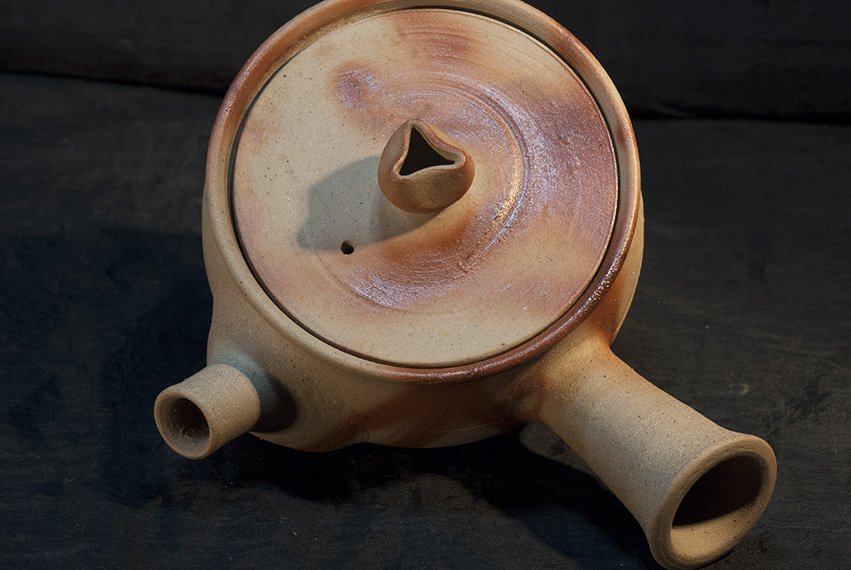 Világos bizen teáskészlet hidasuki mintázattal, amit az égetés előtt a tárgyra kötött, fektetett stb növényi rostok hoznak létre. Egy Kyushu, és öt csésze.