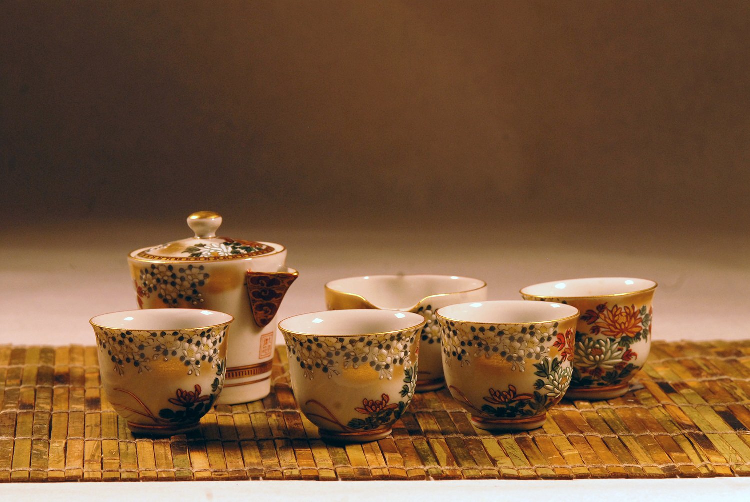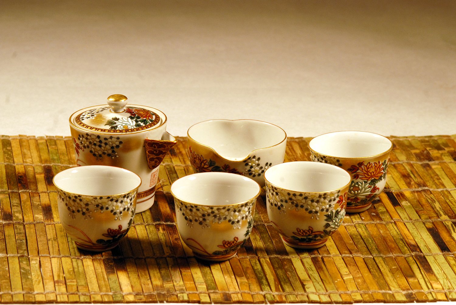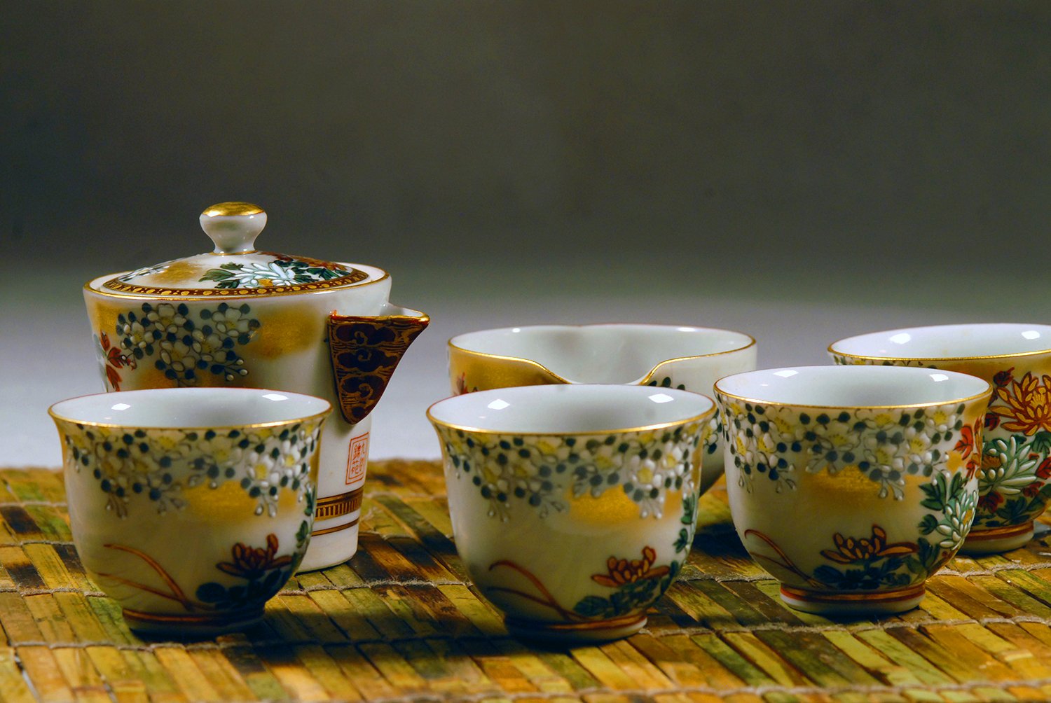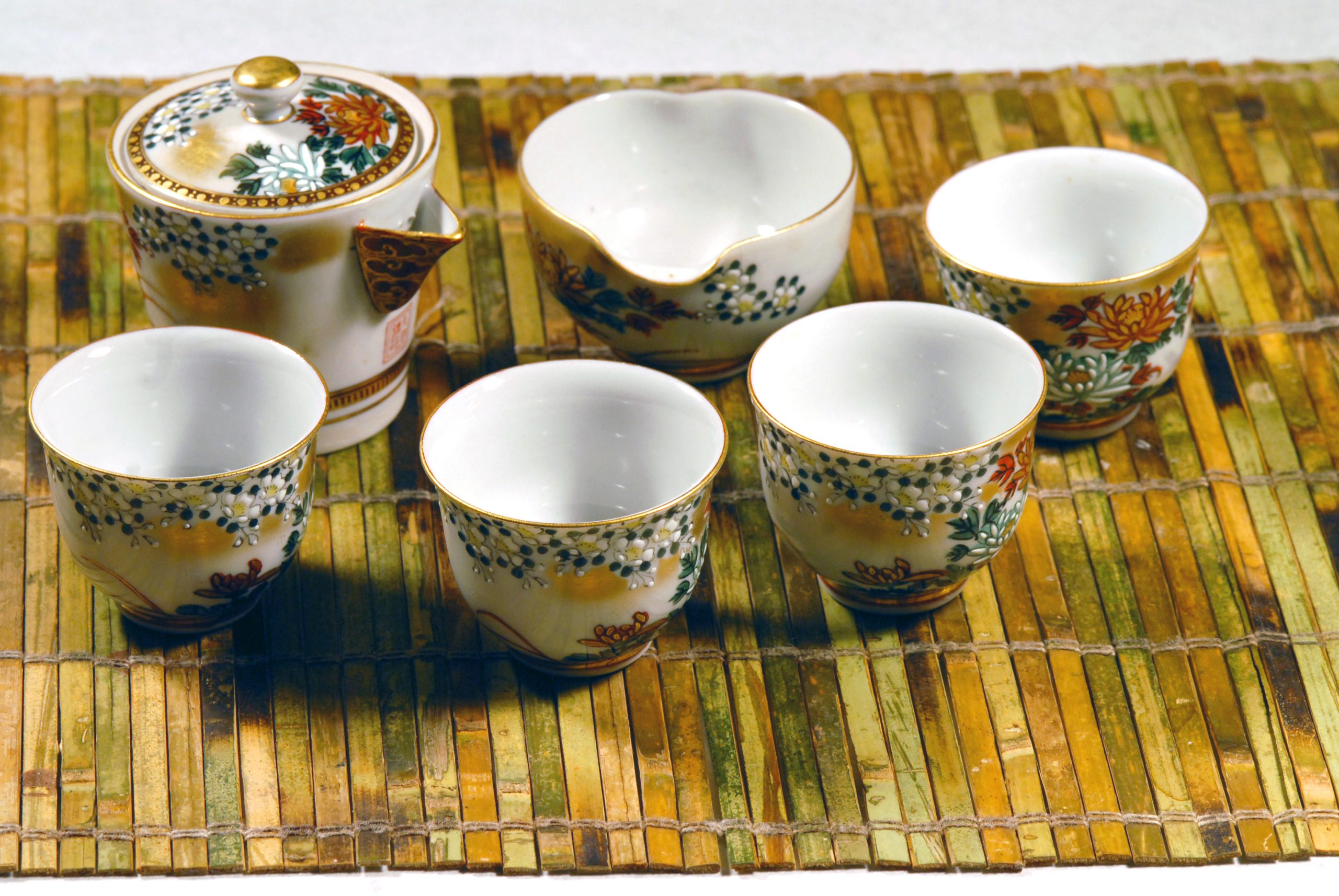 Kézzel festett Kutani teáskészlet egy kis arannyal, hogy minden idilli és értékes legyen.