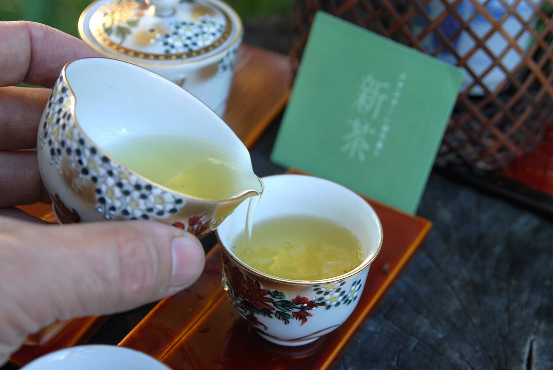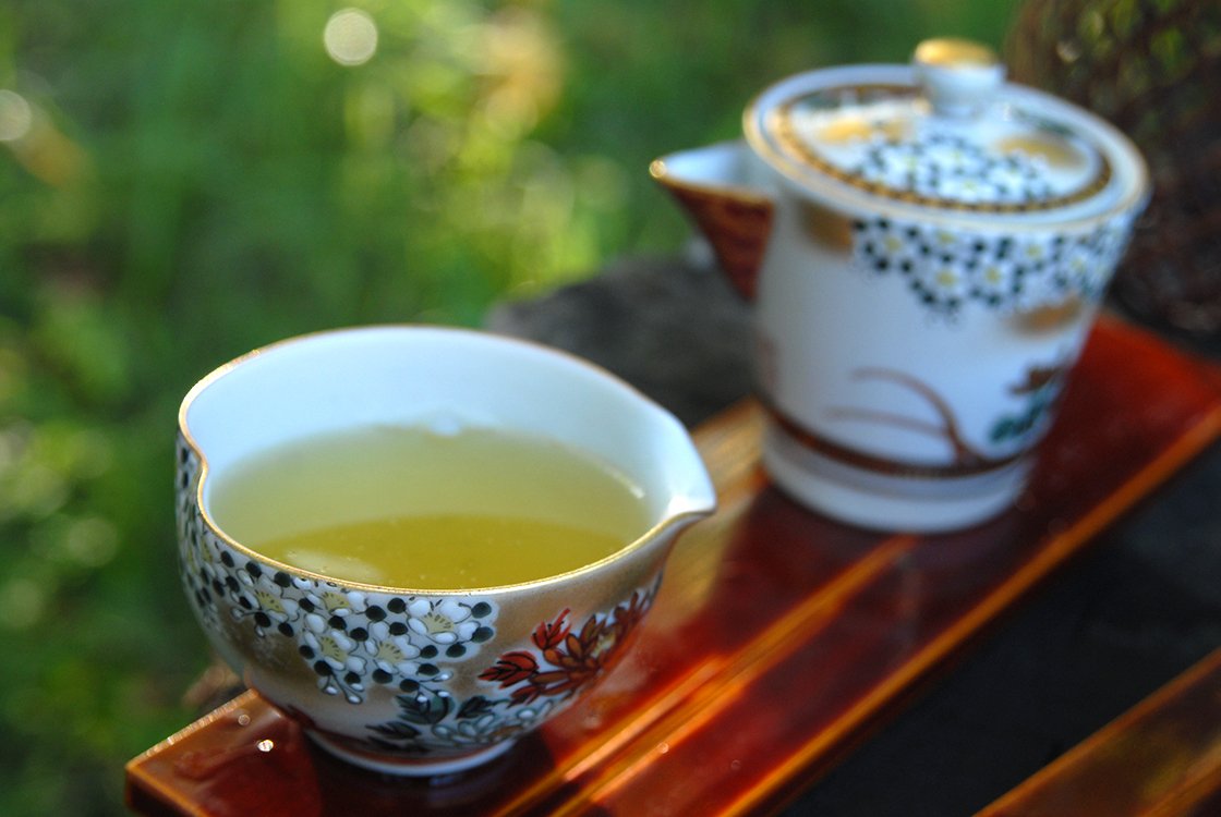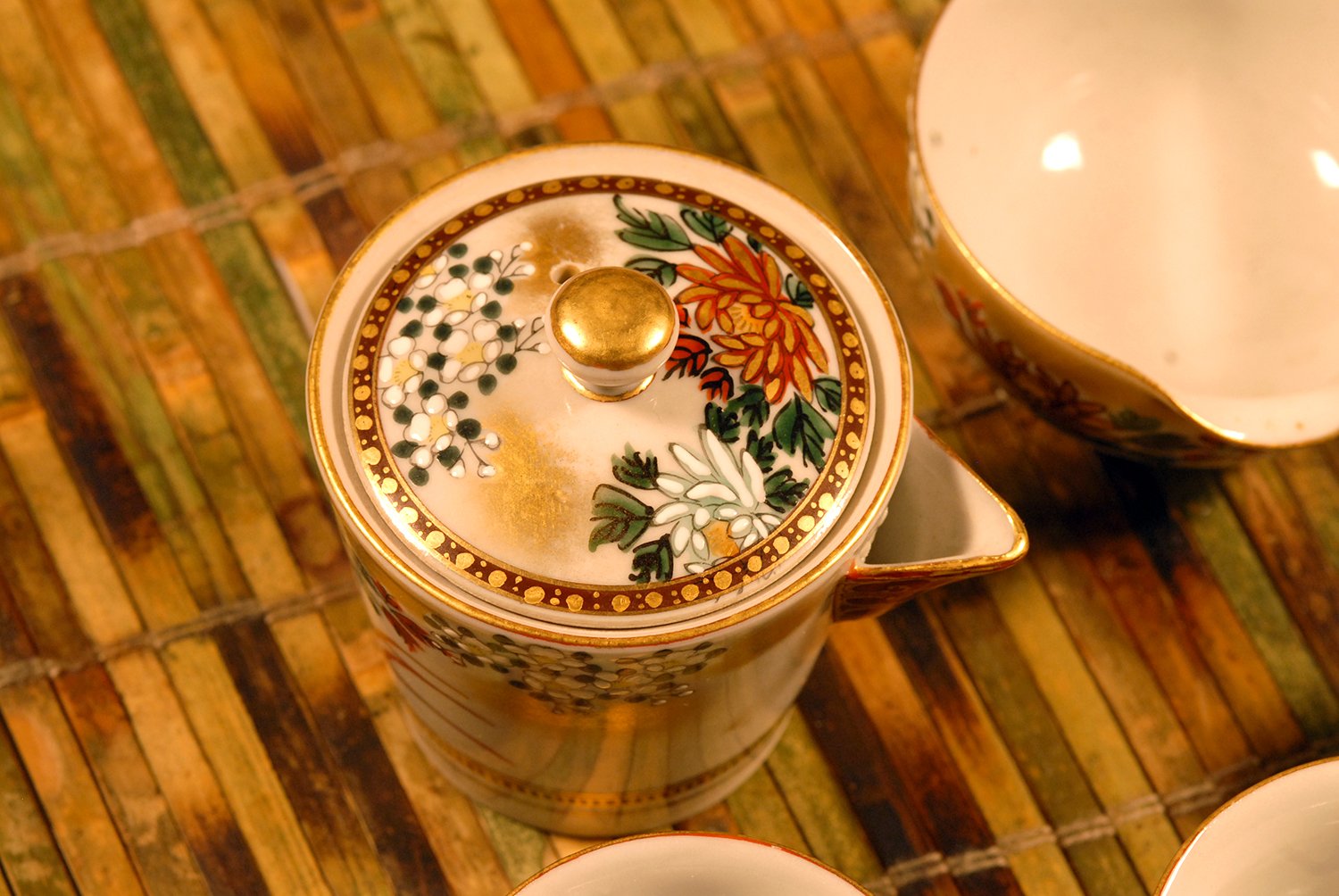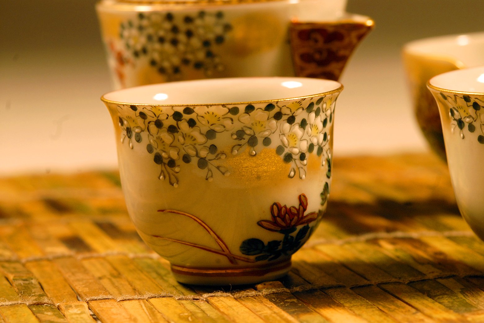 Kézzel festett Kutani teáskészlet egy kis arannyal, hogy minden idilli és értékes legyen.