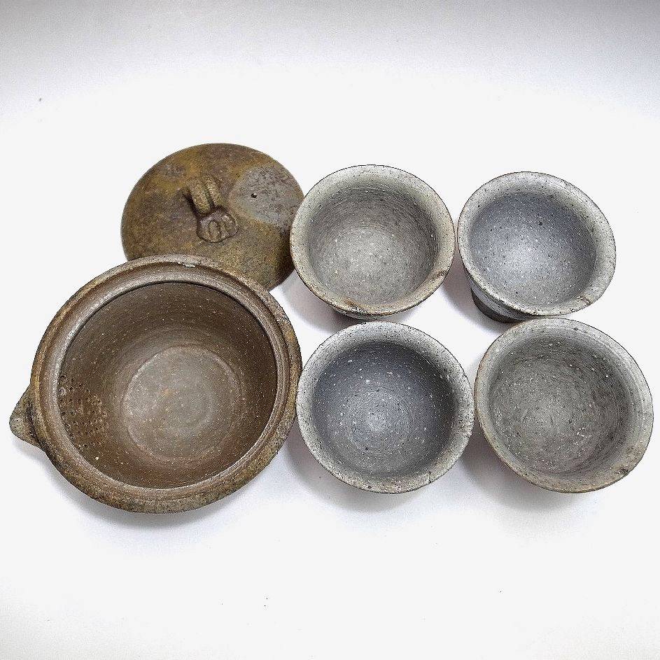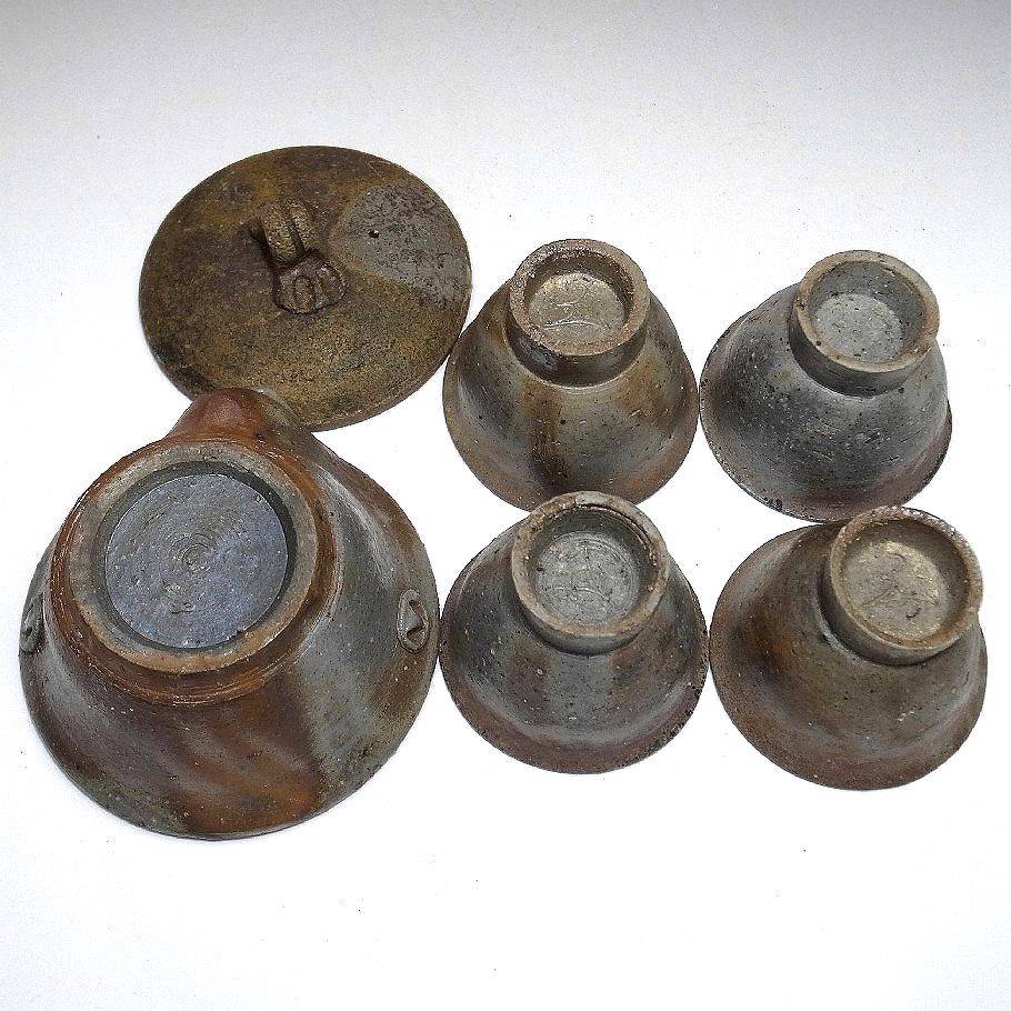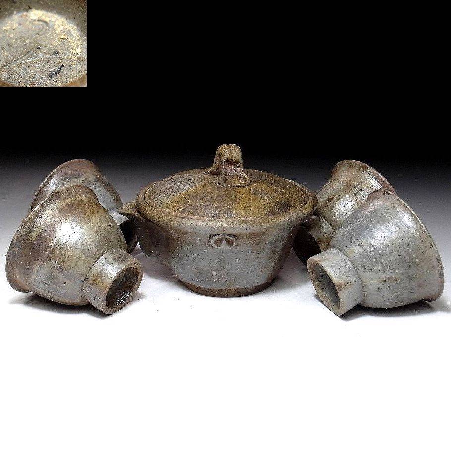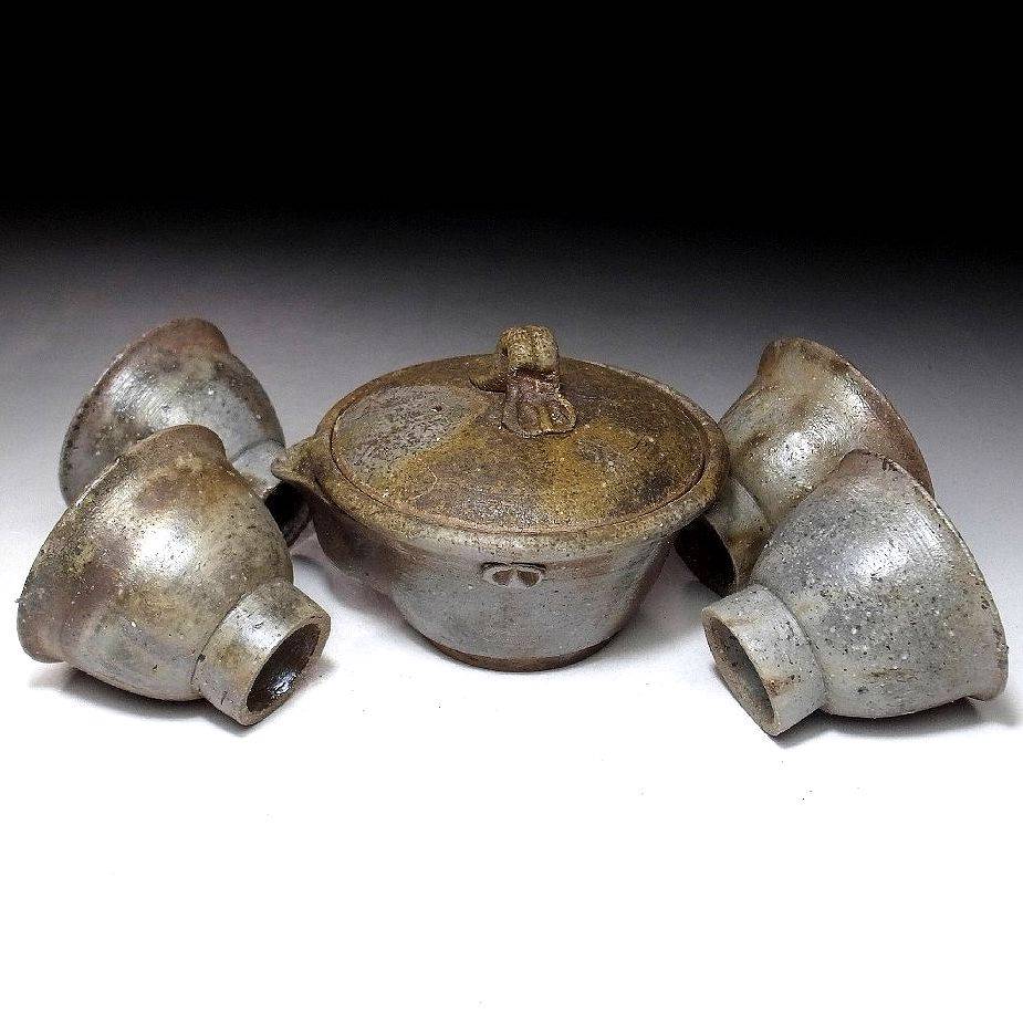 Világos bizen teáskészlet. Hoihin, kiöntővel és öt csésze jelzett fadobozban.