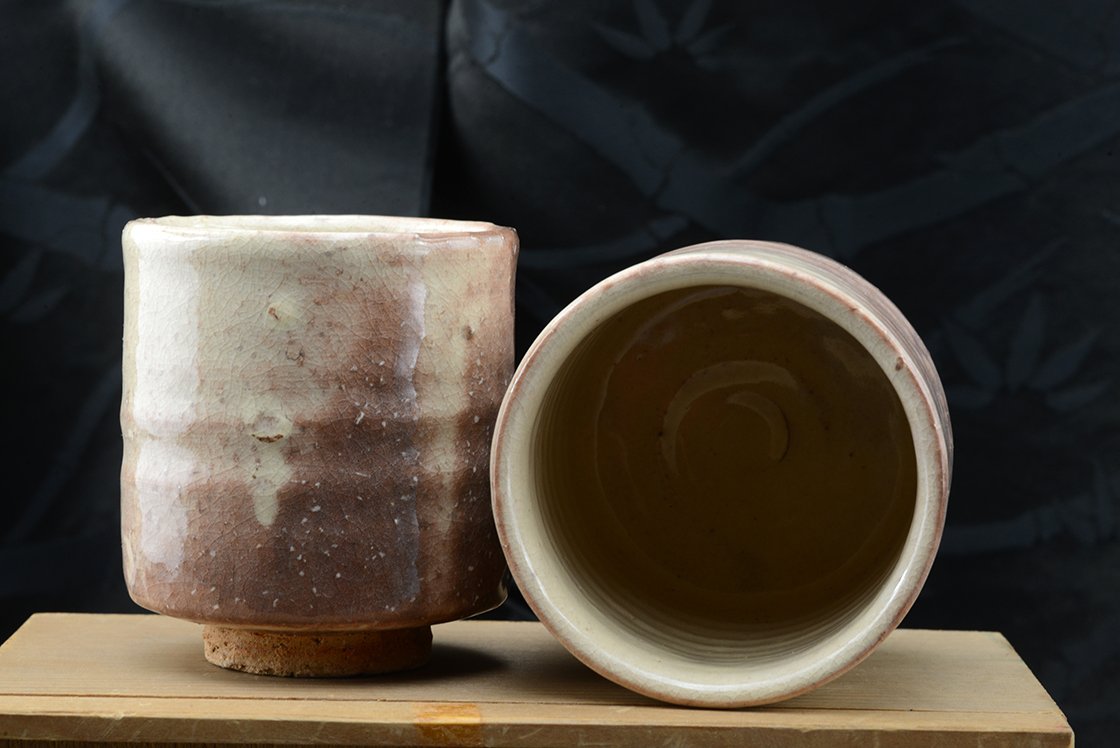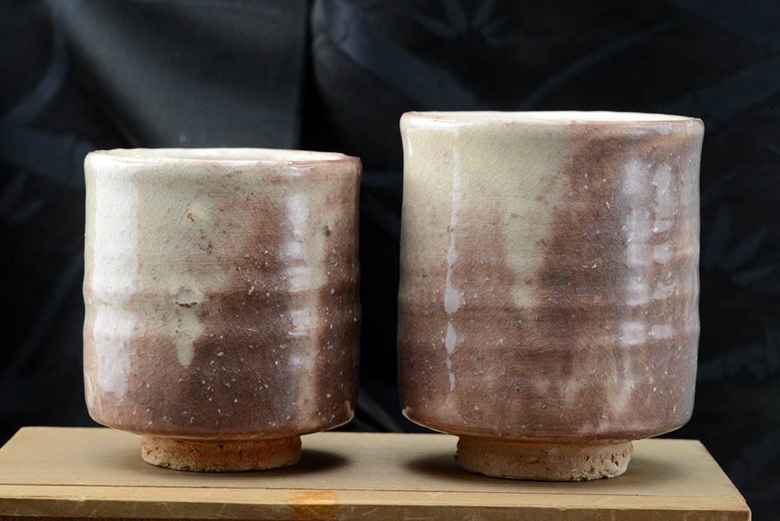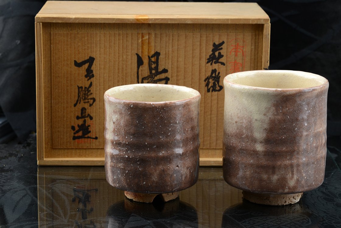Hagi teáscsésze pár Tanga Hirose műhelyéből (1939- ) műhelyéből. A csészepár 9,8 cm magas 8,2 cm széles. Az ár egy párra vonatkozik, saját jelzett fadobozában..