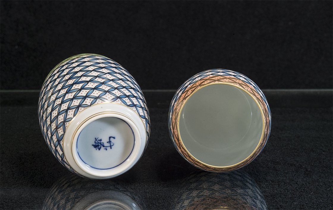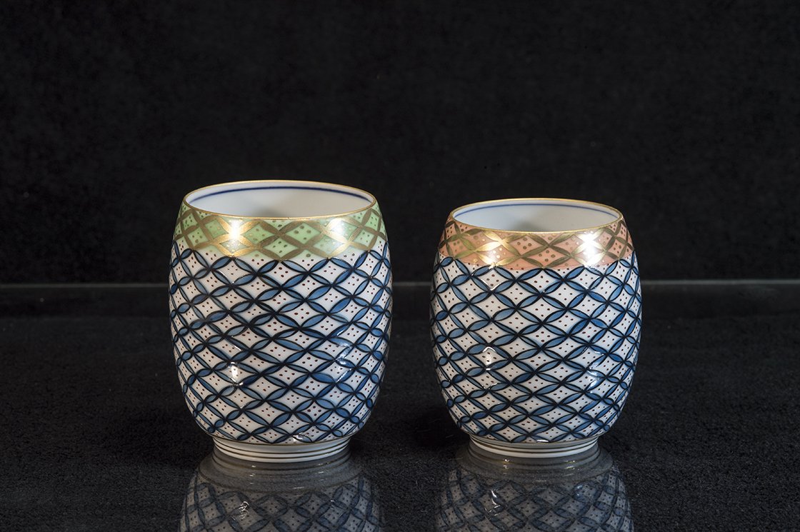 Kézzel festett kyotói porcelán teáscsésze pár. A fiú csésze 8.2 cm magas 6,5 cm átmérőjű, a lány csésze 7,5 cm magas 5,8 cm átmérőjű.