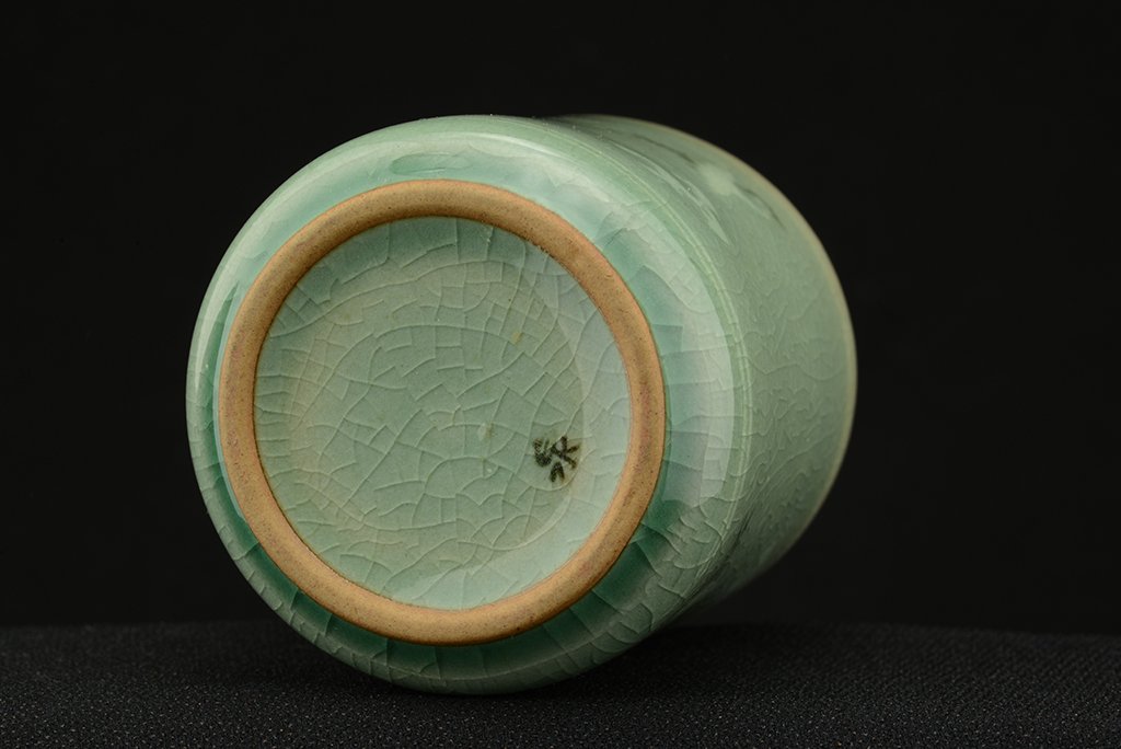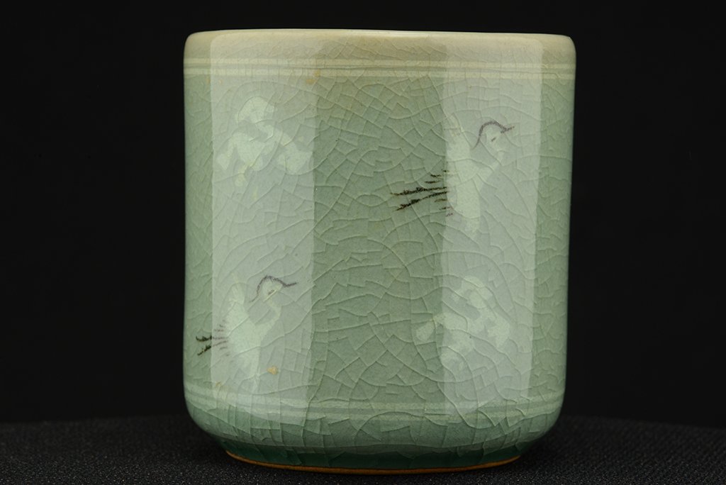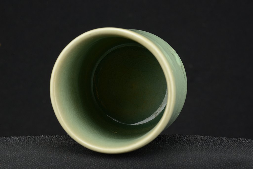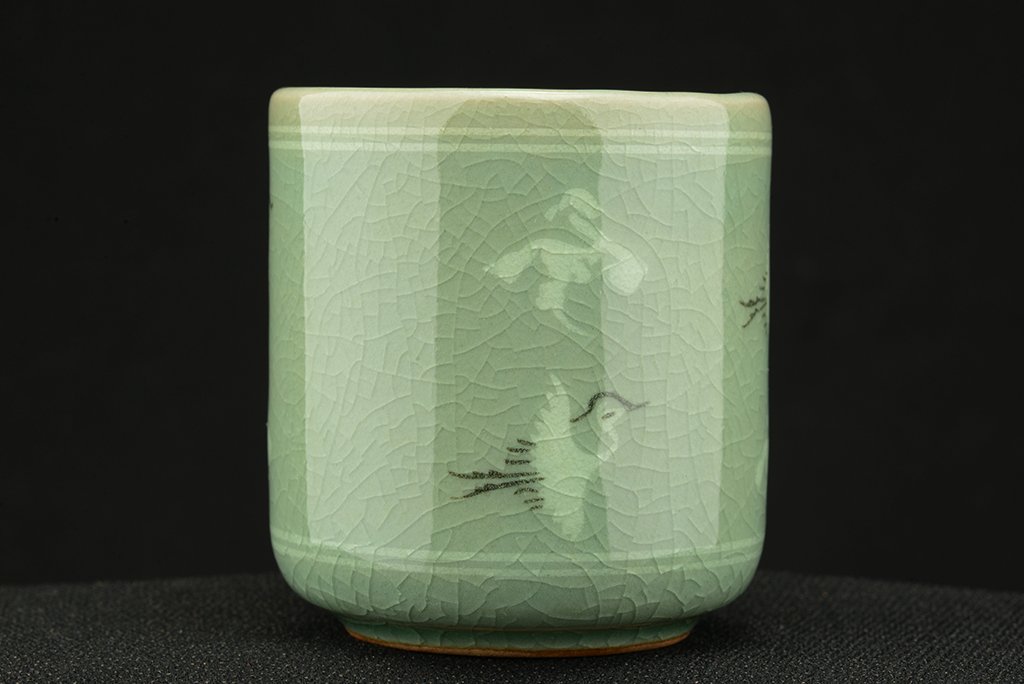 Koreai celadon csészepár mely 8.0 / 7.0 cm magas és 7.0 / 6.5 cm átmérőjű Lee Yeon-Tae műhelyéből. A remek celadon csészéken a hagyományos daruábrázolás, ami mindig ugyanaz és mégis mindig más.