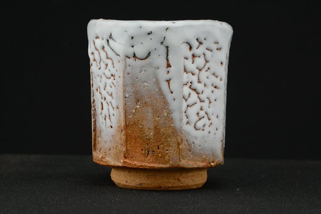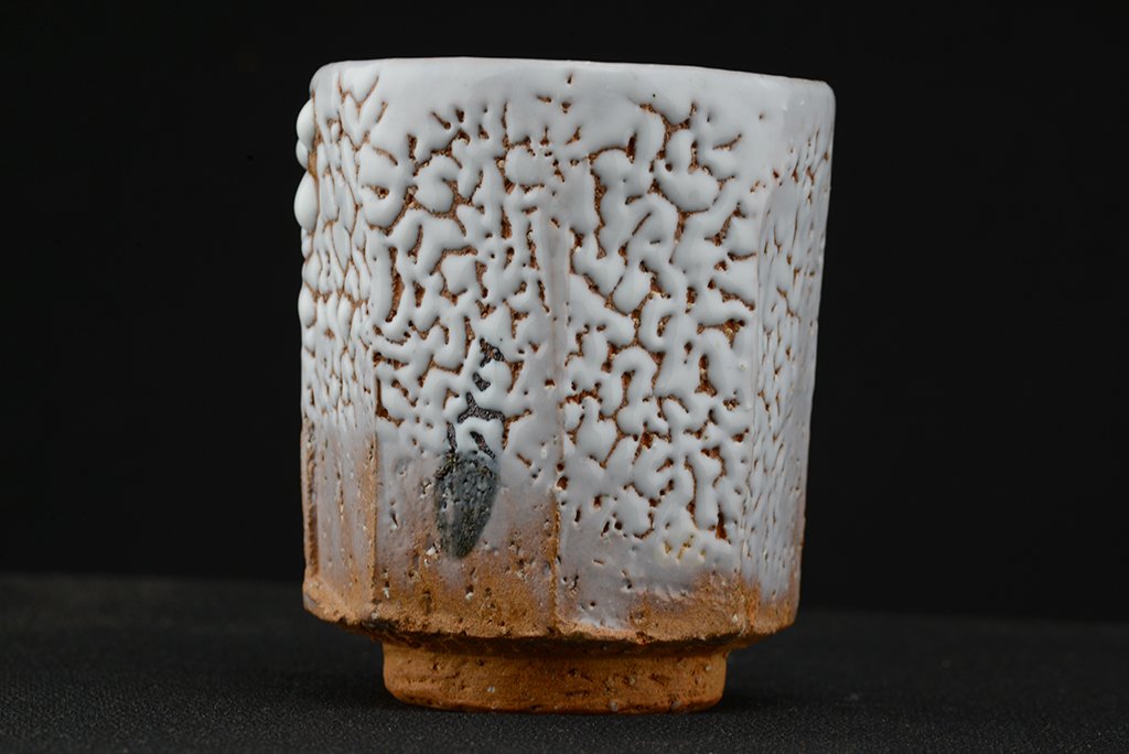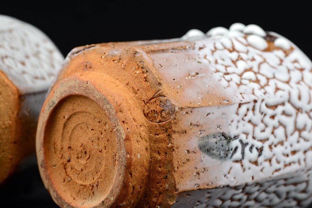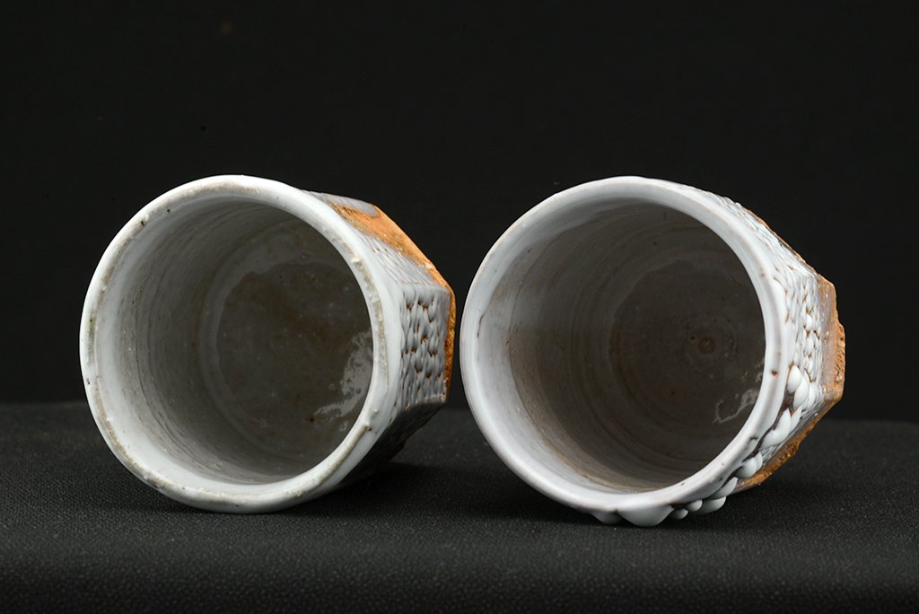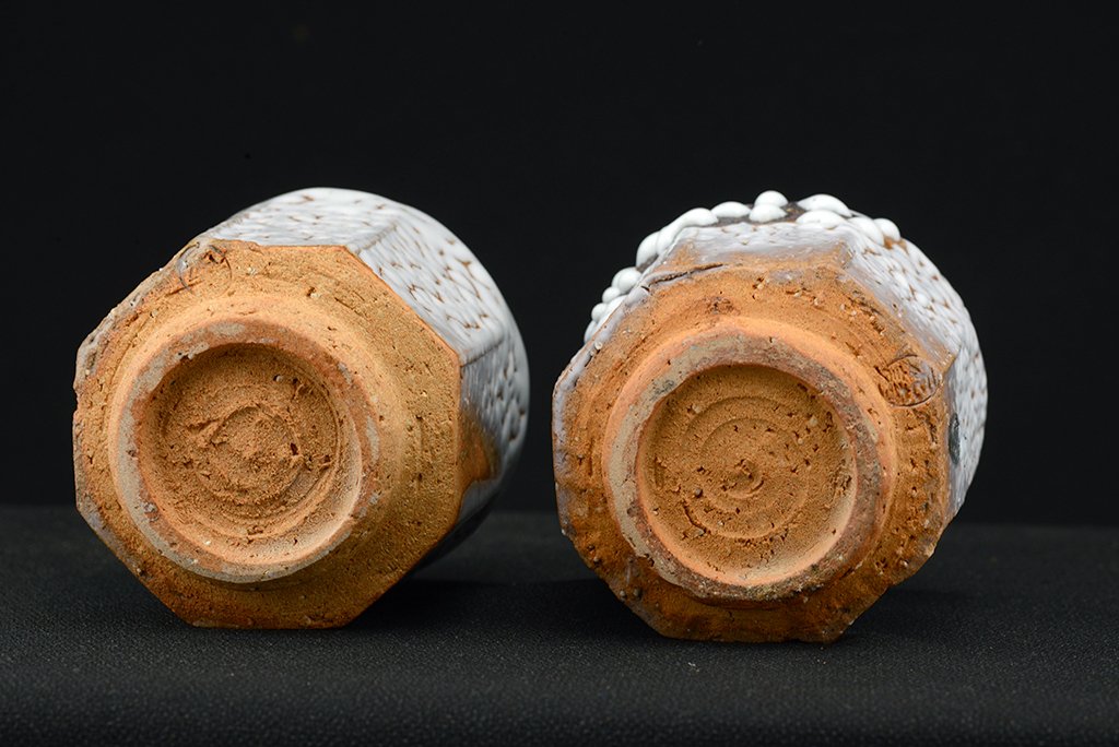 Shibuya Deishi 渋谷泥詩 műhelyében (Odaiba műhely 御台場窯) készült Oni Hagi Yunomi teáscsésze pár. A nagyobbik csésze 7.5 cm x 9.0 cm,  a kisebbik 7,0 cm x 8.4 cm.