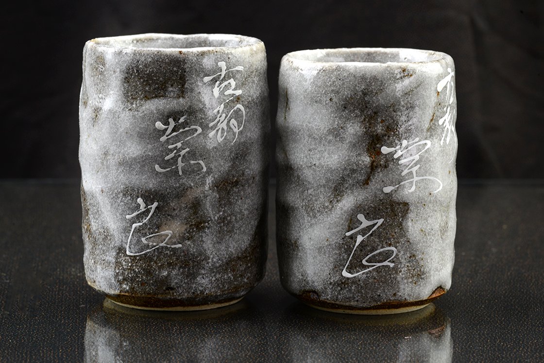 Kalligráfiával díszített szürke shino teáscsésze pár. A csészepár magassága 9,8 cm, átmérője 6,5 cm, jelzett fadobozban érkezik.