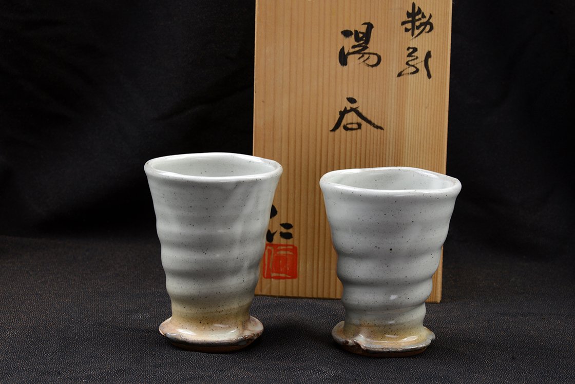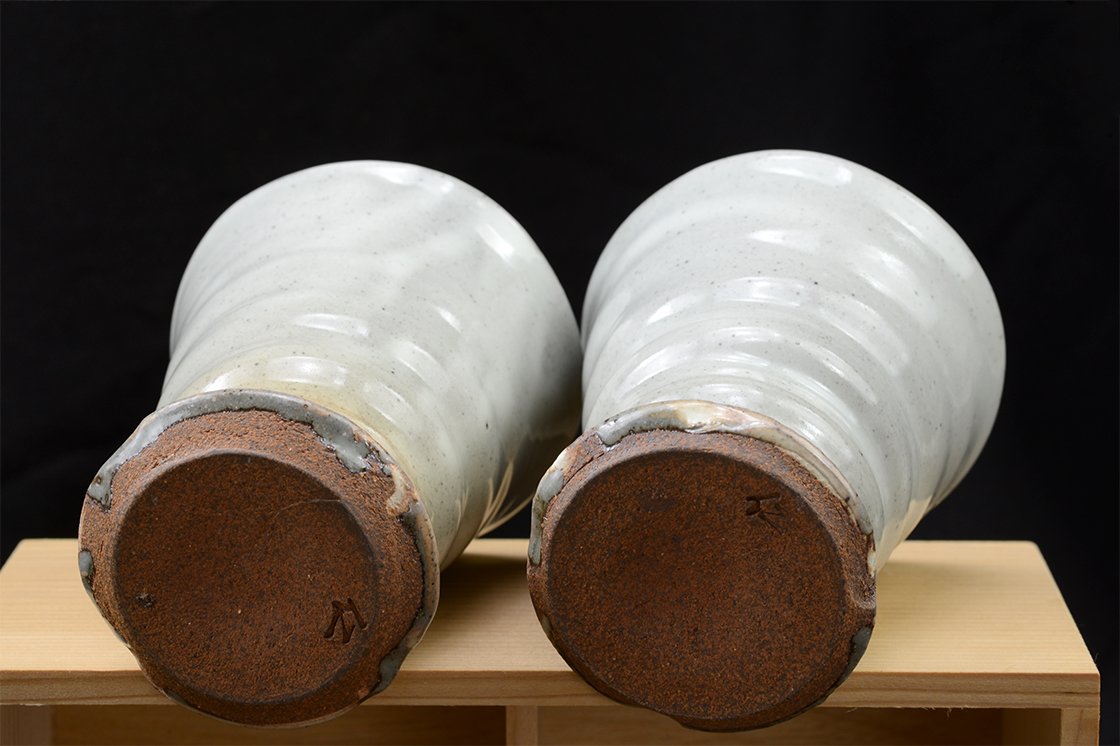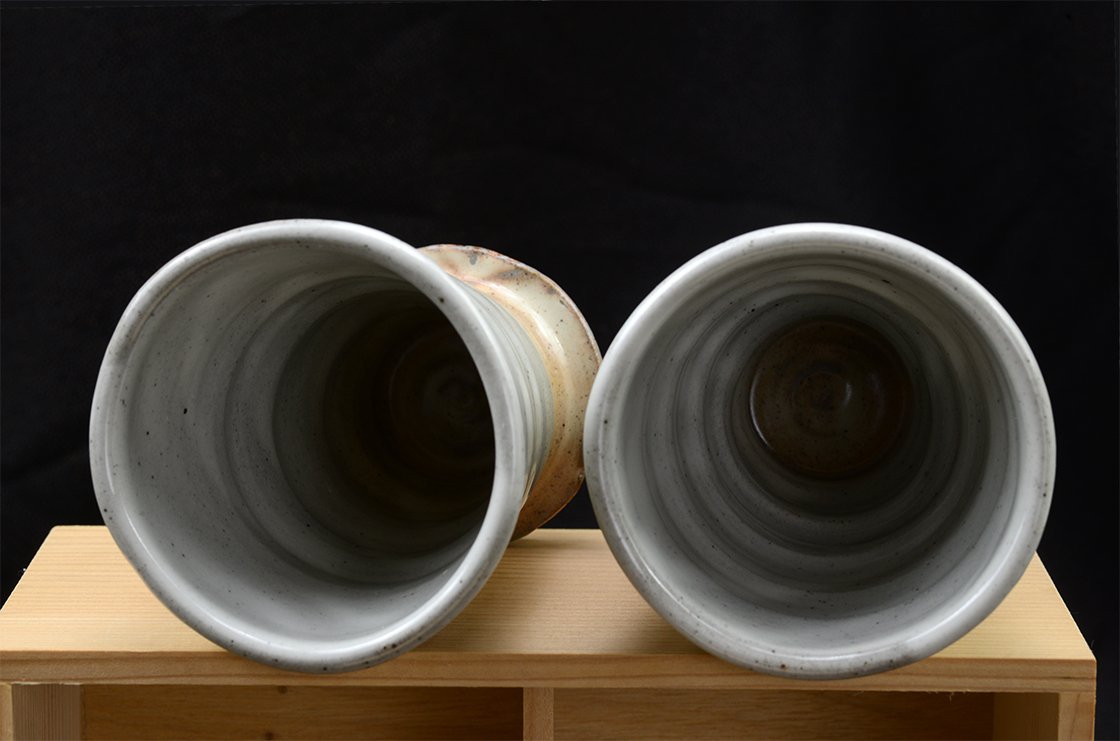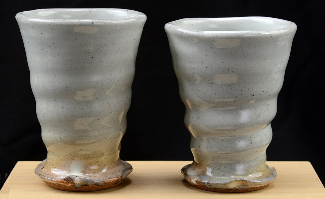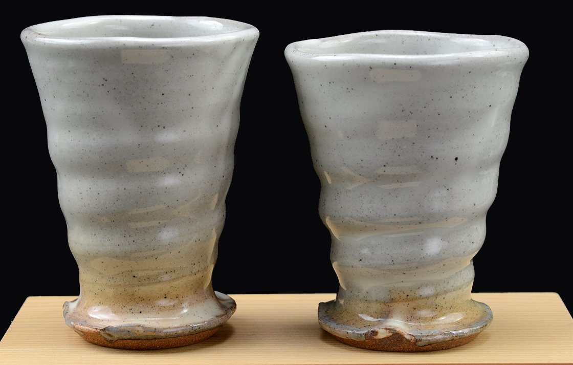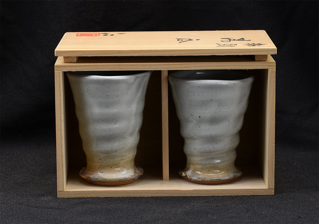 Tokoname kerámia Hitoshi Tanigawa (1952-) műhelyéből. A jegyespár csésze fiú tagja 10,8 x 8 cm, a lány 10,2 cm magas és 7,8 cm átmérőjű.
