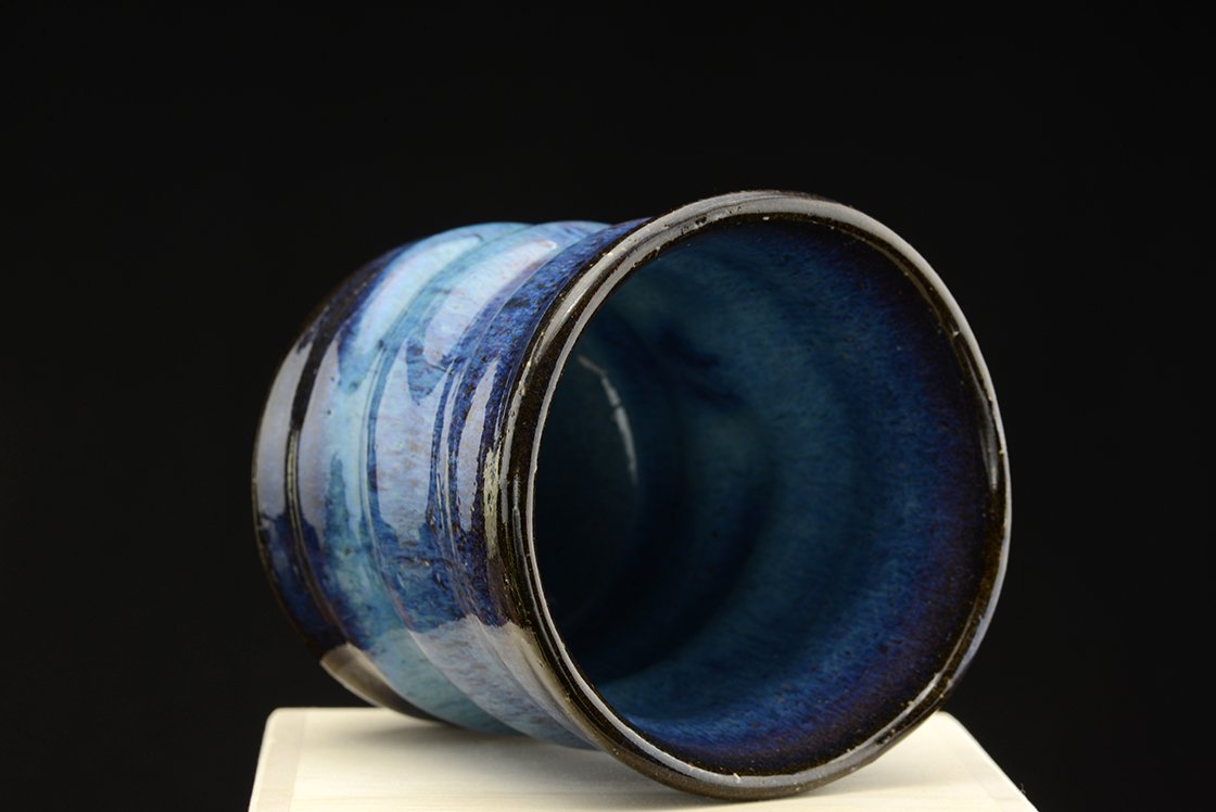 Kobaltkék szerelmes teáscsésze pár Yamane Seigan műhelyéből. A csésze átmérője 9 cm, magassága 11 cm.