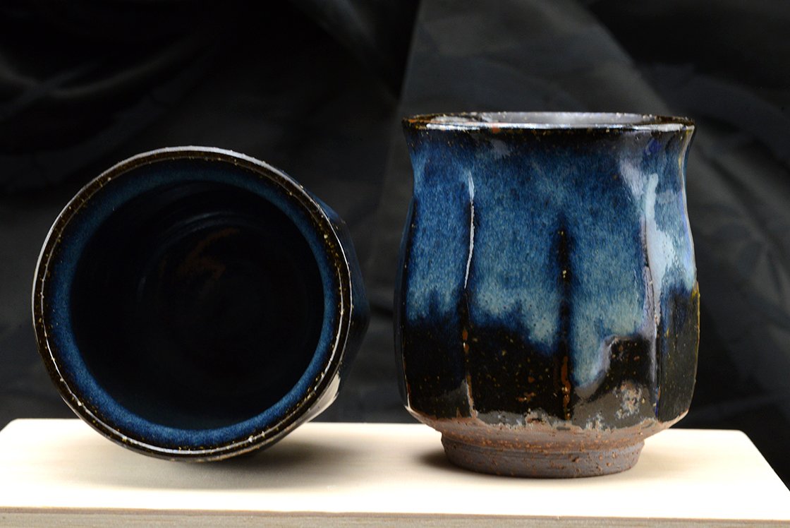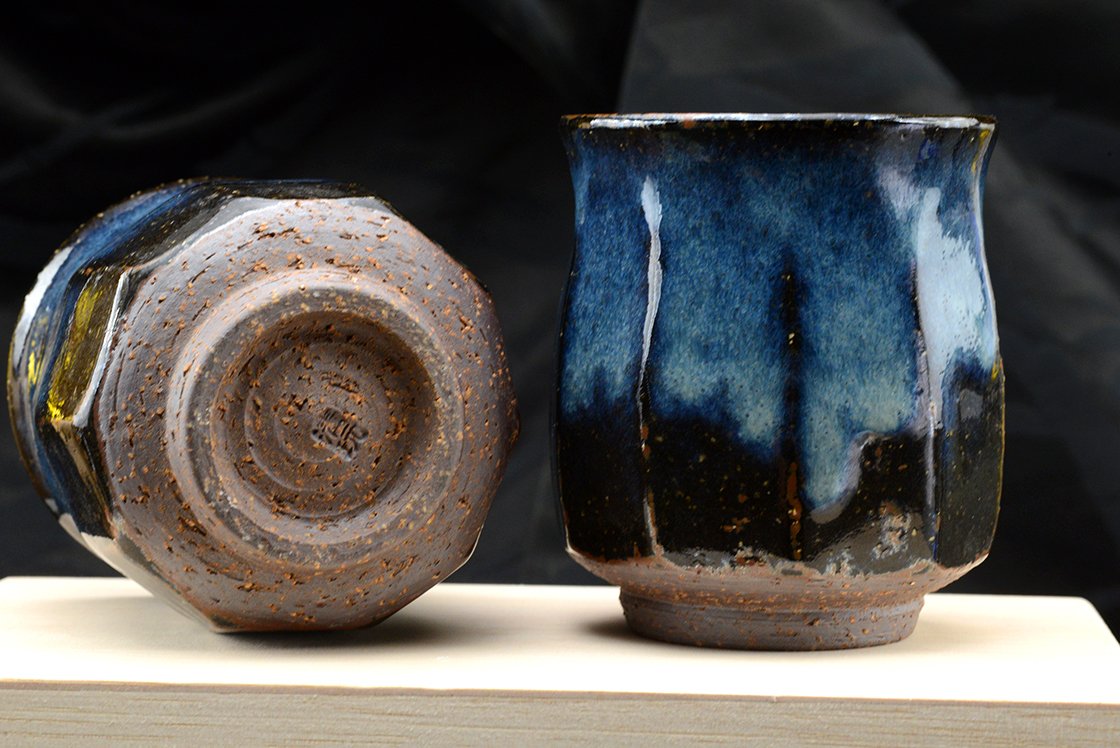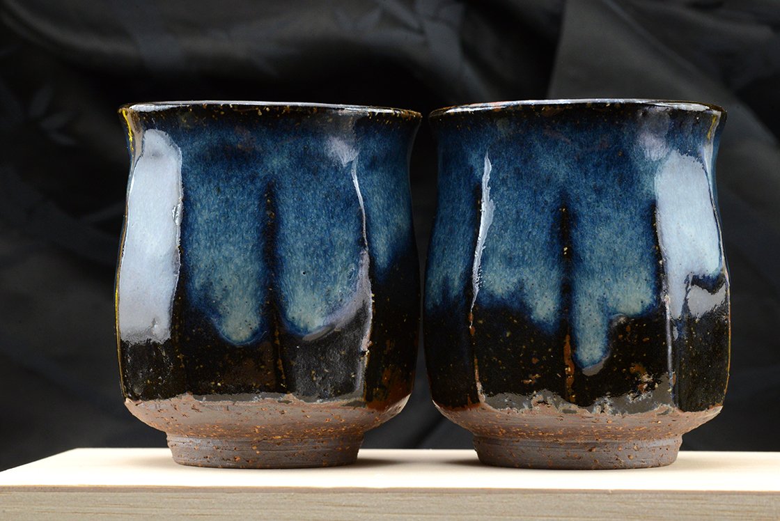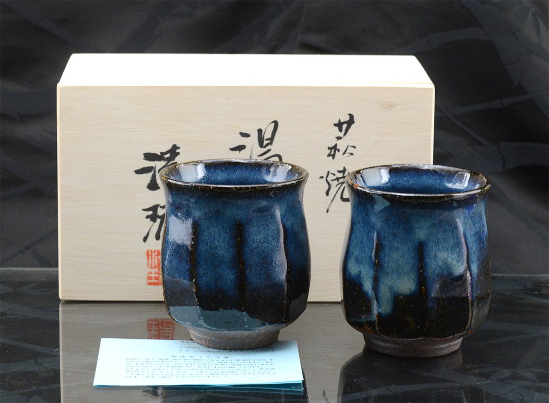 A csészepár Hagi stílusú kerámia, máza kobaltkék Hagi máz, amit a műhely alapítója Yamane Seigan (1952-) talált fel.