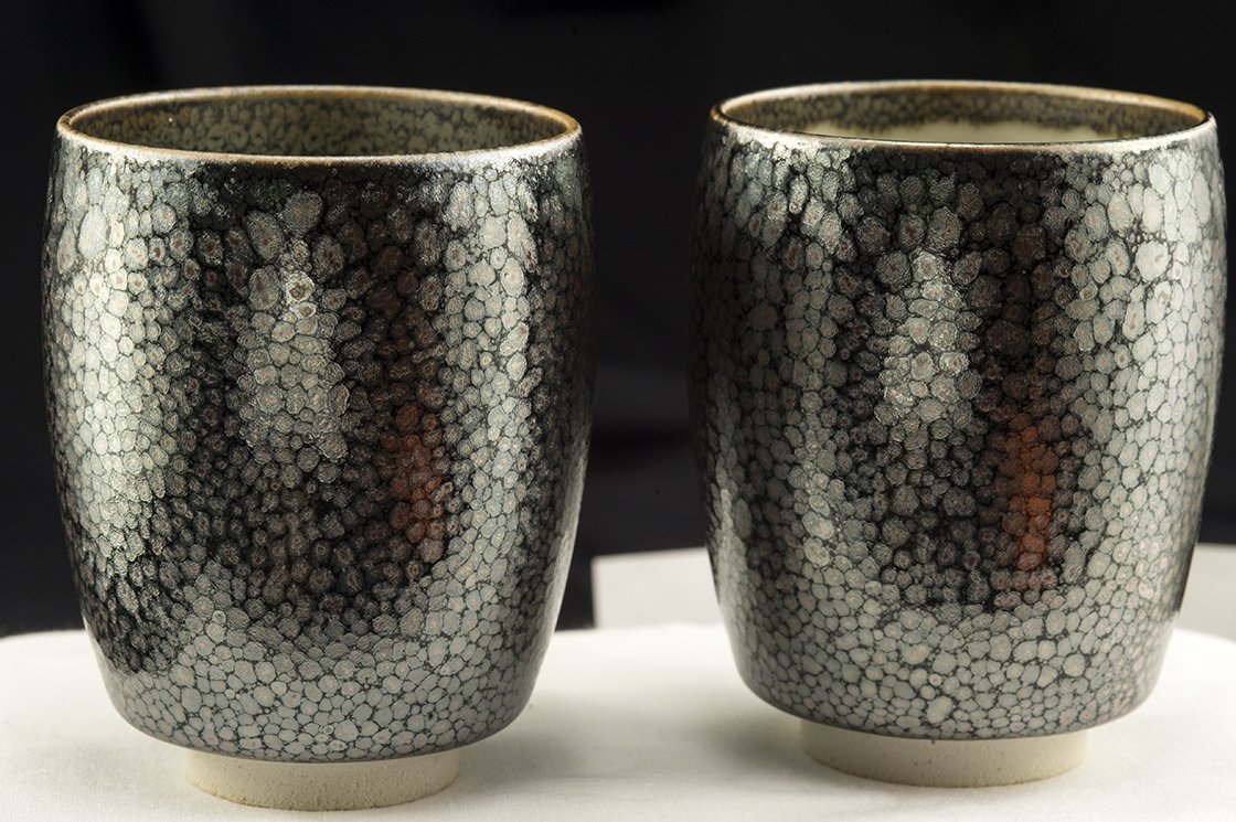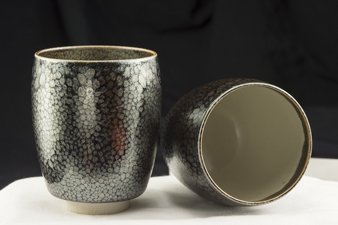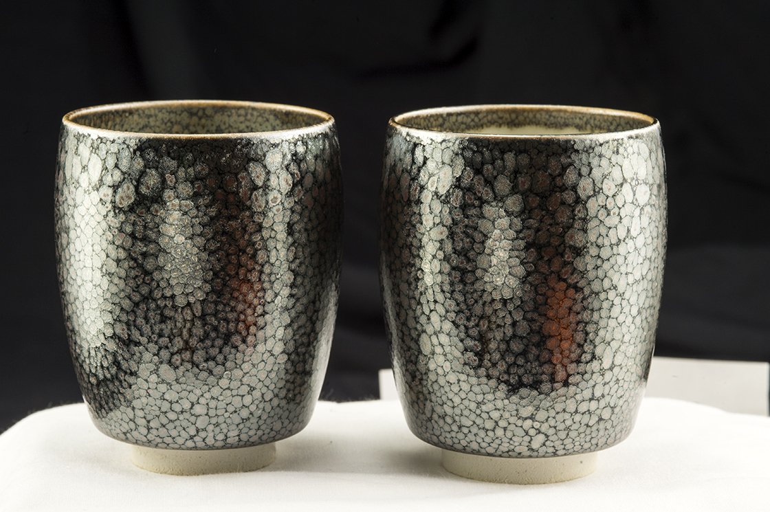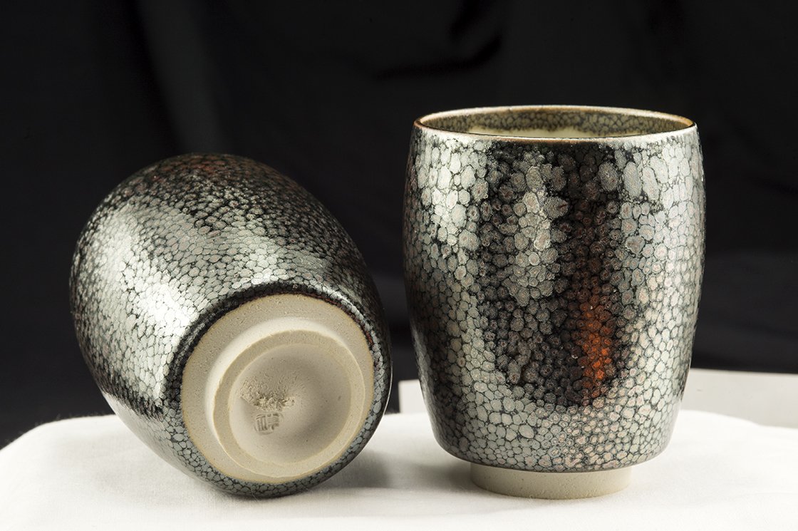 Rendszeres vendége és díjazottja a különféle kézműves kiállításoknak.  A csészepár a fémes juteki tenmoku máz gyönyörű példája. Nem tévesztendő össze a manapság felbukkanó olcsó kínai utánzatokkal.