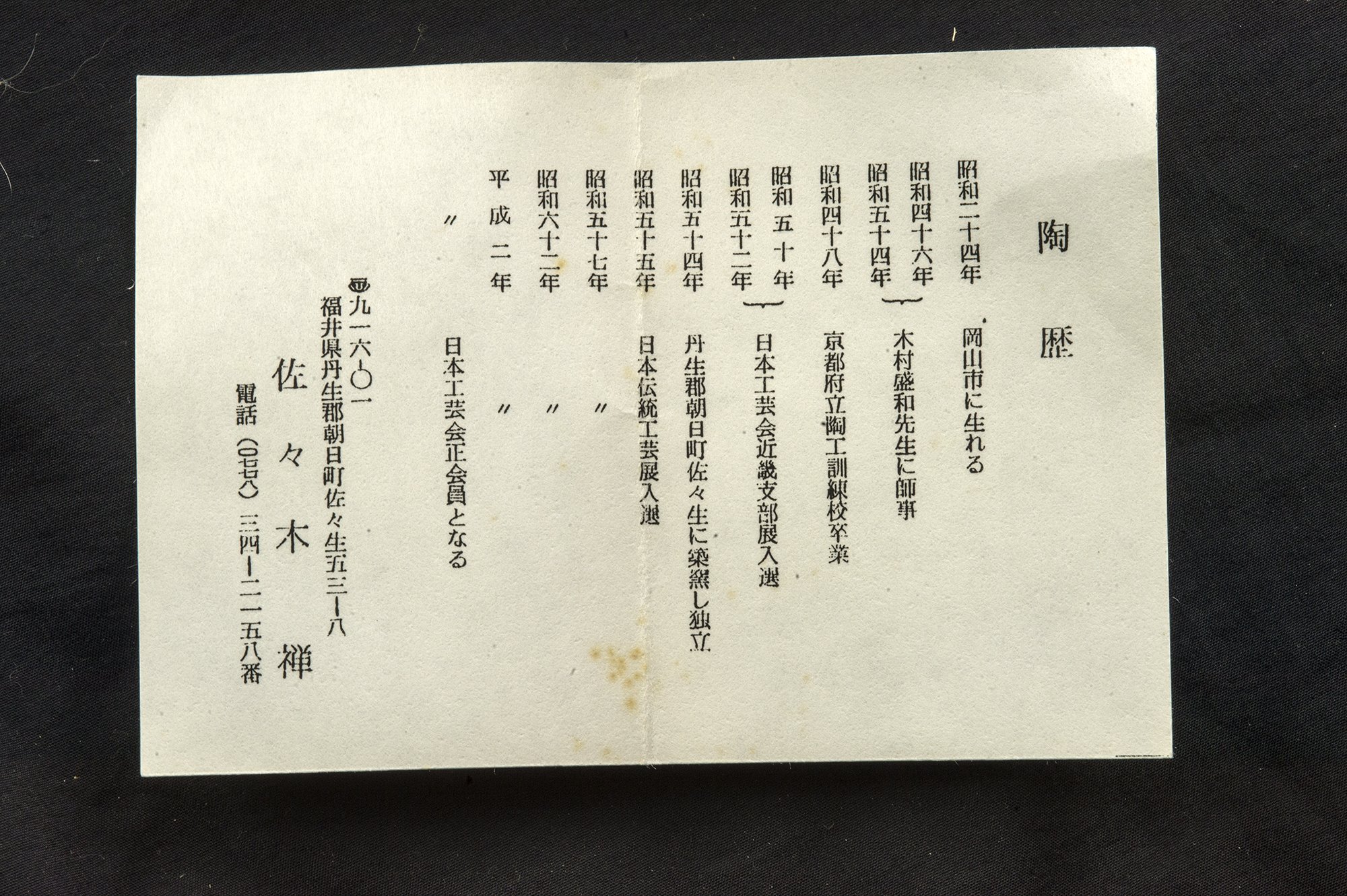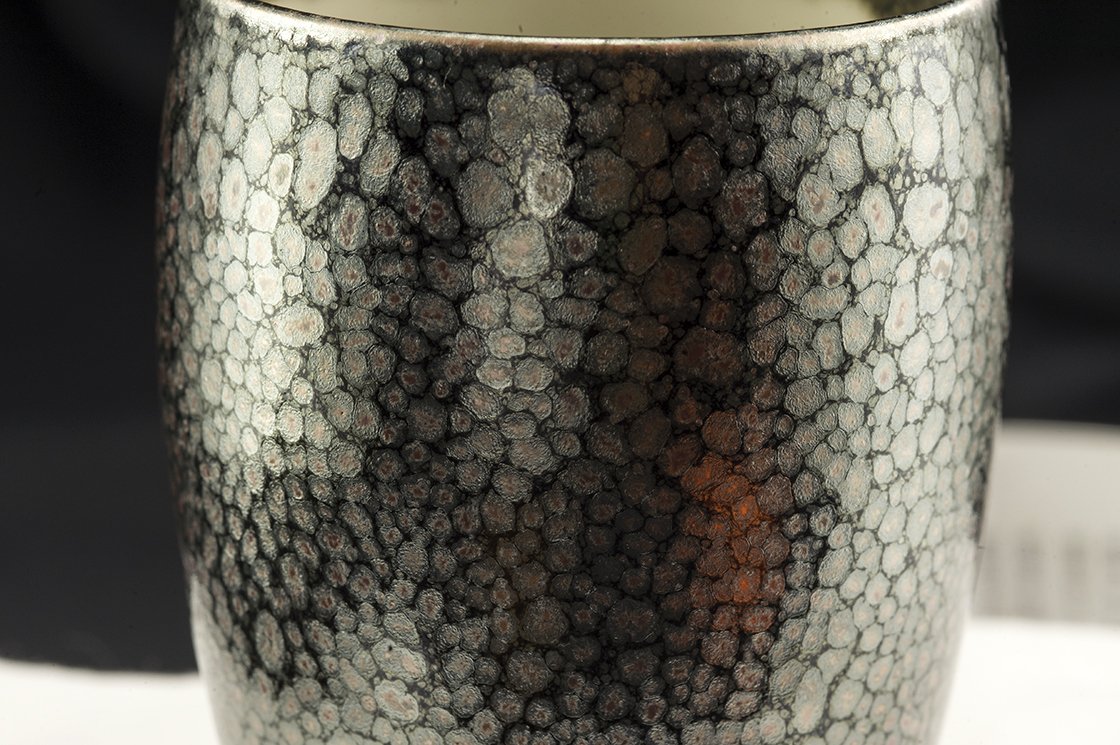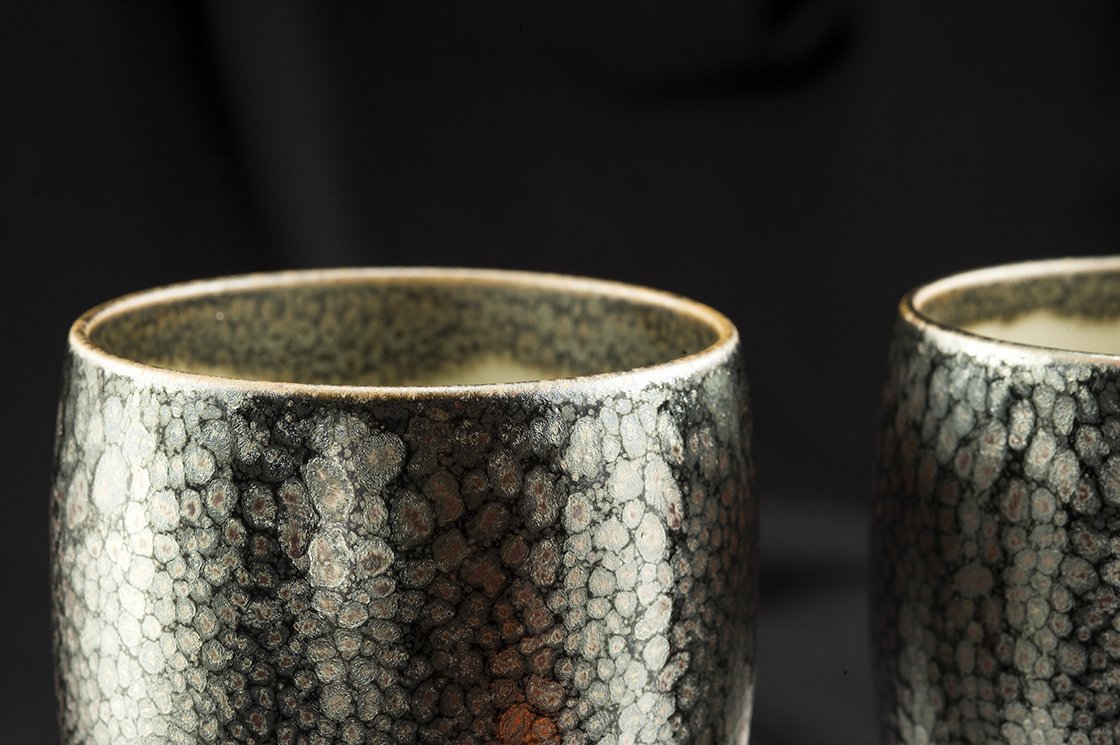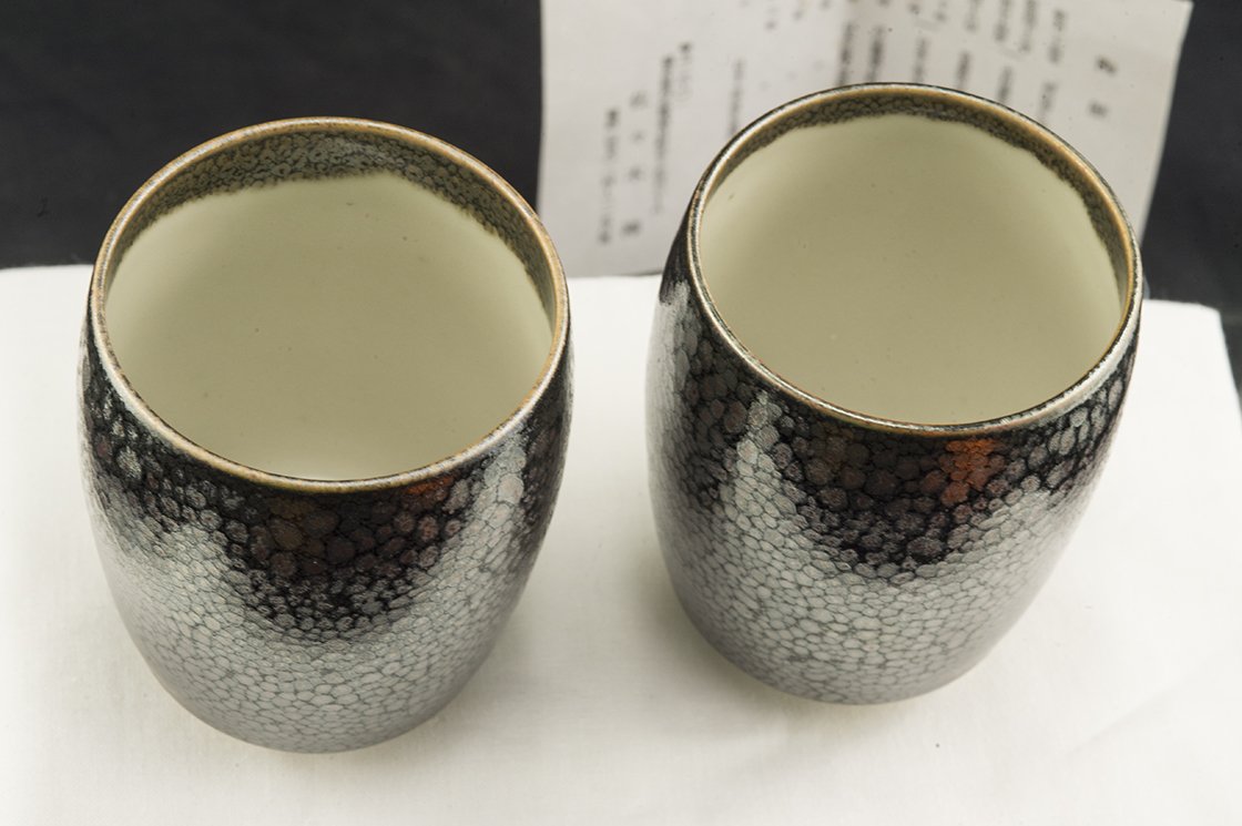 Rendszeres vendége és díjazottja a különféle kézműves kiállításoknak.  A csészepár a fémes juteki tenmoku máz gyönyörű példája. Nem tévesztendő össze a manapság felbukkanó olcsó kínai utánzatokkal.