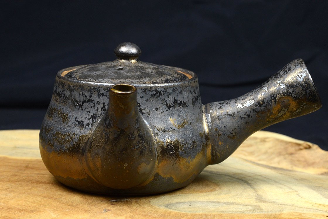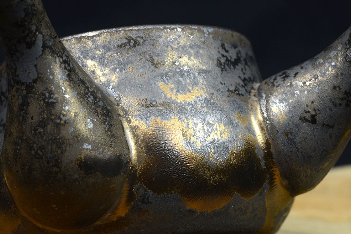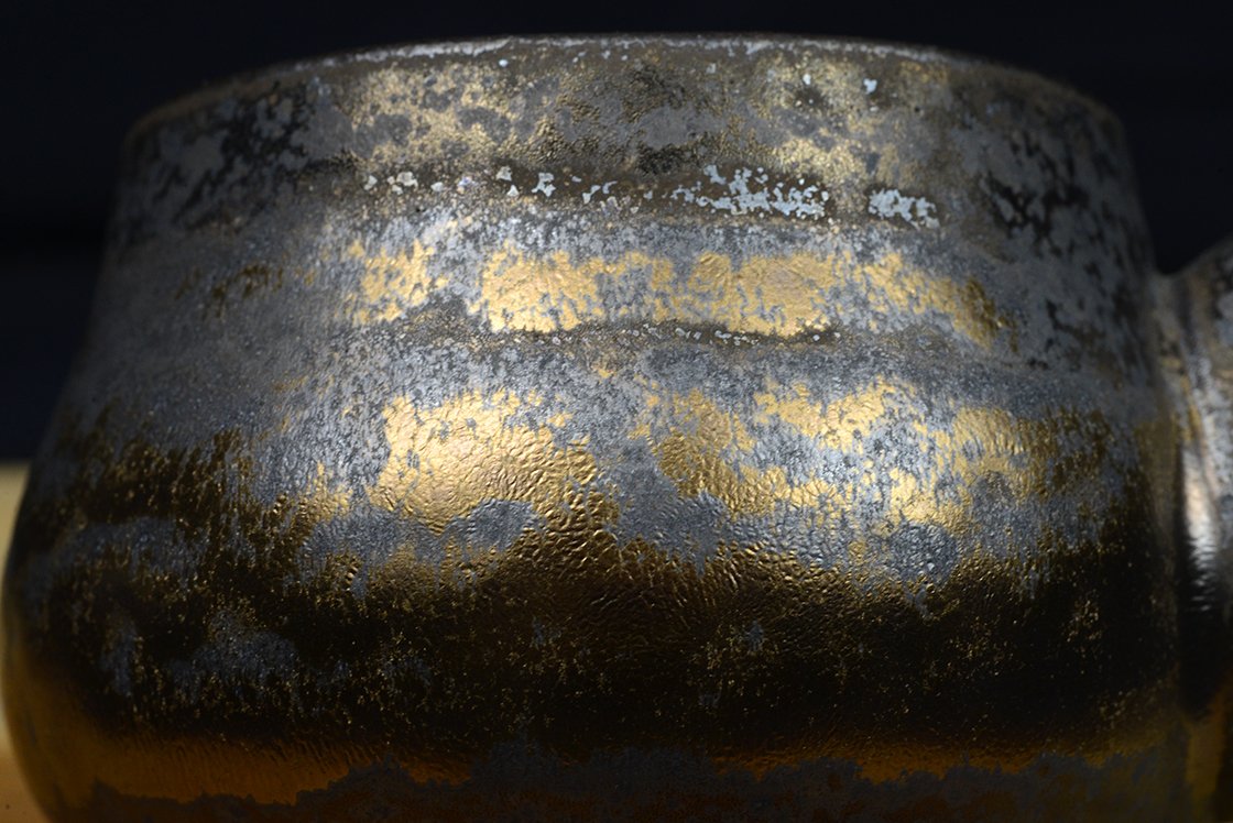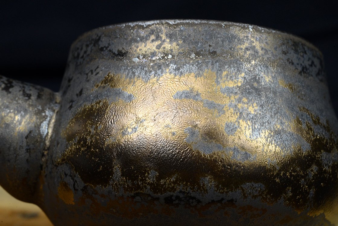 Az aranyfüst, a kopott fény iránti szenvedély mindenütt jelen van a japán művészetben, a kolostorok festményein, a vázák és csészék mázain, a szobrokon, a törések javításán. A „szent” arany a buddhista mitológiában is az istenek házát és hazáját díszíti. A meg-, fel-, és kivilágosodás ragyogó fénye, ami persze mindenütt kicsit használt, kicsit kopott. Ez itt egy Arita teáskanna, kívül arany, benne meg a zöld arany, ami átvilágítja és ébren tartja törékeny testünket.