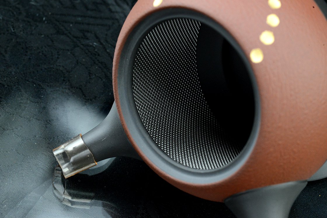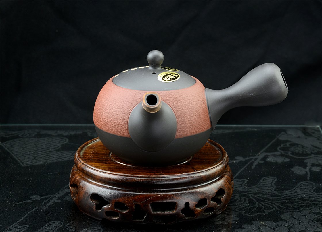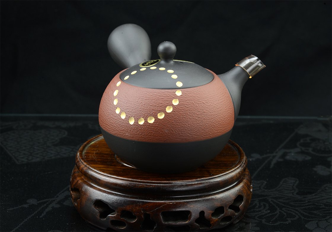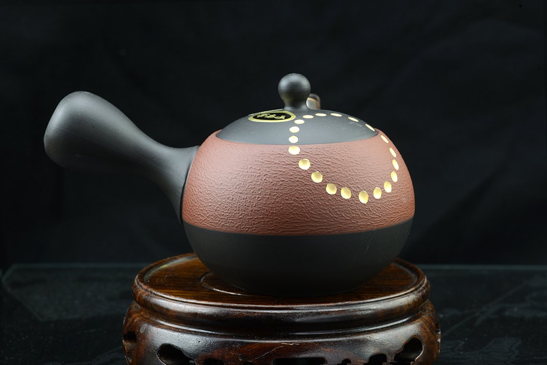 Gyöngyfüzér japán teáskannaGyöngyfüzér japán teáskannaKörülbelül 200 ml űrtartalmú remekbe szabott tokoname teáskanna.  A mázatlan kétszínű testen a dekoráció egy gyöngyfüzért, vagy talán az égen körbevándorló Holdat idézi.