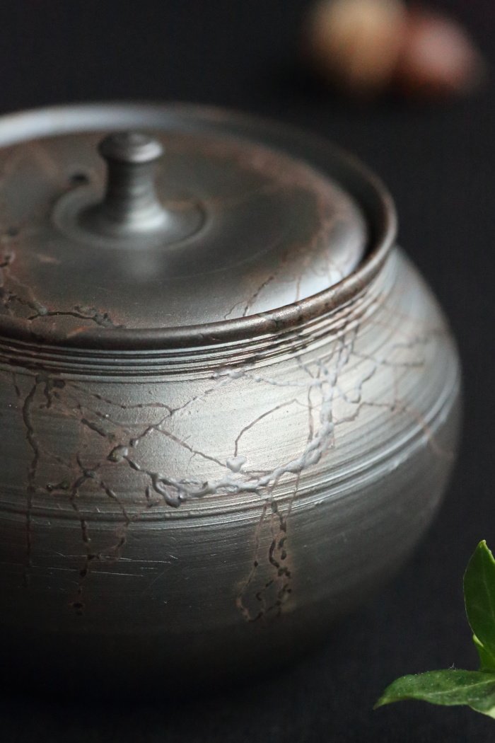Teljesen kézzel készített Tokoname teáskanna Yutaro Yamada műhelyéből, aki fiatal kora ellenére már sikerrel hívta fel magára a figyelmet és keresett a gyűjtők között is. Rendesen 4 – 5 különféle agyagot használ, itt fekete agyagon, tengeri alga sóival égetett mintázatú kannát láthatunk. A kanna 10,9 cm széles, 9.6 cm magas a fedél átmérője 3.2 cm, a test átmérője 7,1 cm. Yutaro Yamada Tokonamében született és az Aichi Prefektúra Tokoname Főiskola művészeti szakán és a Daido Egyetem Mérnöki karán szerzett diplomát, majd a Tokoname Tonomori Kerámiaművészeti Intézetben fejezte be tanulmányait.